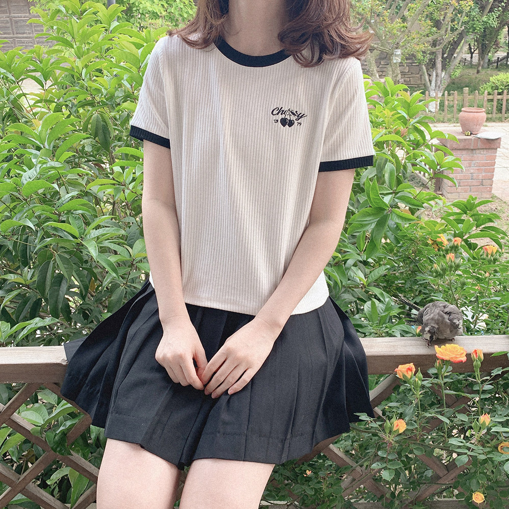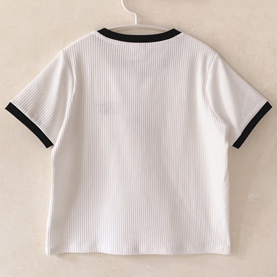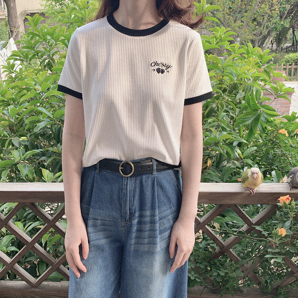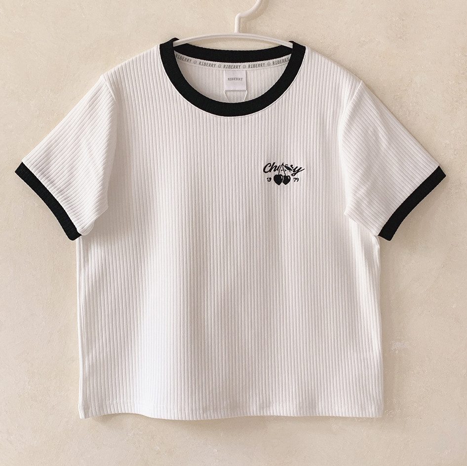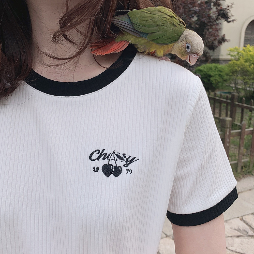 Вышитая черная вишня, правое плечо, эластичные полоски, универсальная, черно-белая контрастная футболка с круглым вырезом и короткими рукавами U