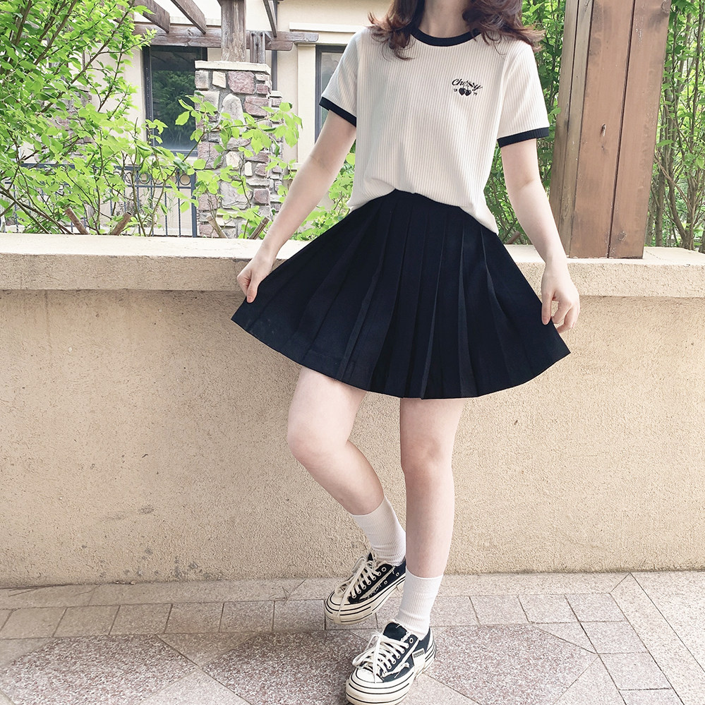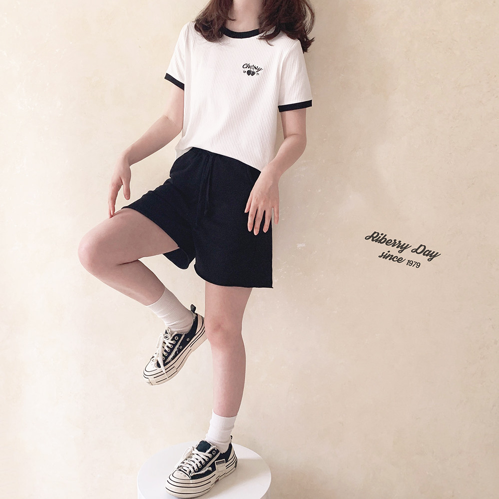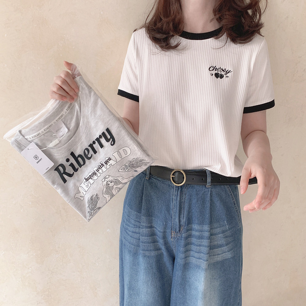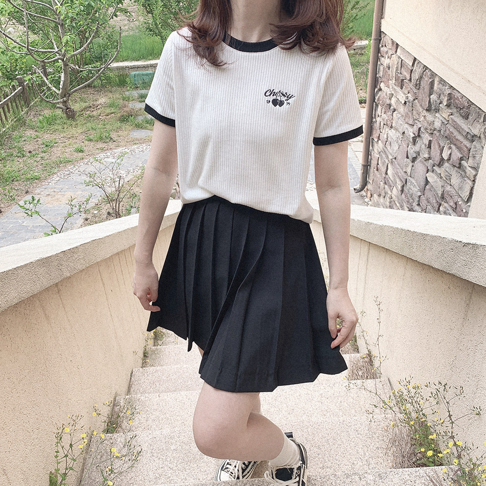 Вышитая черная вишня, правое плечо, эластичные полоски, универсальная, черно-белая контрастная футболка с круглым вырезом и короткими рукавами U