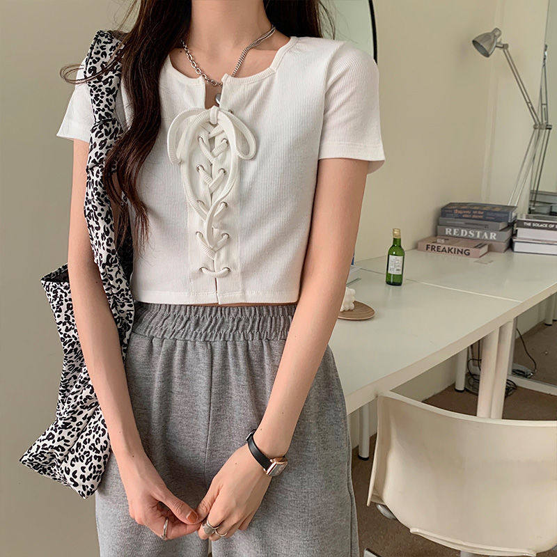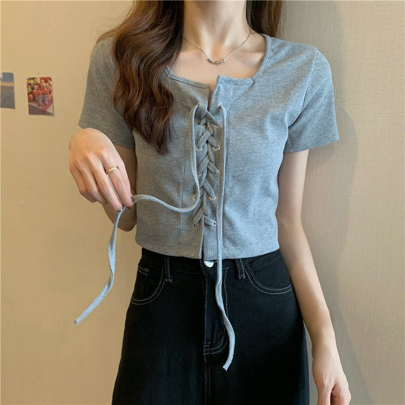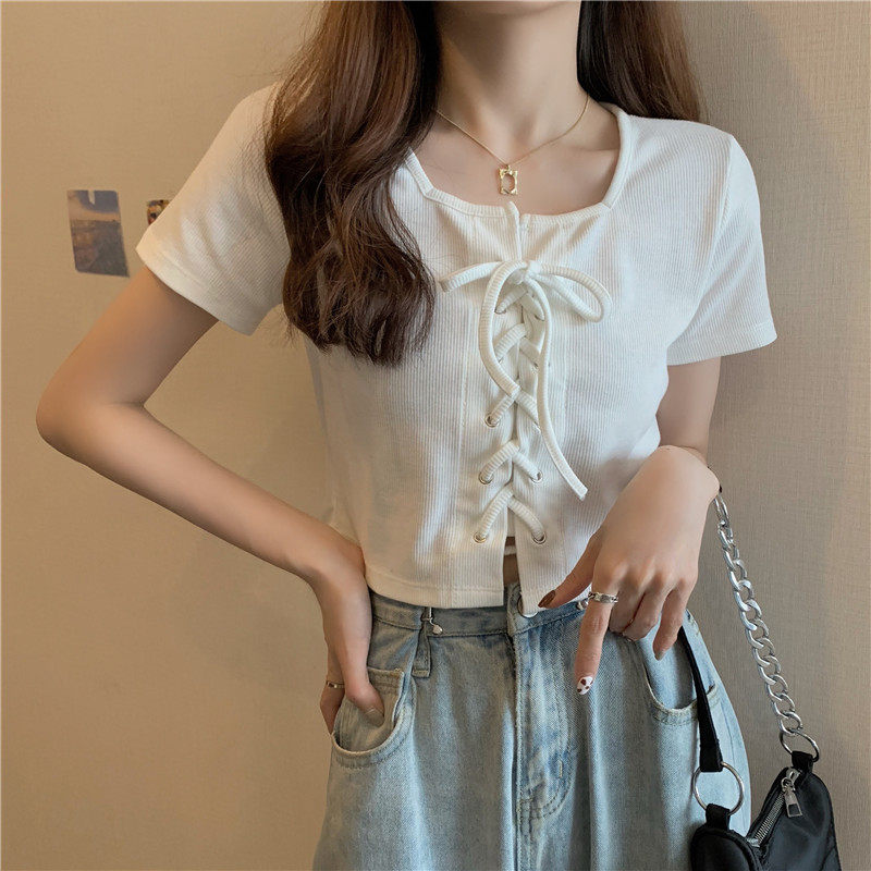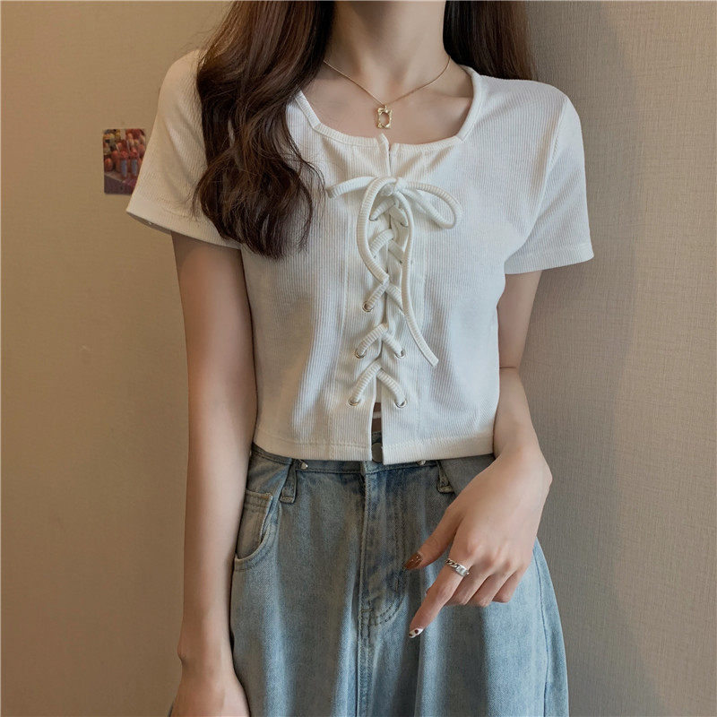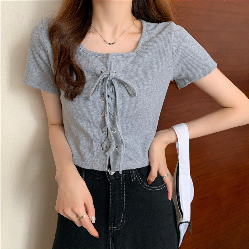 Короткая черная летняя базовая приятная телу брендовая футболка, короткий рукав, квадратный вырез, по фигуре