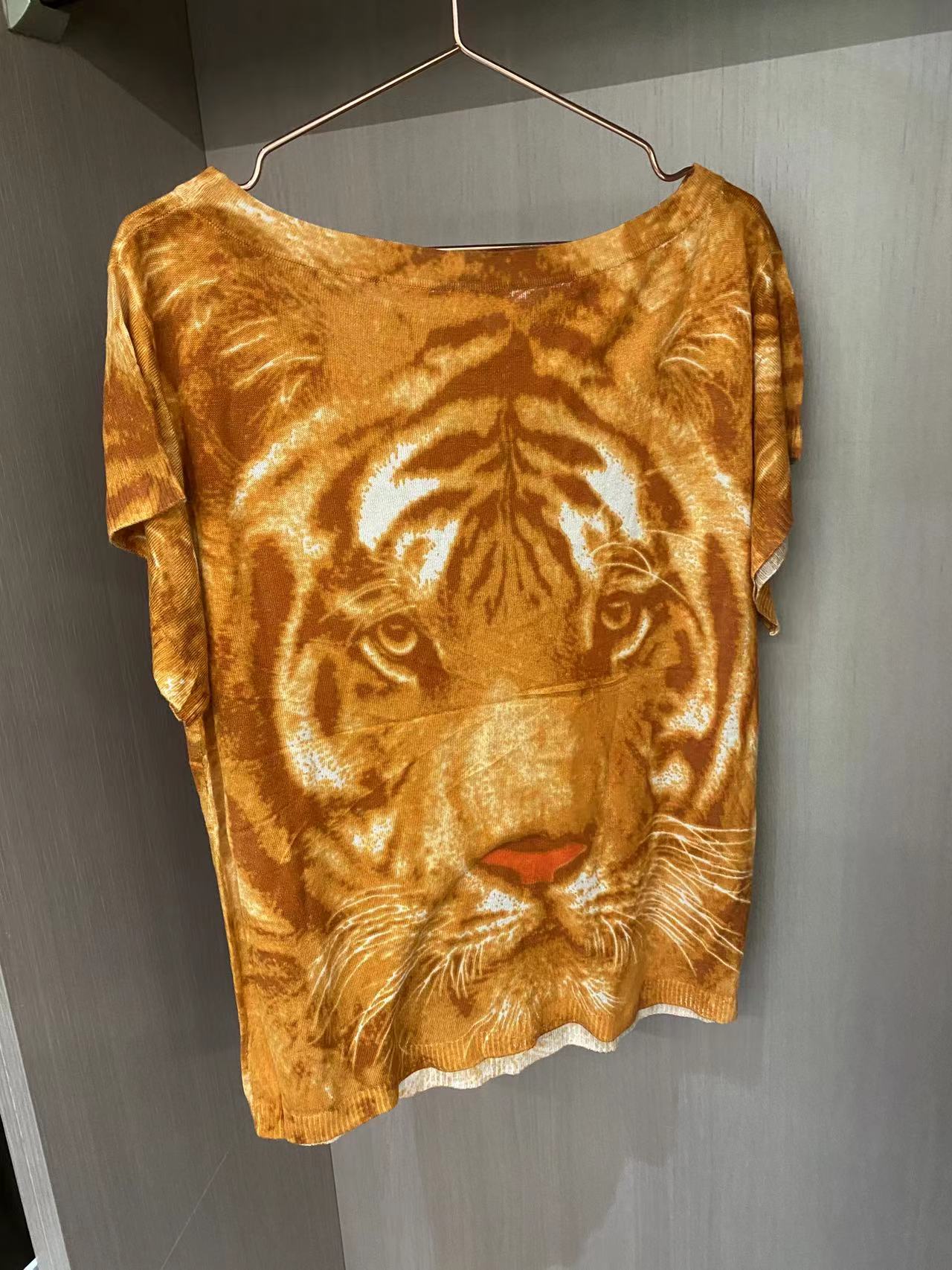 J22 [57 Живое благосостояние] Шелковое -блюдо коротко -липальное верхнее принт Tiger Print T -Finding Рубашка