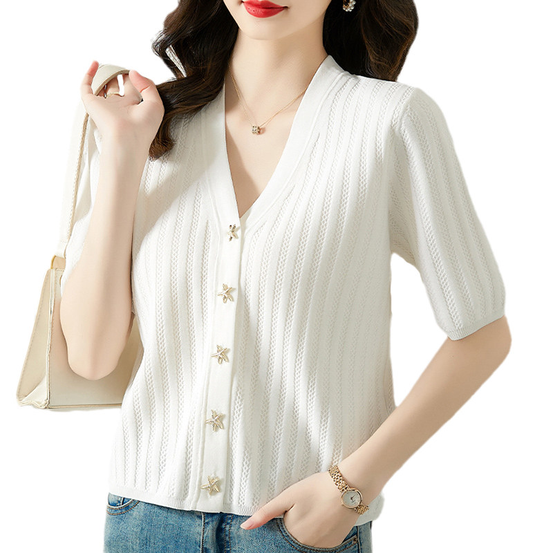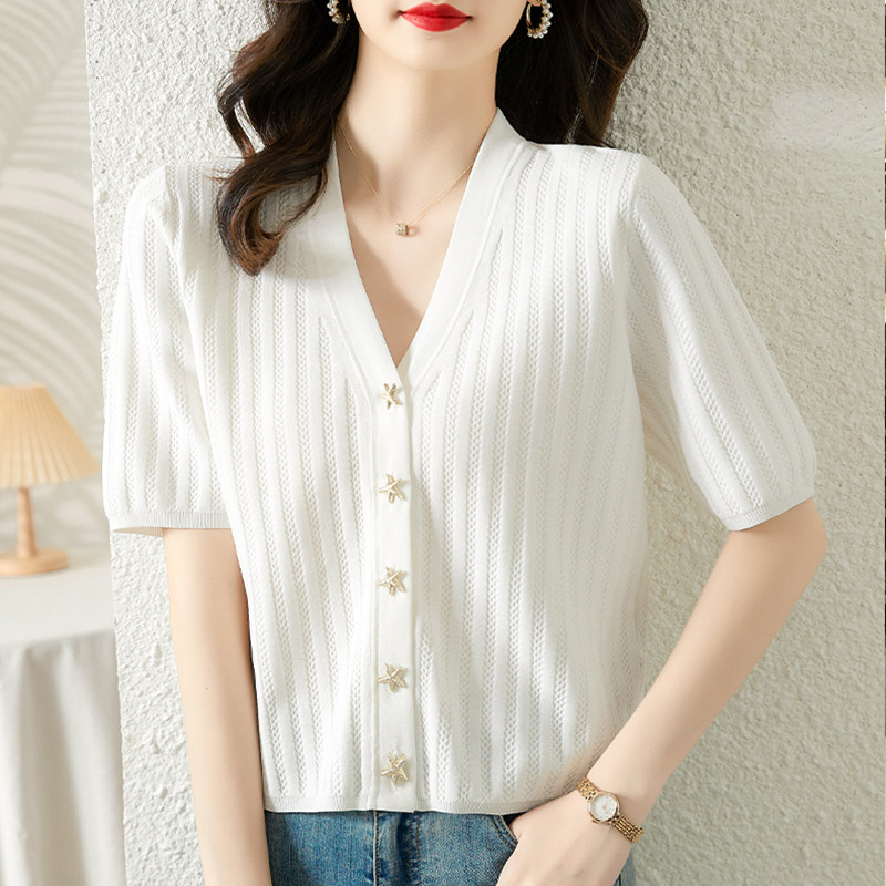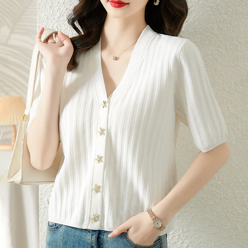 Трикотажная летняя футболка с коротким рукавом, белая летняя одежда, V-образный вырез
