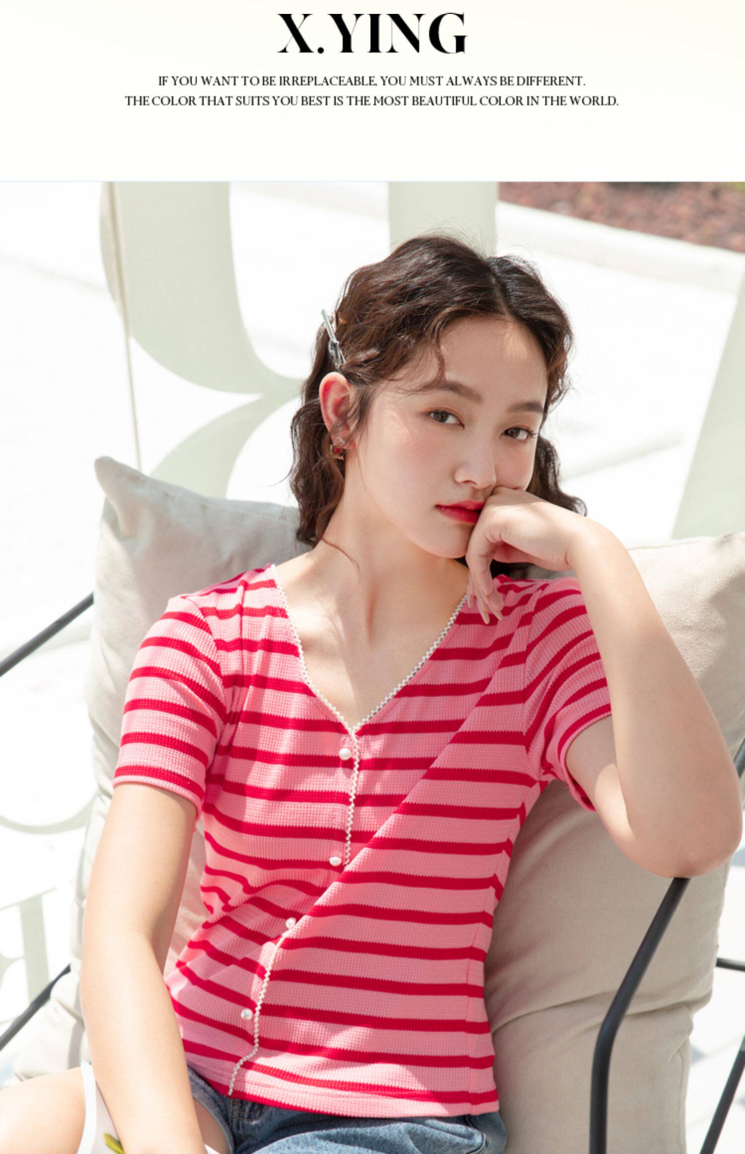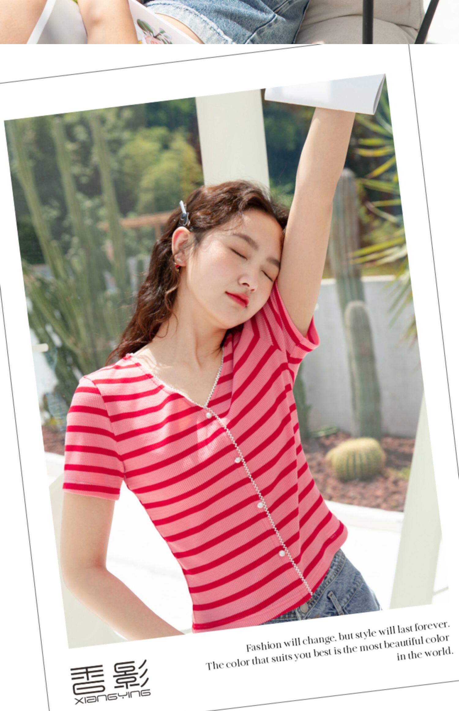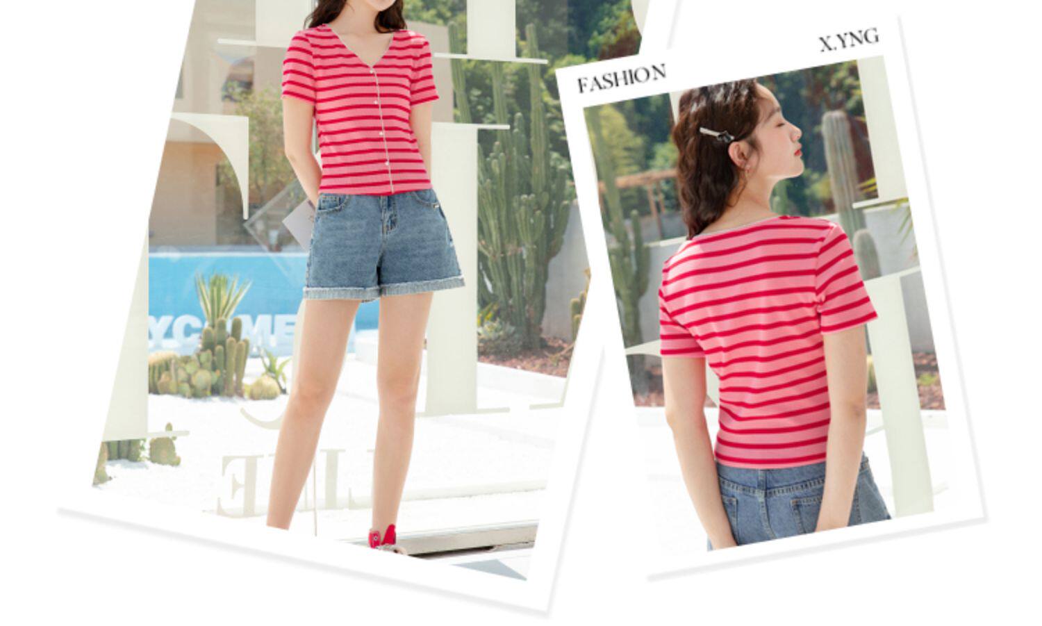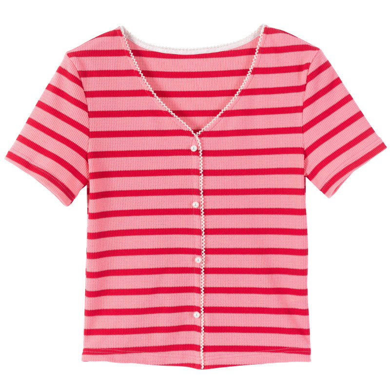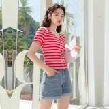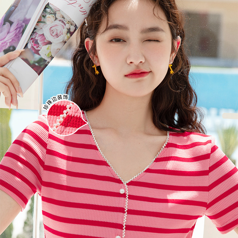 Красная трикотажная летняя дизайнерская короткая футболка, короткий рукав, тренд сезона, V-образный вырез