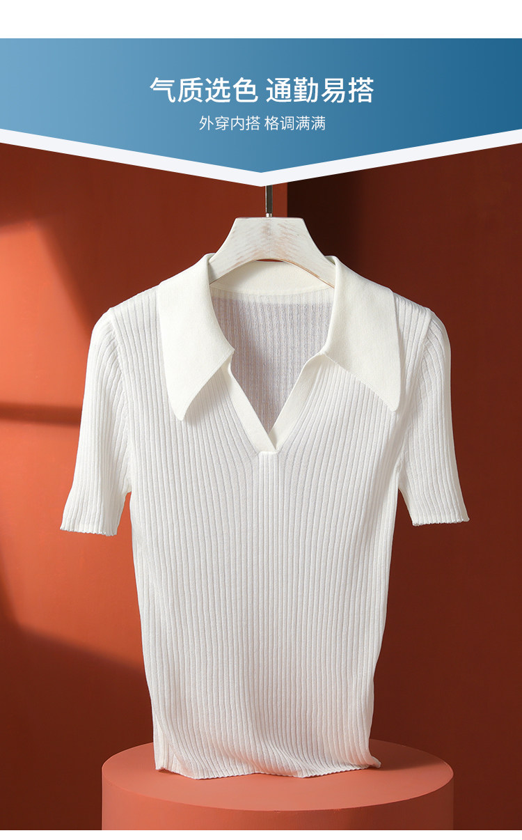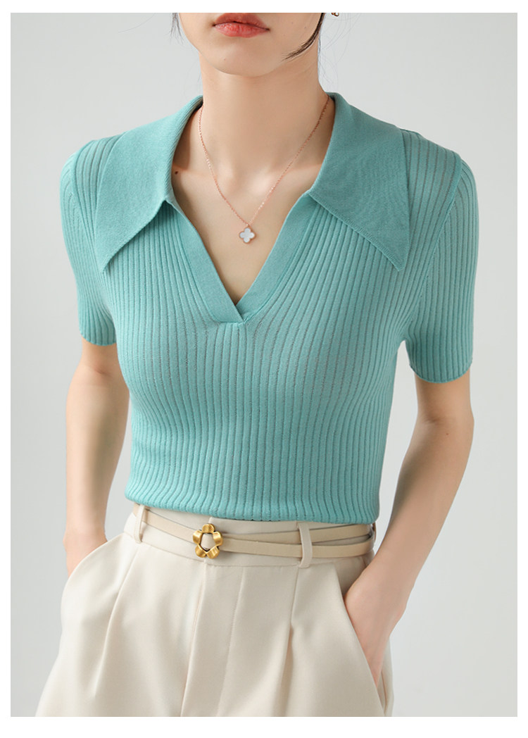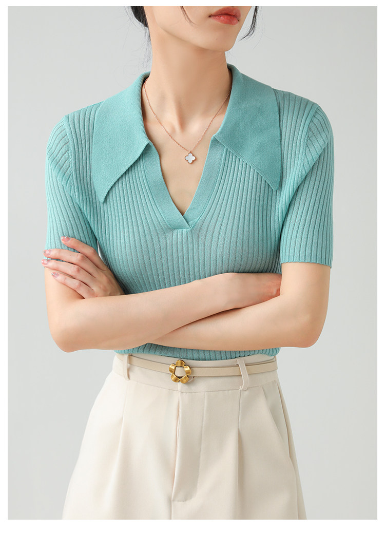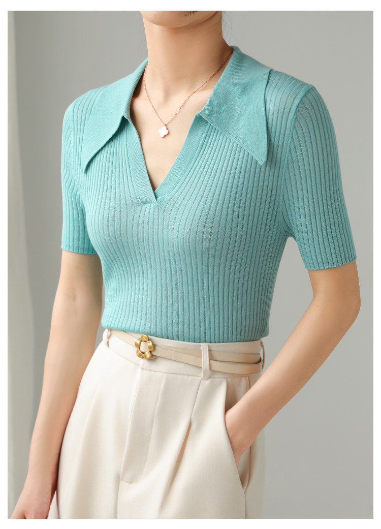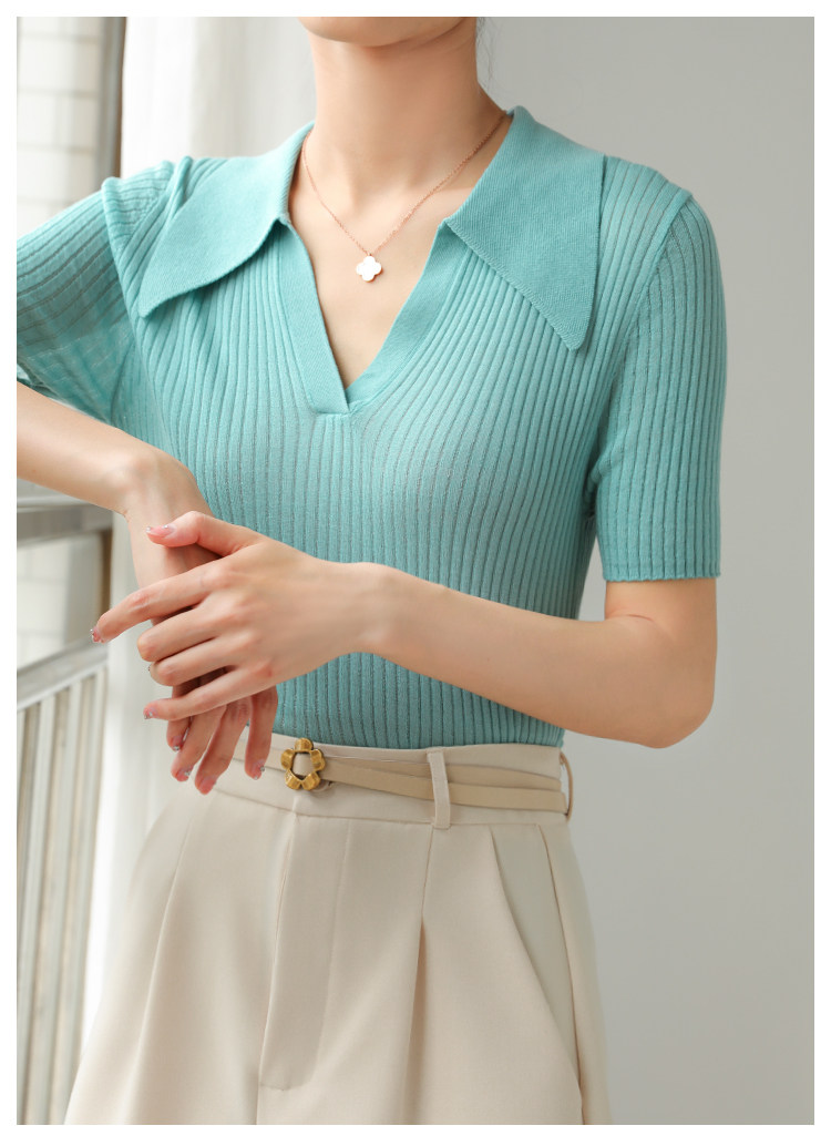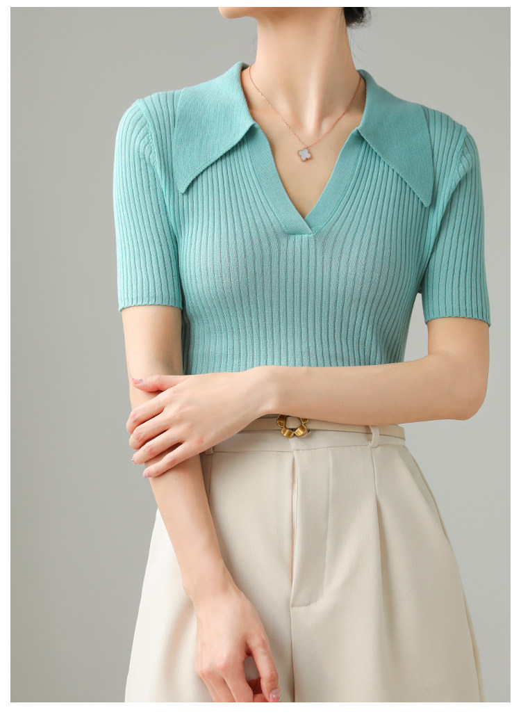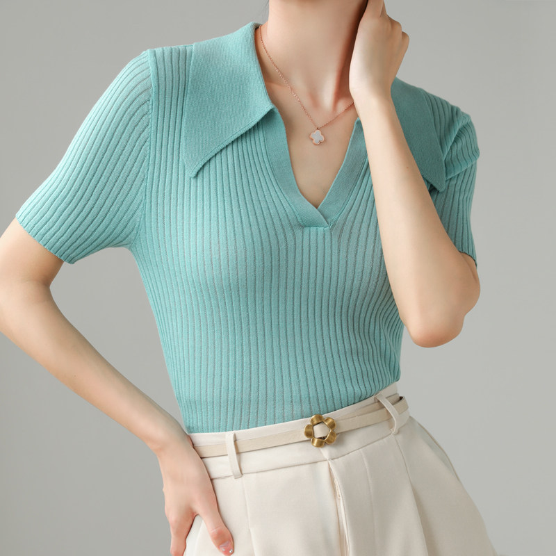 Тонкий трикотажный летний свитер, футболка, воротник поло, яркий броский стиль, короткий рукав, подходит для подростков