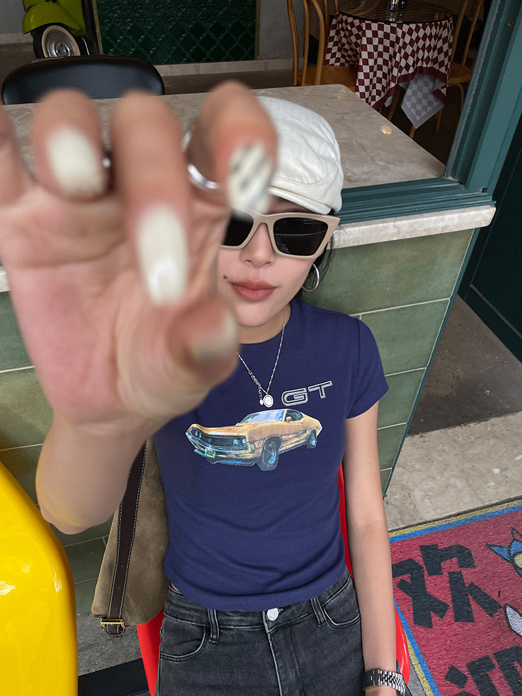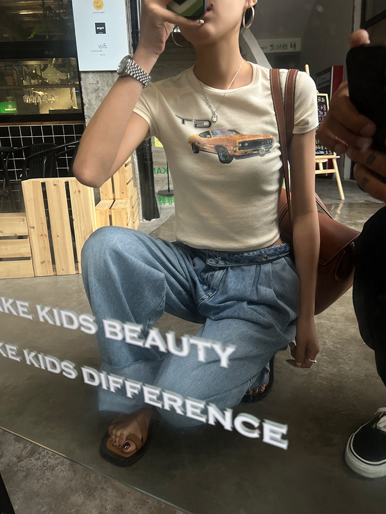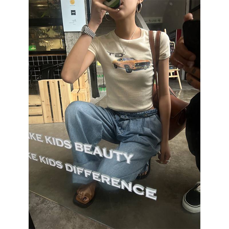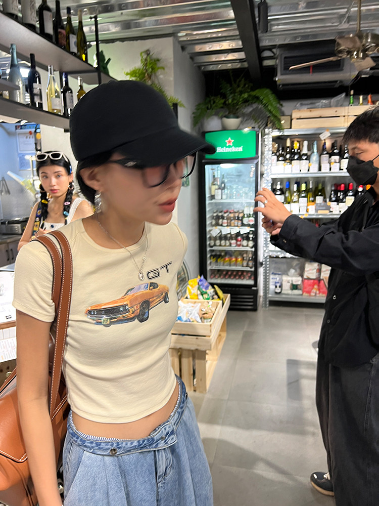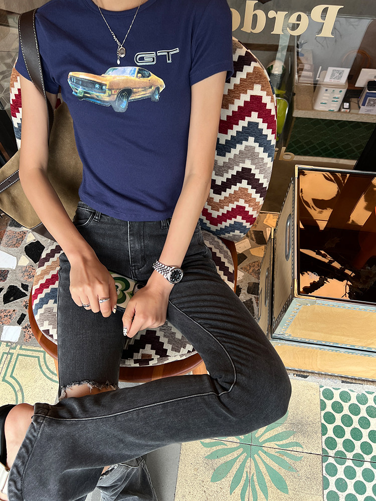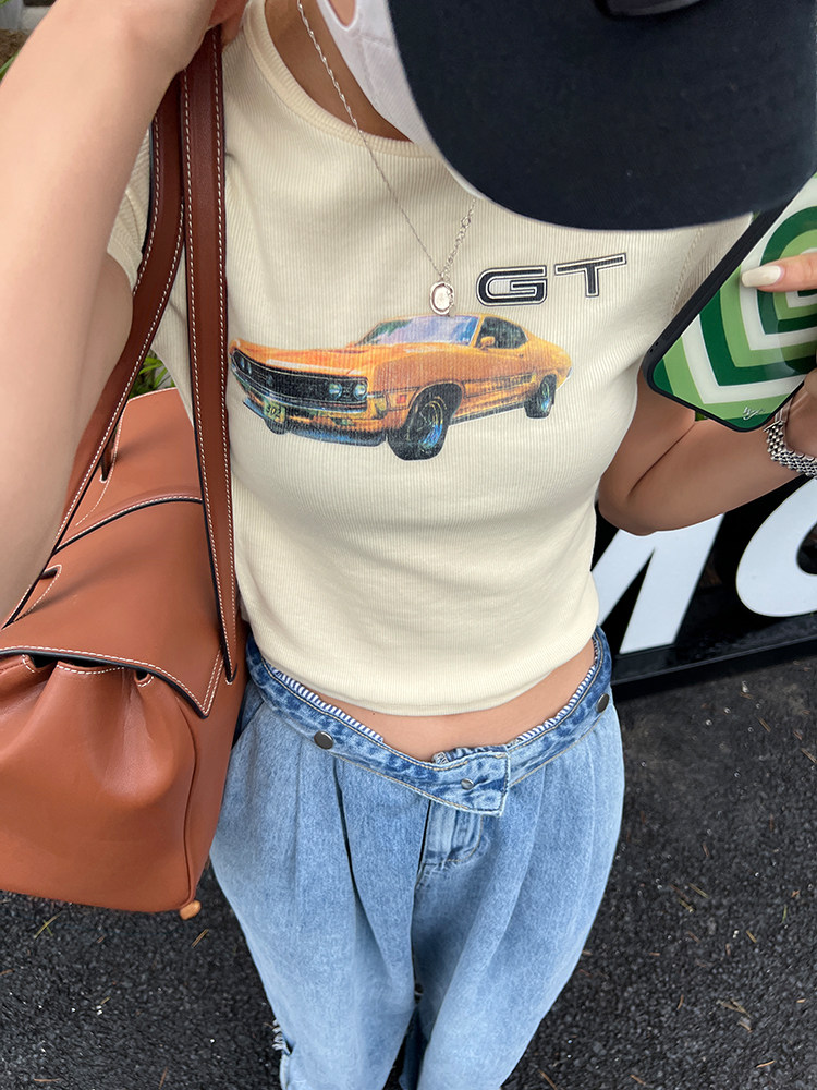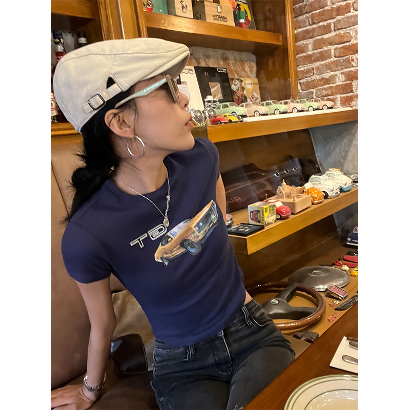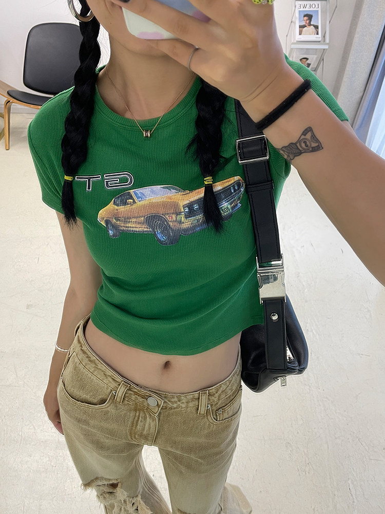 Ретро короткая футболка с круглым воротником, в американском стиле, облегающий крой