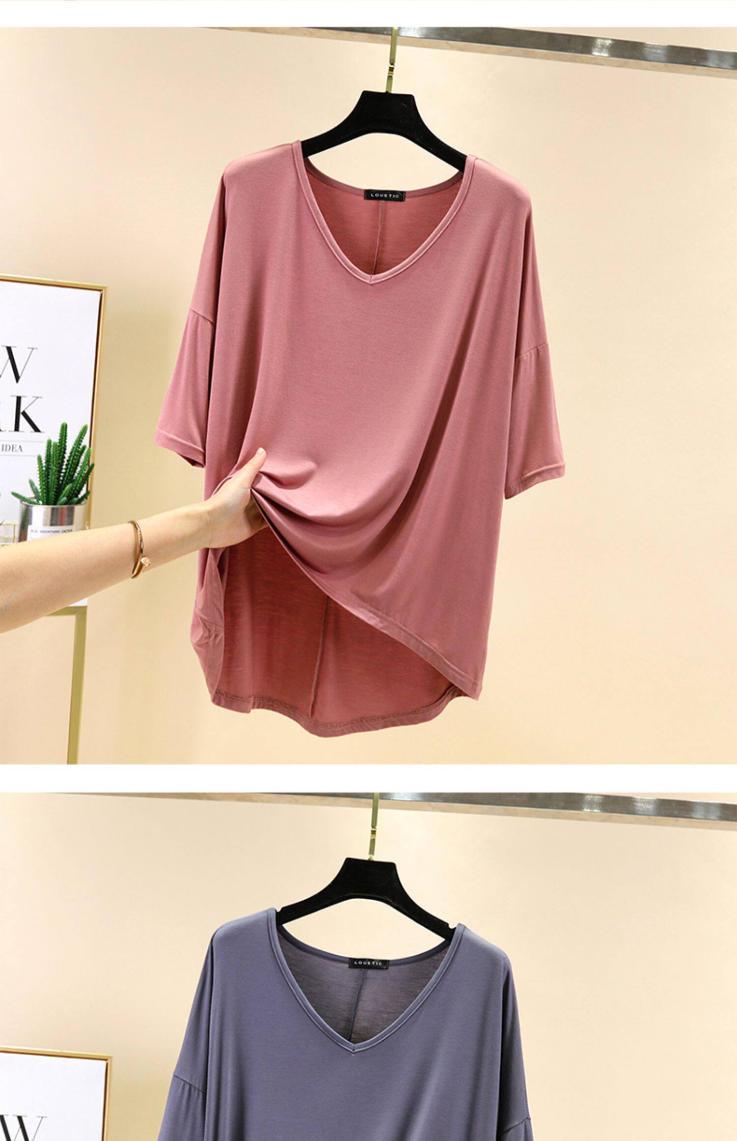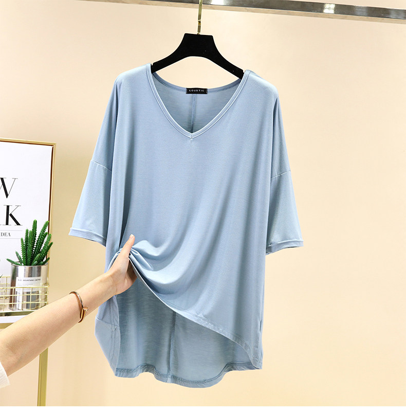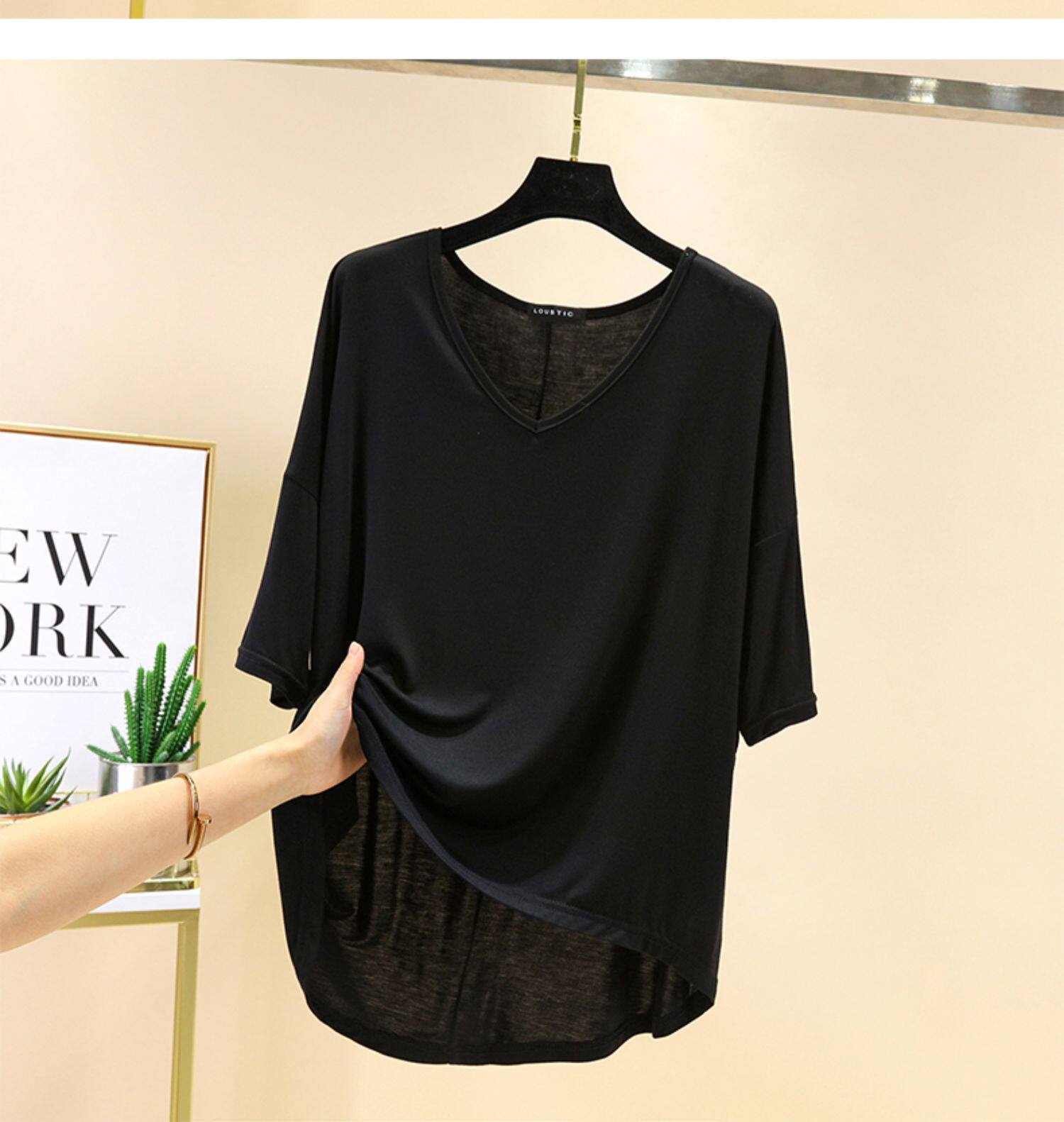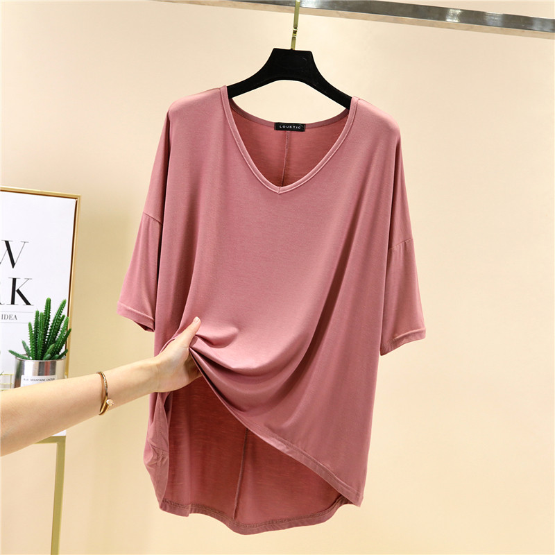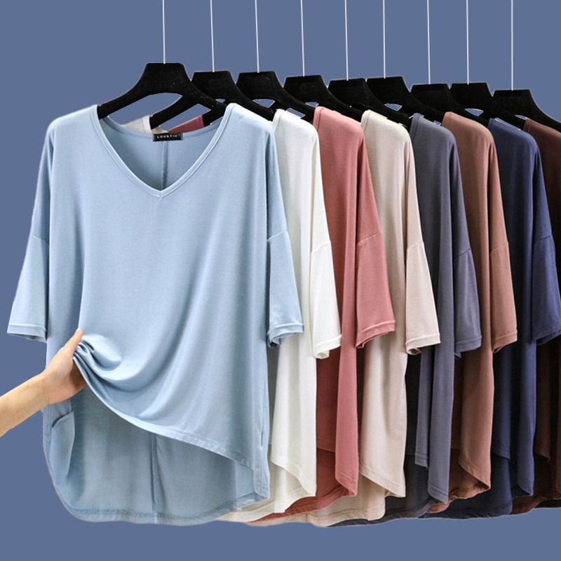 Тонкая базовая приятная телу цветная футболка с коротким рукавом, короткий рукав, V-образный вырез, большой размер