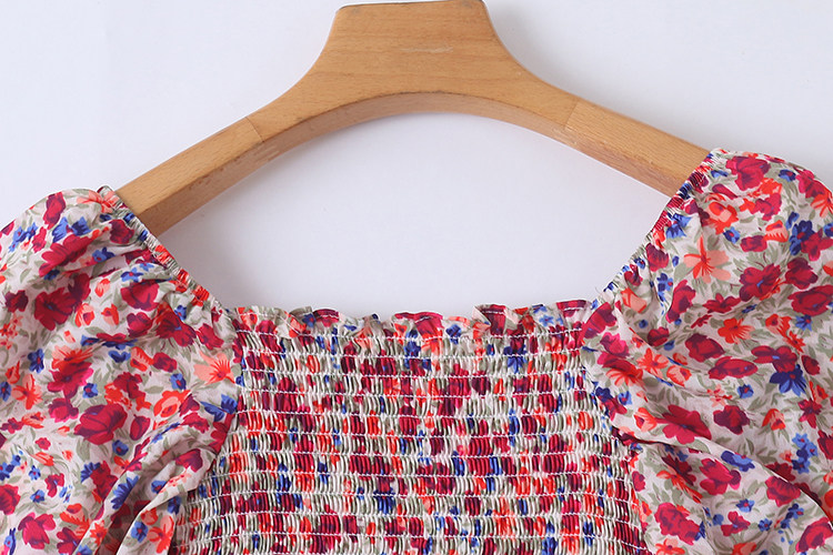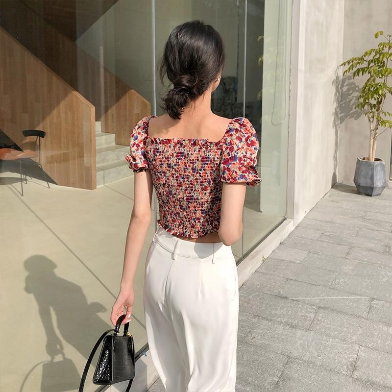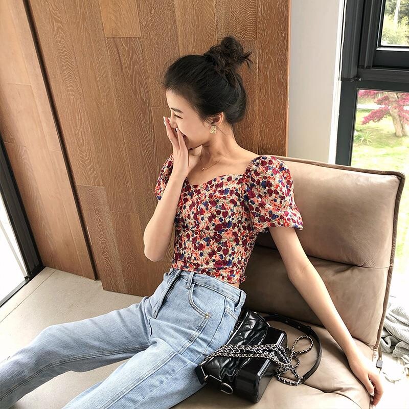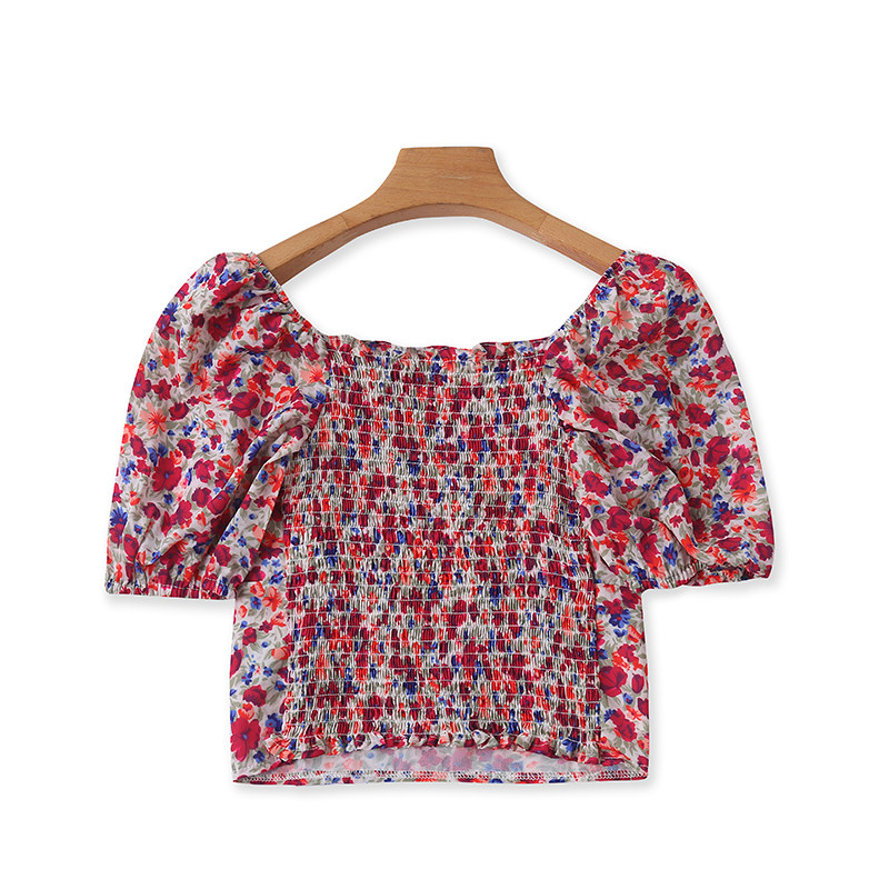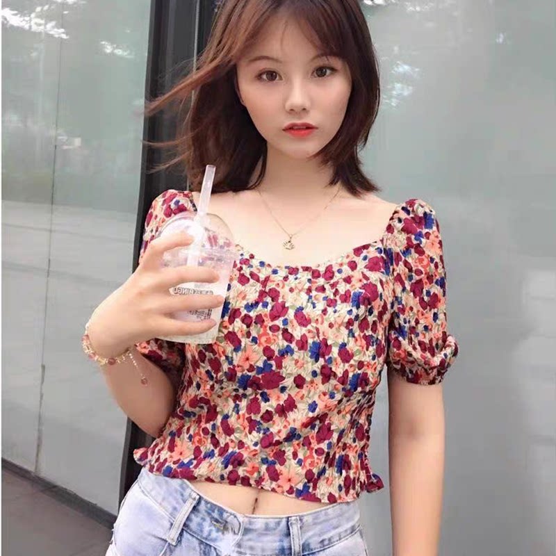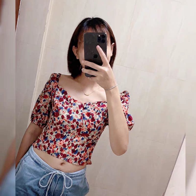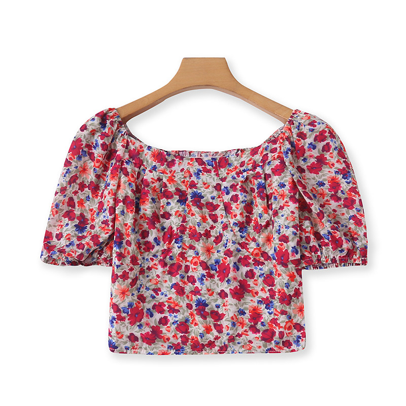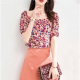 Квадратный воротник цветочный шифоновый короткая рубашка, новый летний стиль, универсальный женский пуловер с короткими рукавами H/6-2