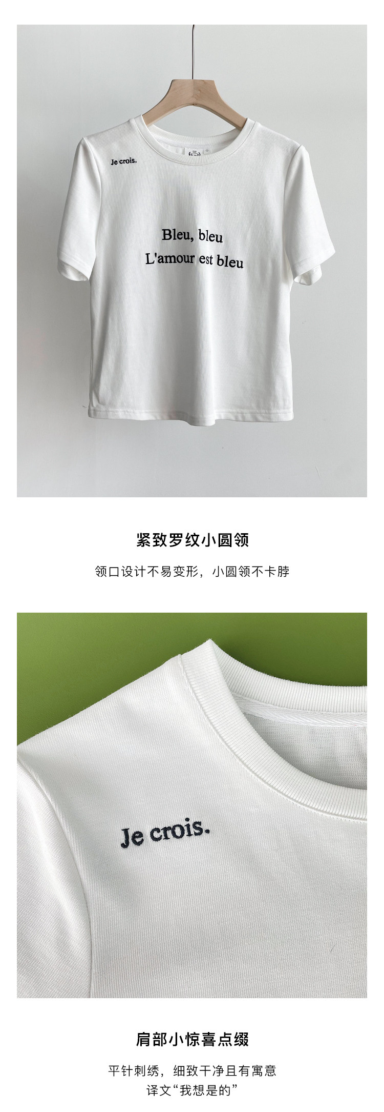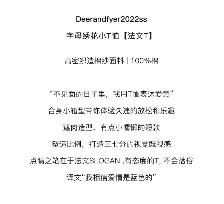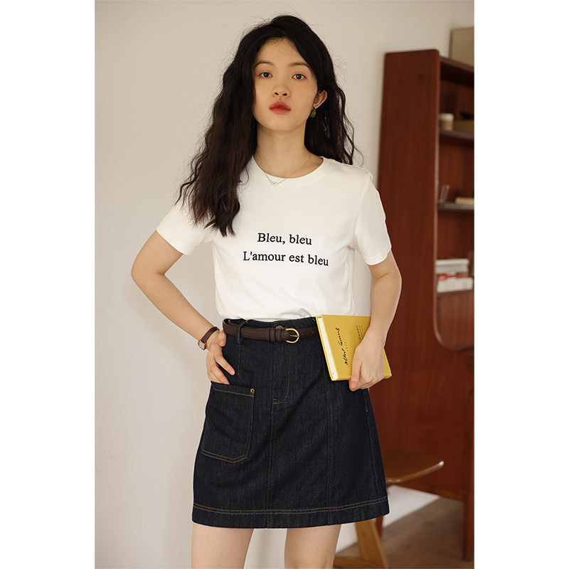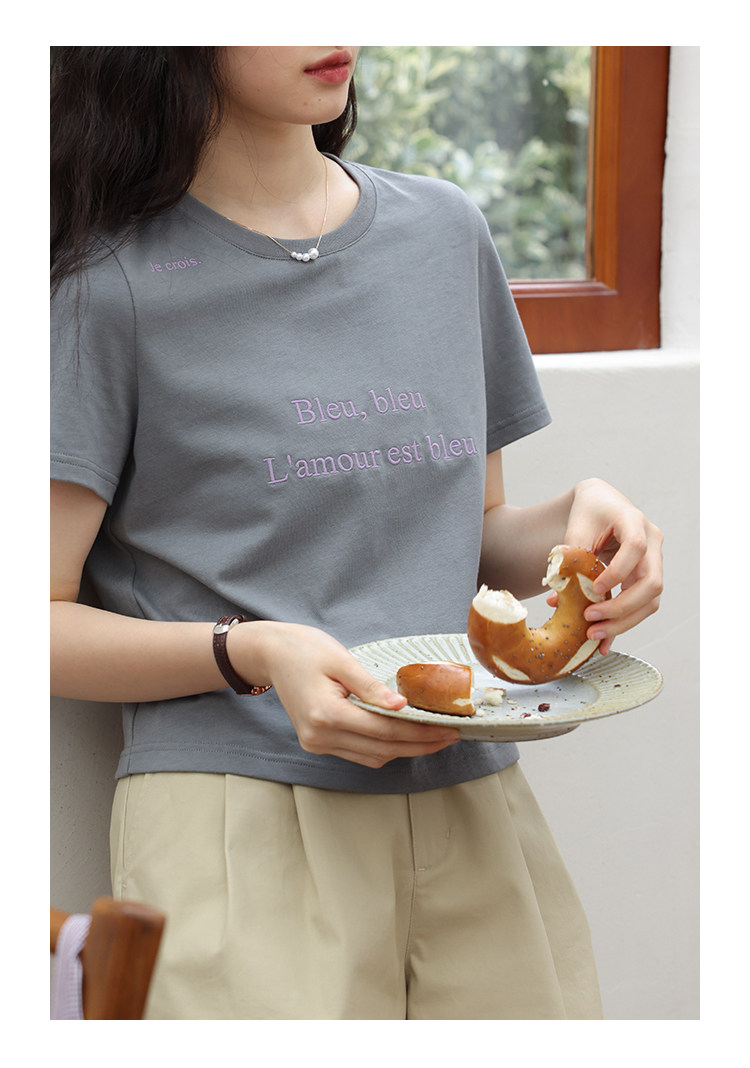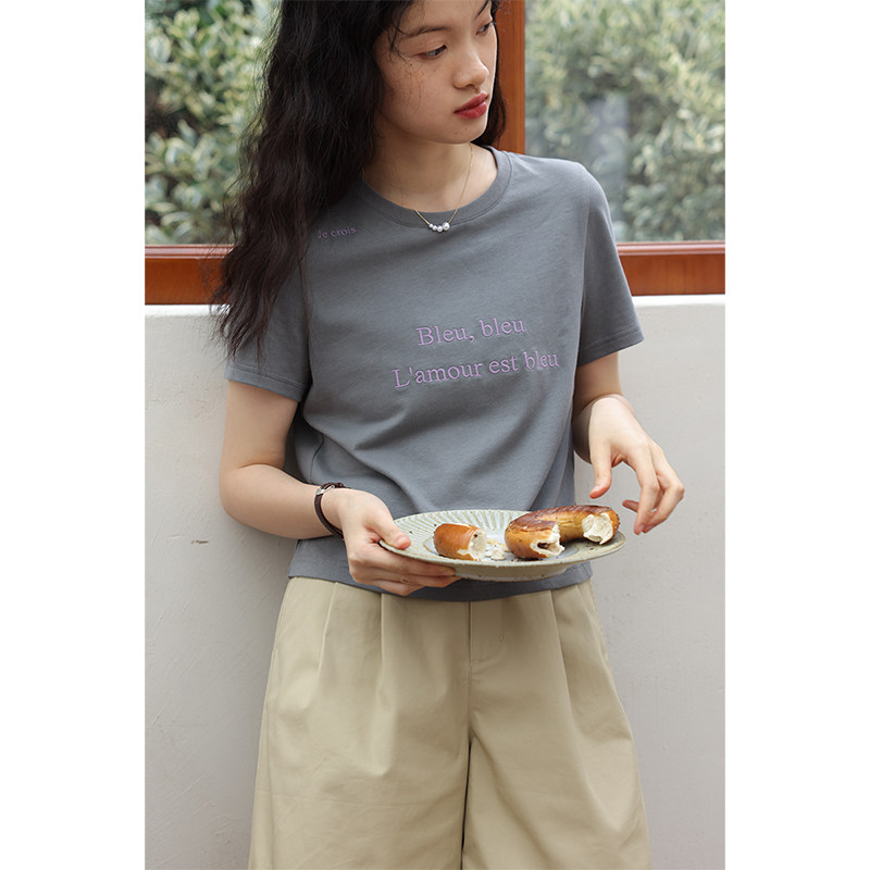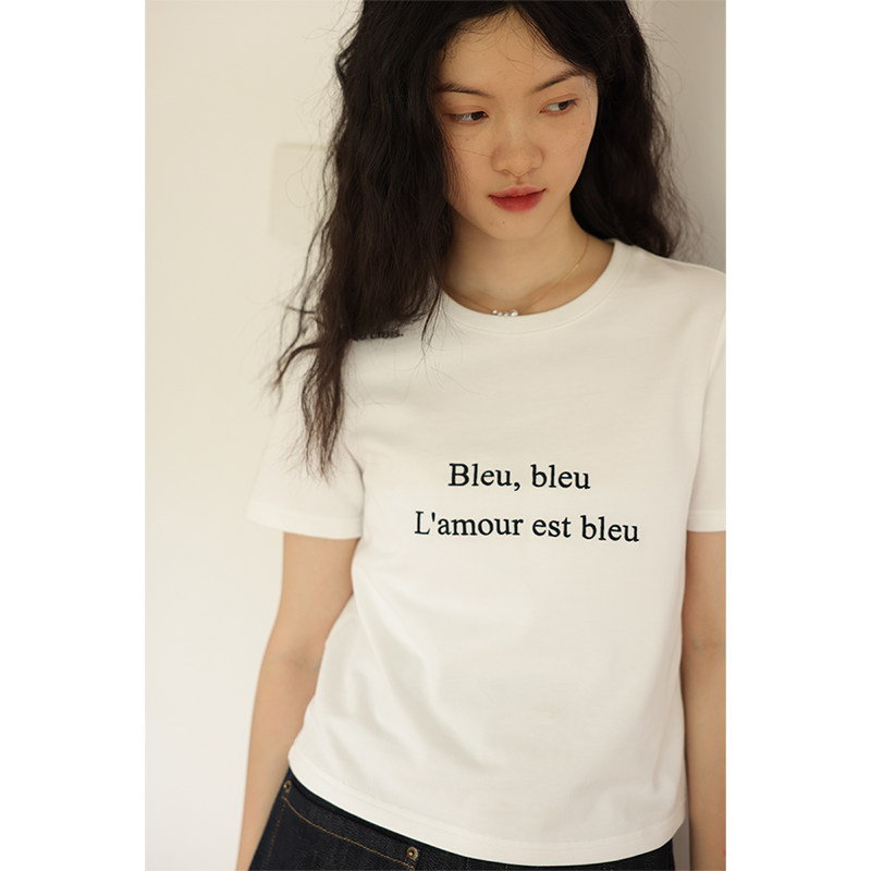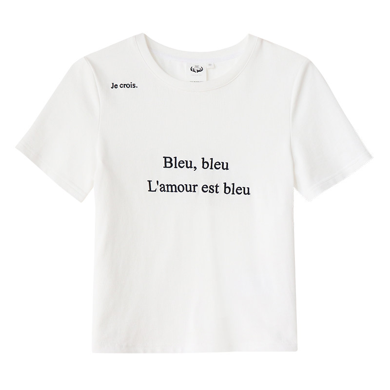 鹿与飞鸟 Короткая облегающая хлопковая футболка с вышивкой и плоской строчкой, круглый вырез [французская футболка] 4455