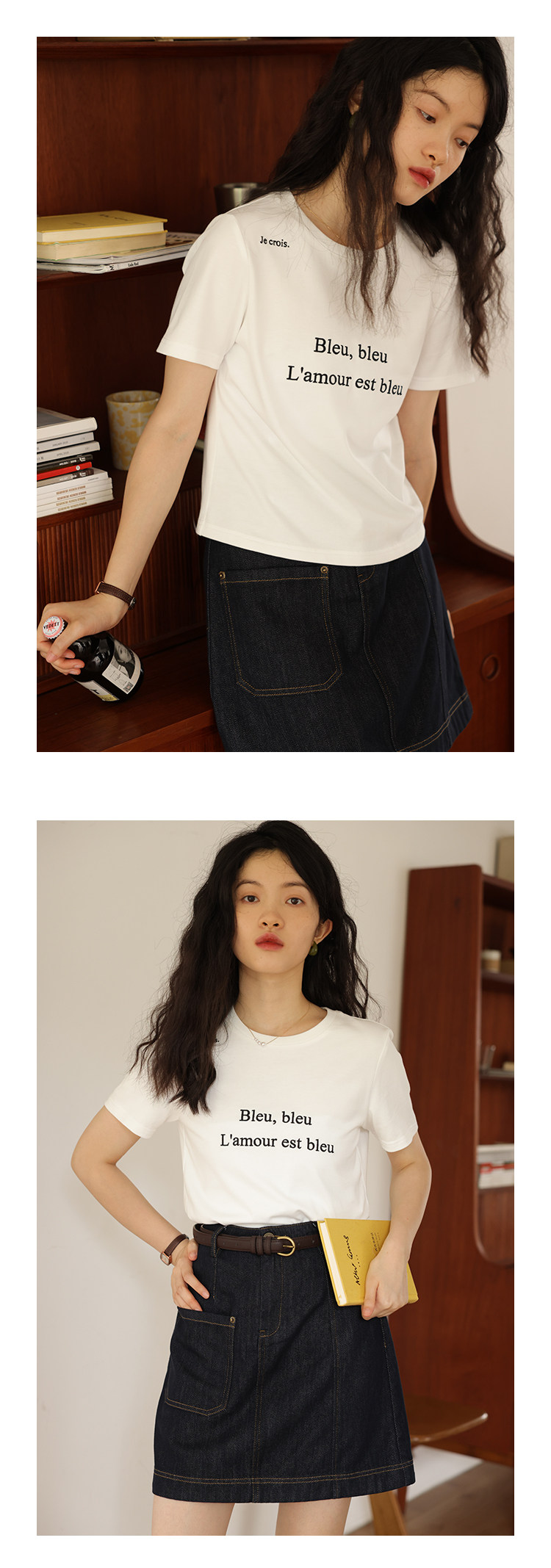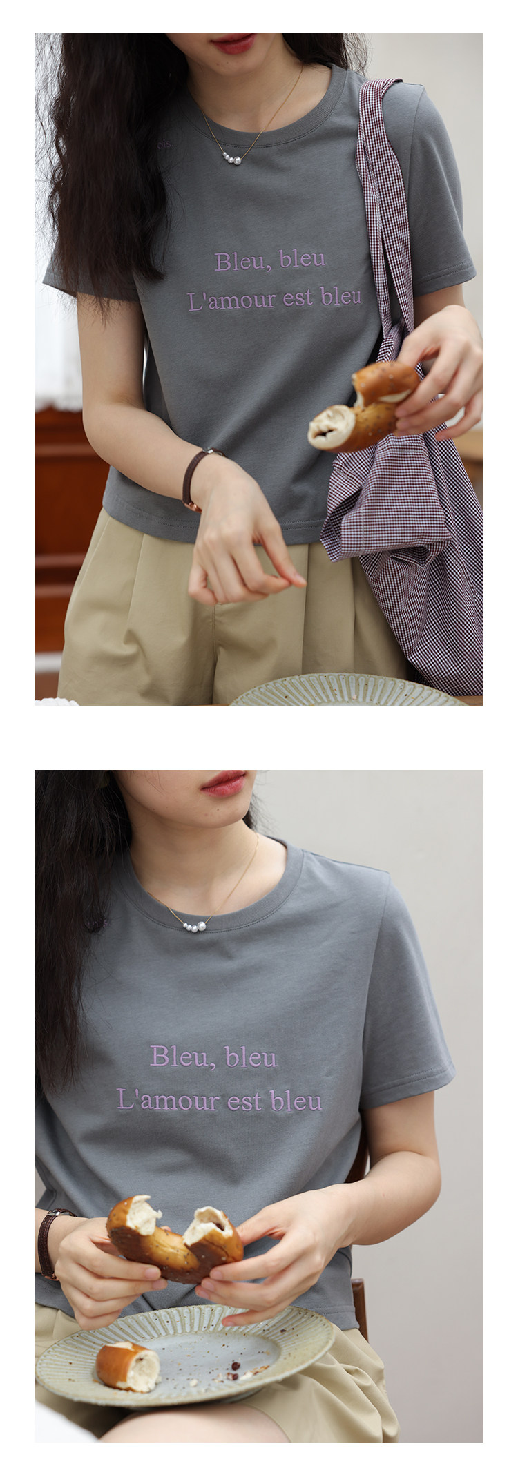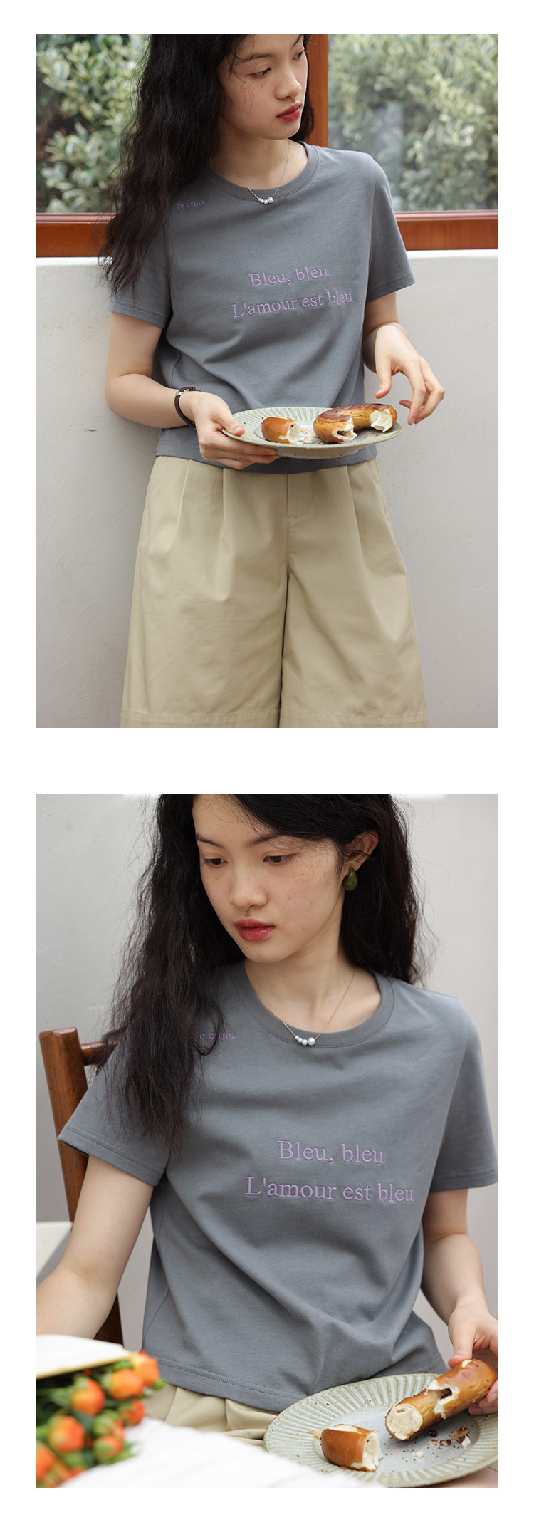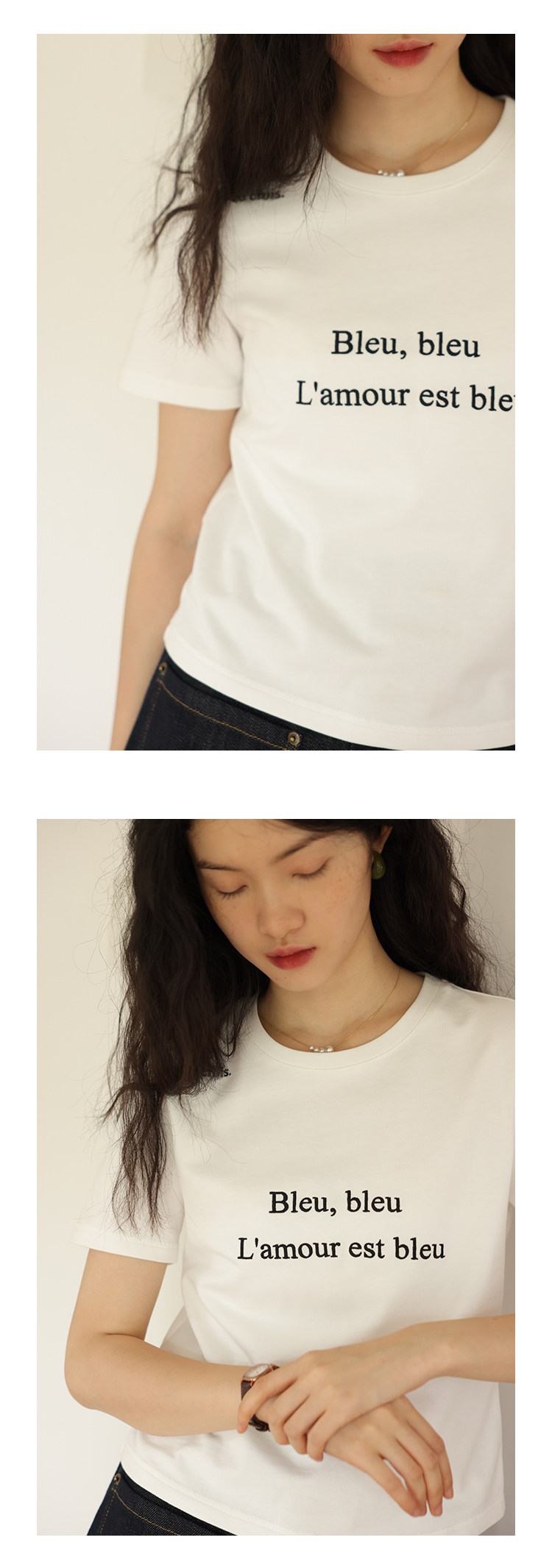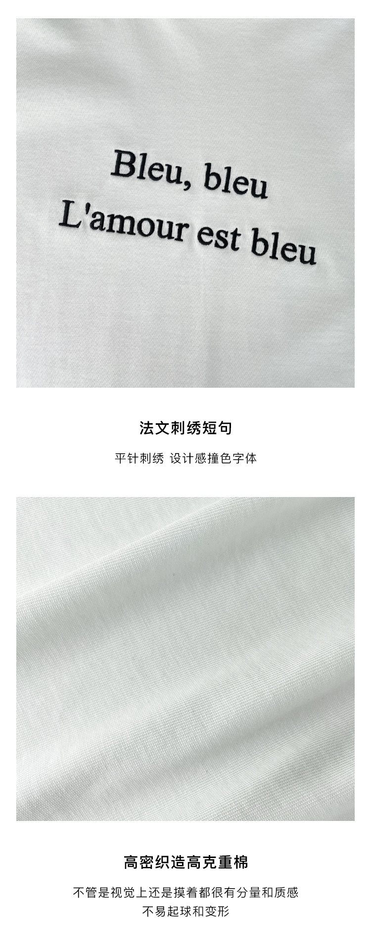 鹿与飞鸟 Короткая облегающая хлопковая футболка с вышивкой и плоской строчкой, круглый вырез [французская футболка] 4455