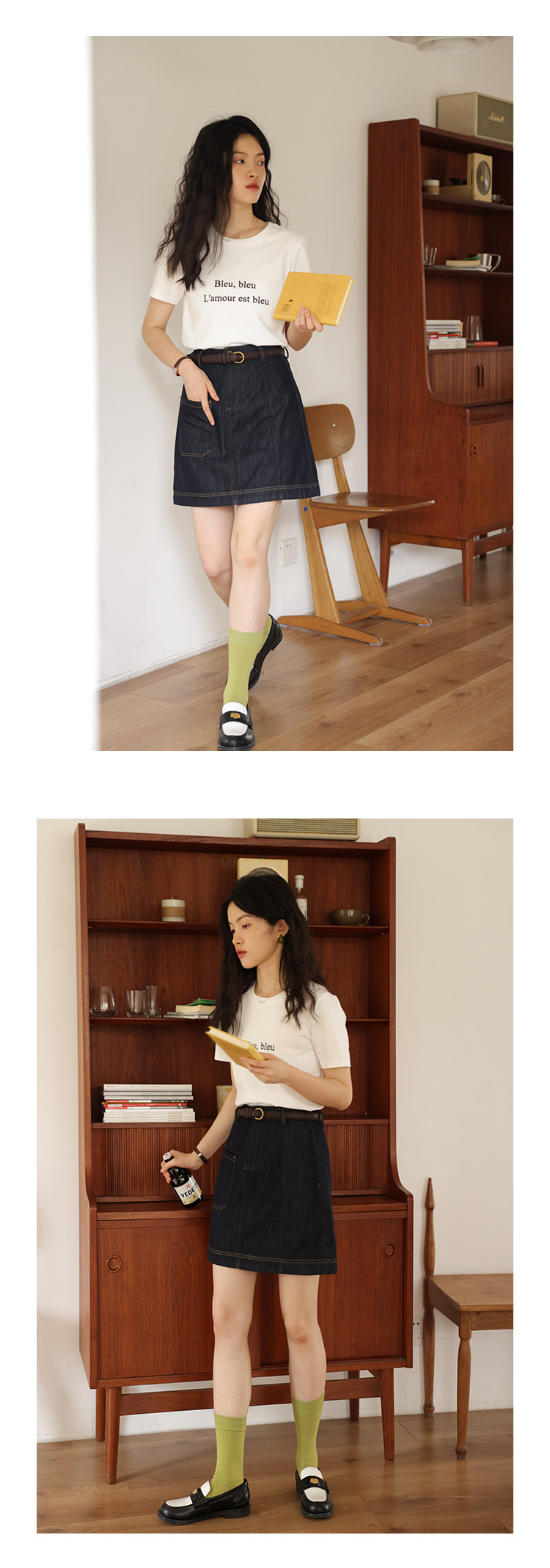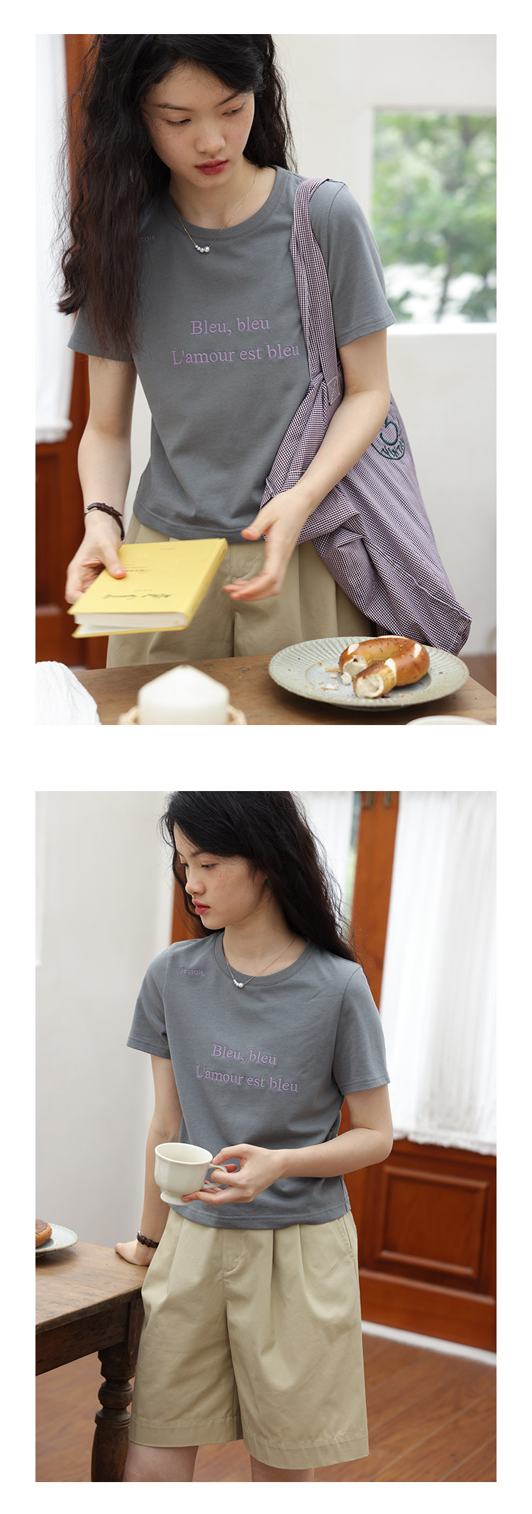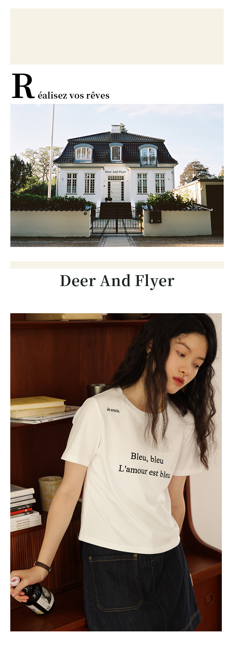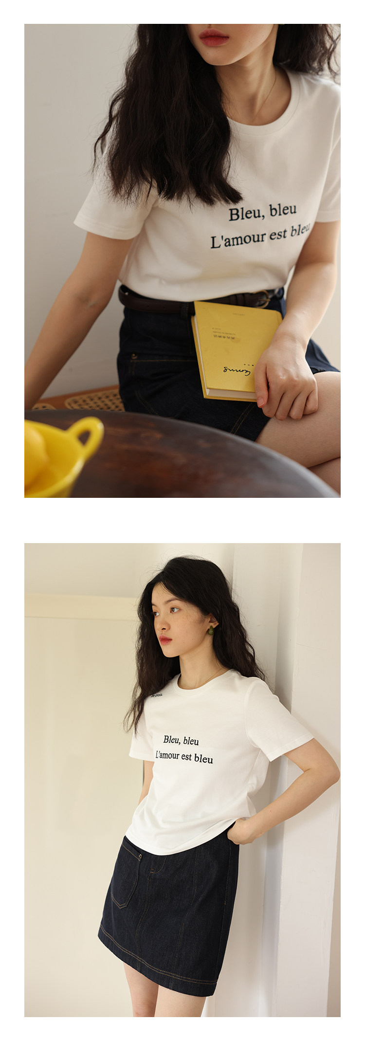 鹿与飞鸟 Короткая облегающая хлопковая футболка с вышивкой и плоской строчкой, круглый вырез [французская футболка] 4455