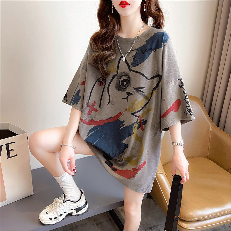 Летняя ретро летняя одежда, длинная футболка с коротким рукавом, большой размер, свободный крой, средней длины