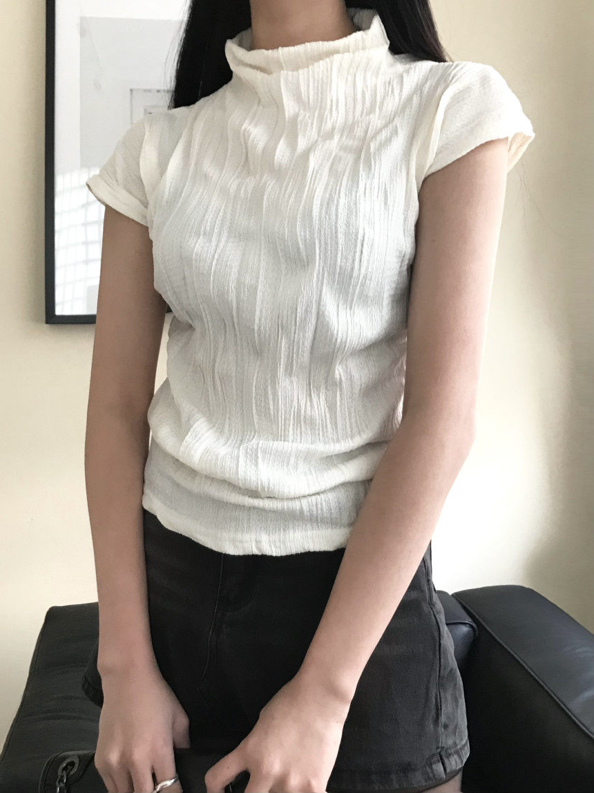 Уникальная однотонная тонкая футболка SEI в стиле ретро с высоким воротником и небольшими летящими рукавами, со складками и короткими рукавами, облегающая универсальная футболка для женщин