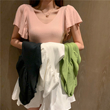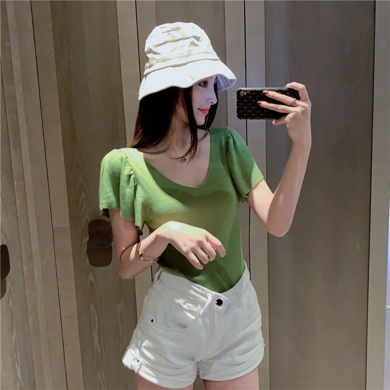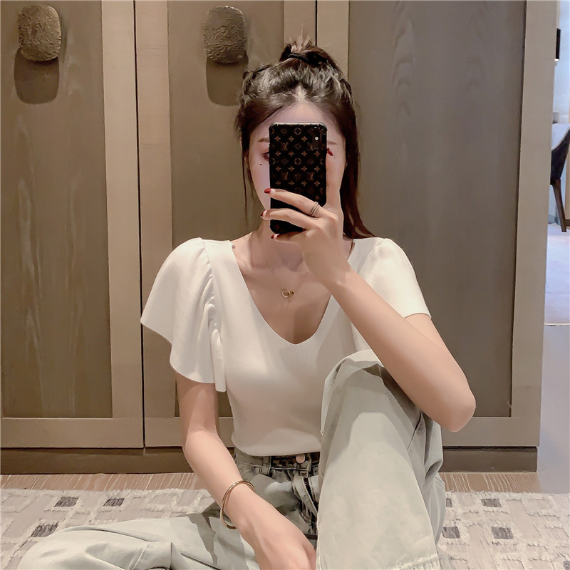 Летняя футболка, трикотажный свитер, с рукавом, короткий рукав, V-образный вырез