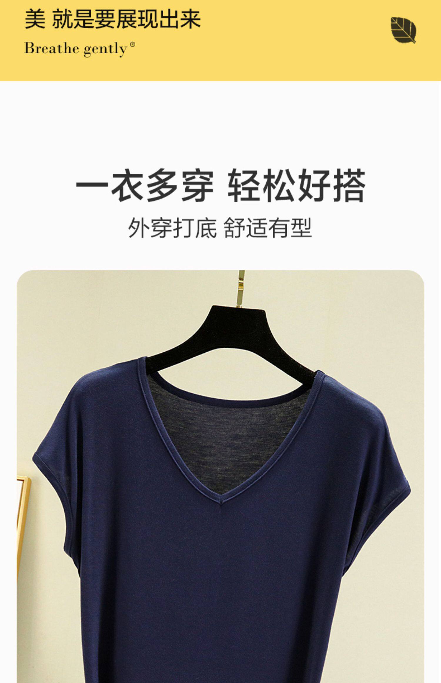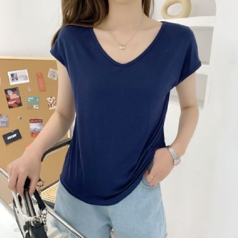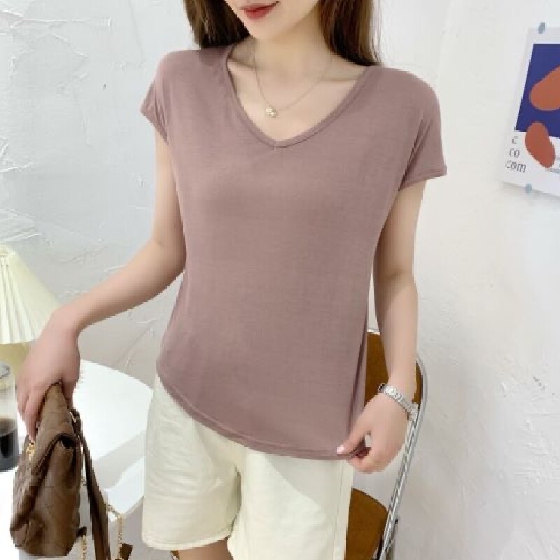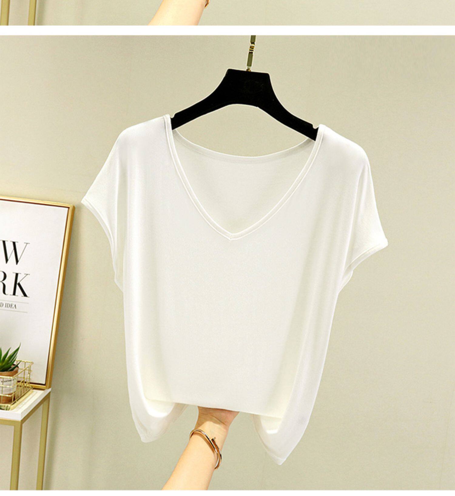 Тонкая однотонная базовая приятная телу футболка для отдыха, короткий рукав, V-образный вырез, большой размер