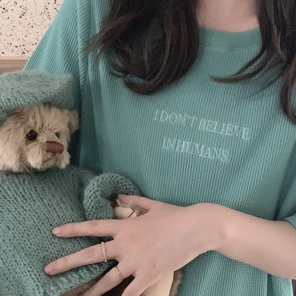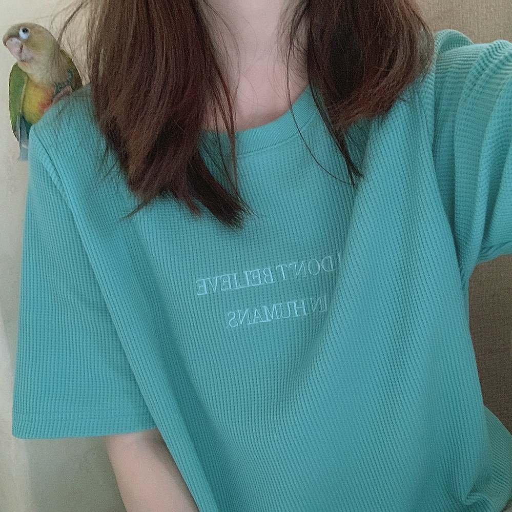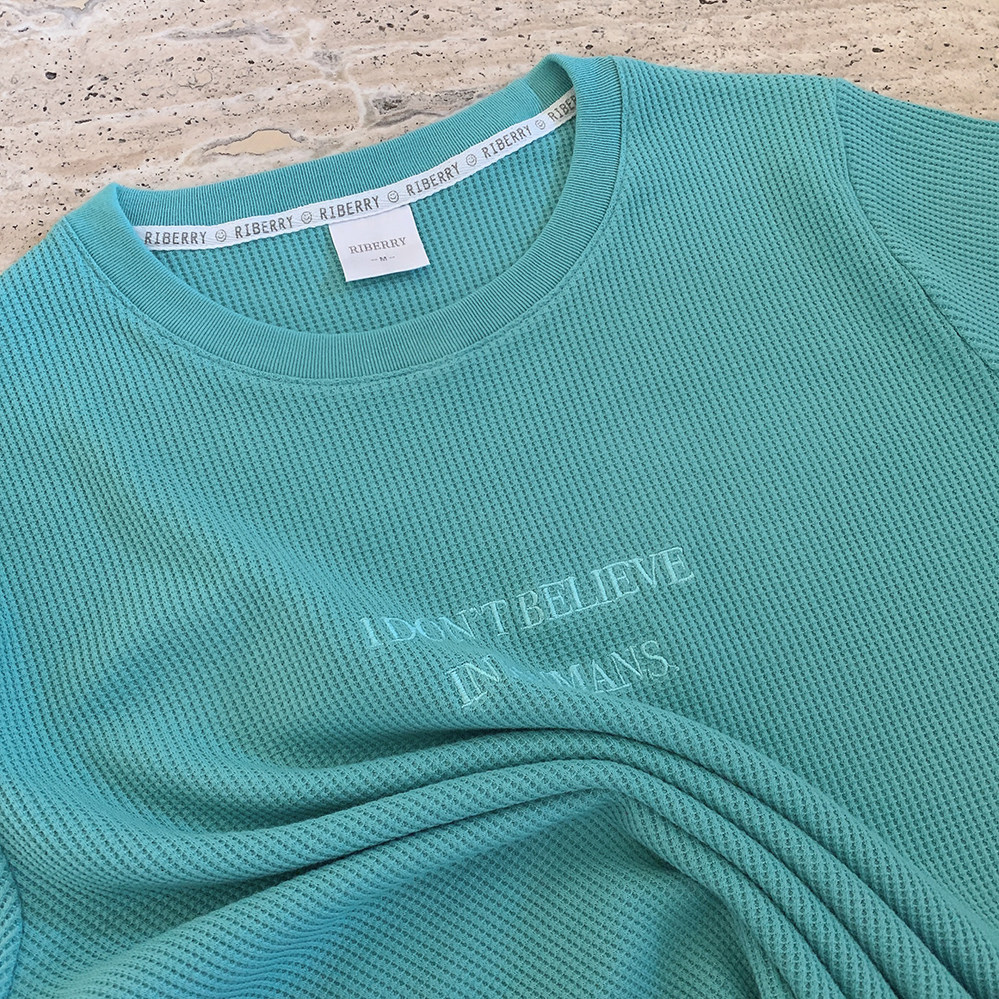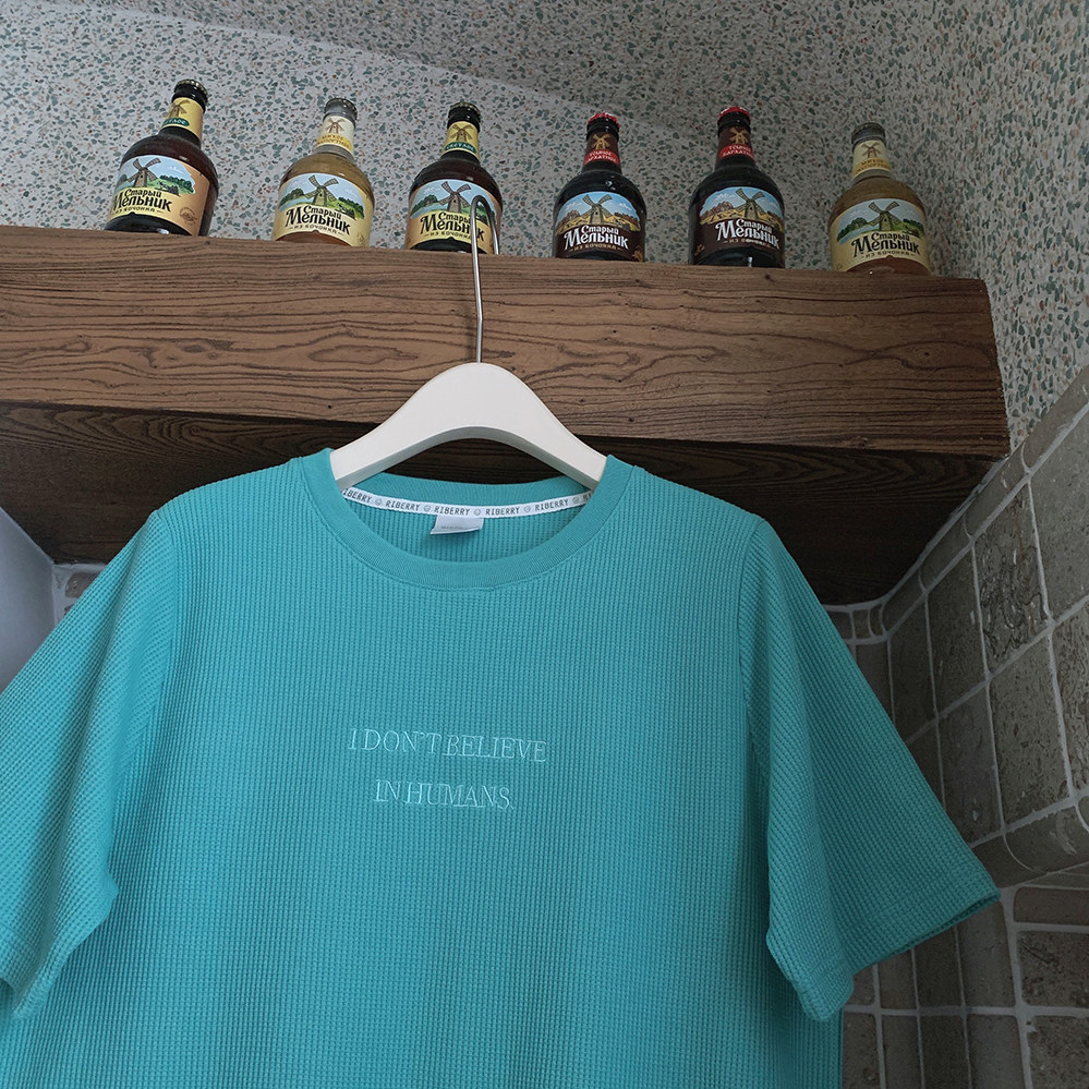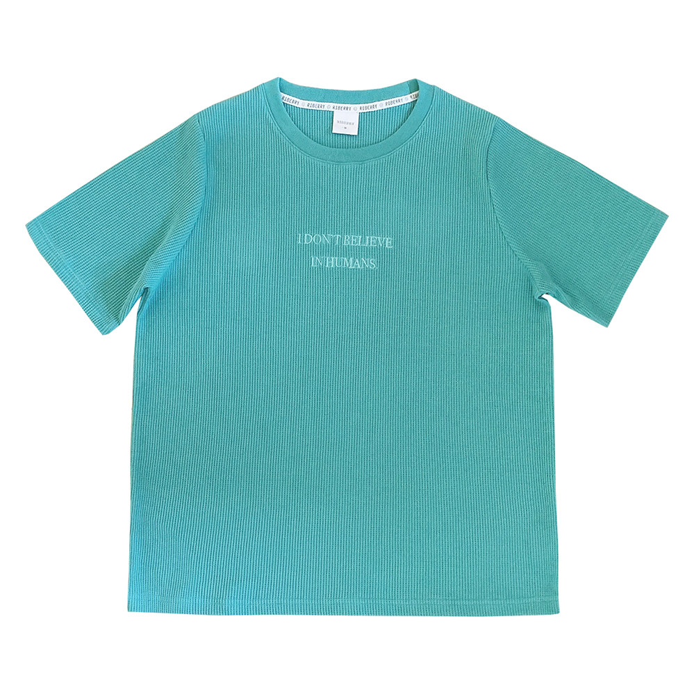 Бирюзовая футболка с короткими рукавами и свободными плечами, вышитыми вафельными буквами «Я не верю в людей» U.