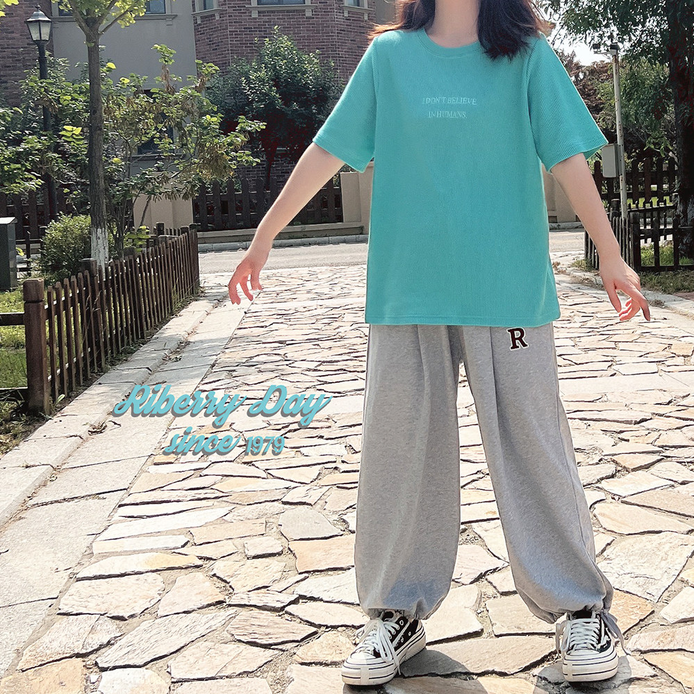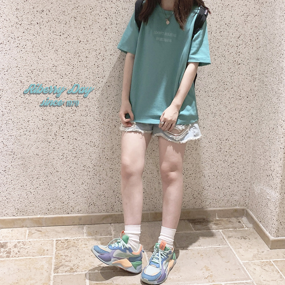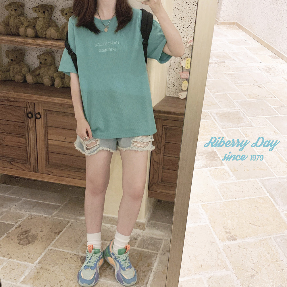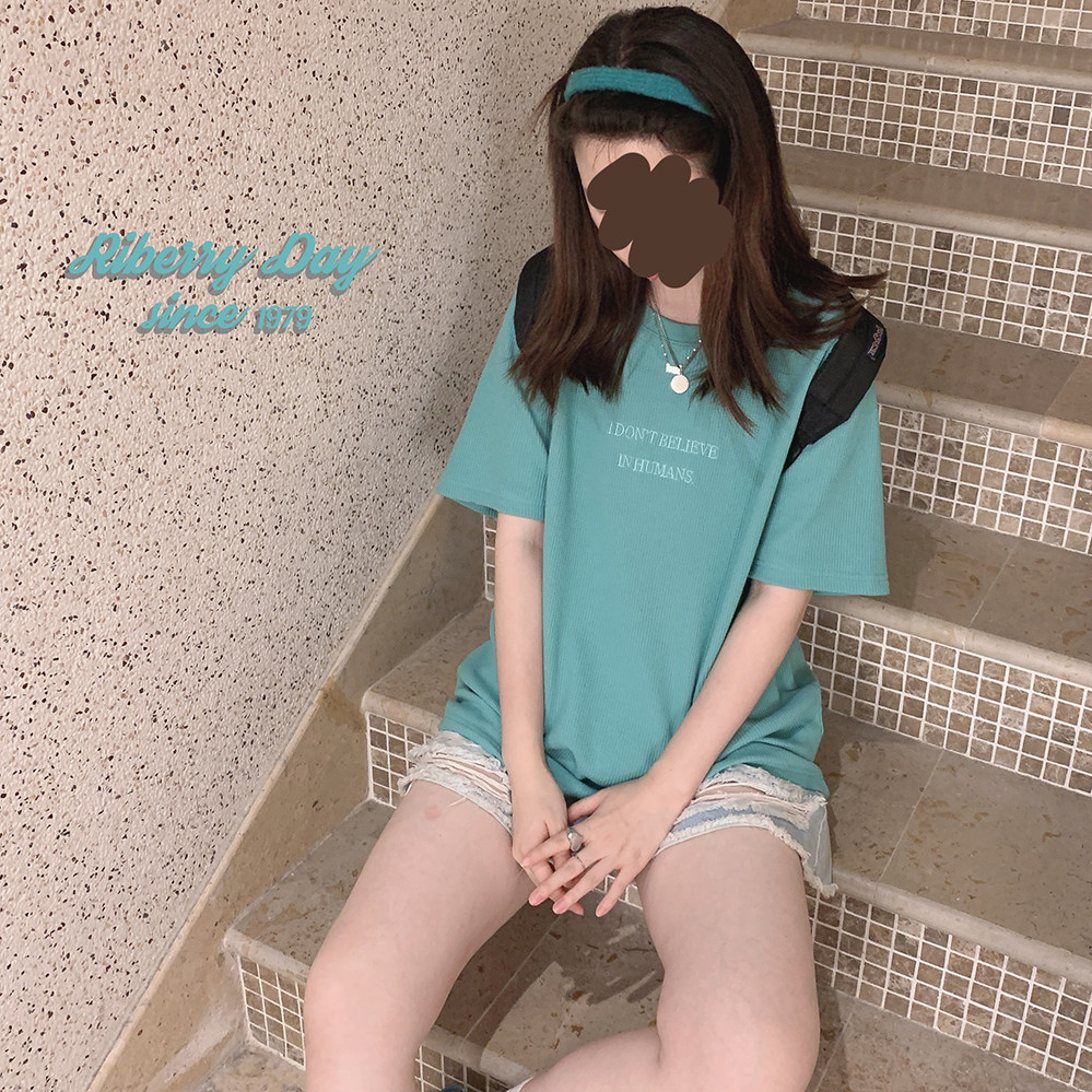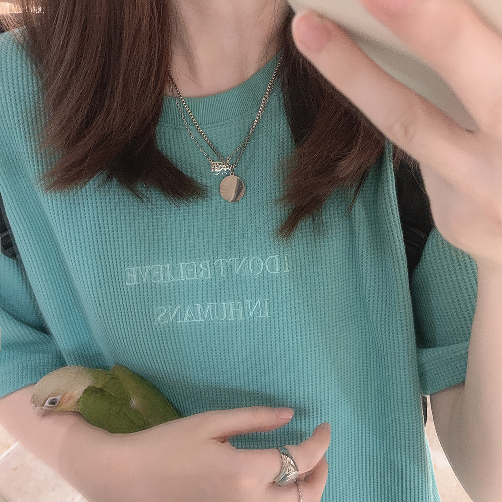 Бирюзовая футболка с короткими рукавами и свободными плечами, вышитыми вафельными буквами «Я не верю в людей» U.