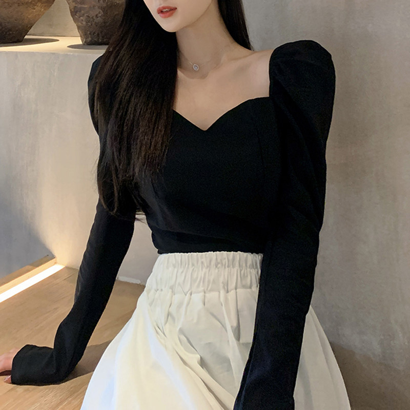 Черный весенний дизайнерский короткий лонгслив, французский стиль, V-образный вырез, рукава фонарики, с рукавом, тренд сезона