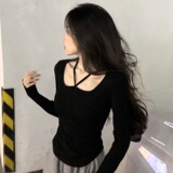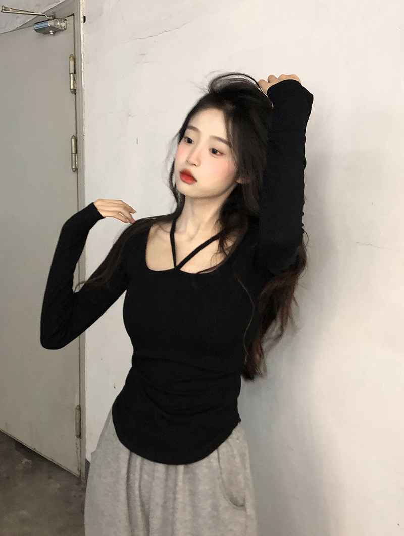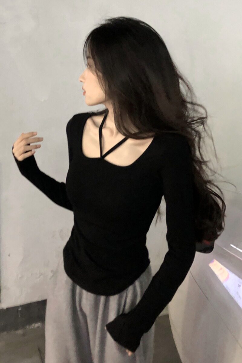 Приталенный лонгслив, короткая черная футболка, по фигуре, большой размер, в корейском стиле