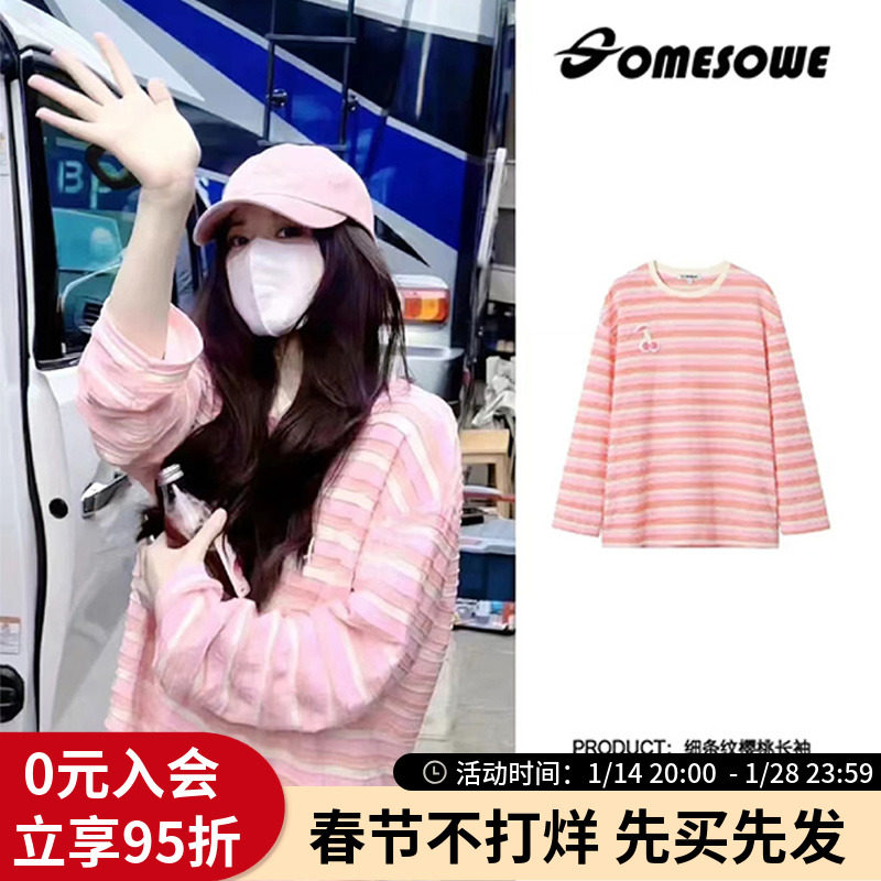 Женская полосатая вишневая футболка с длинными рукавами Zhao Lusi's Same SOMESOWE, свободный розовый топ с внутренней толстовкой