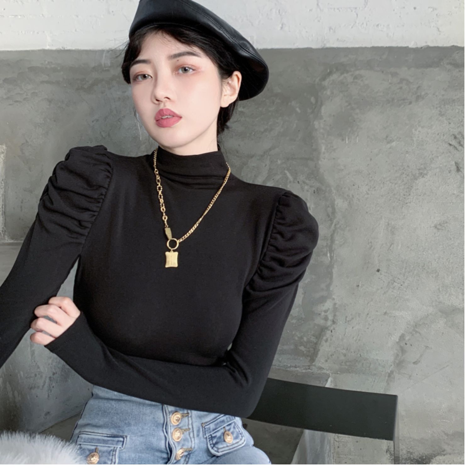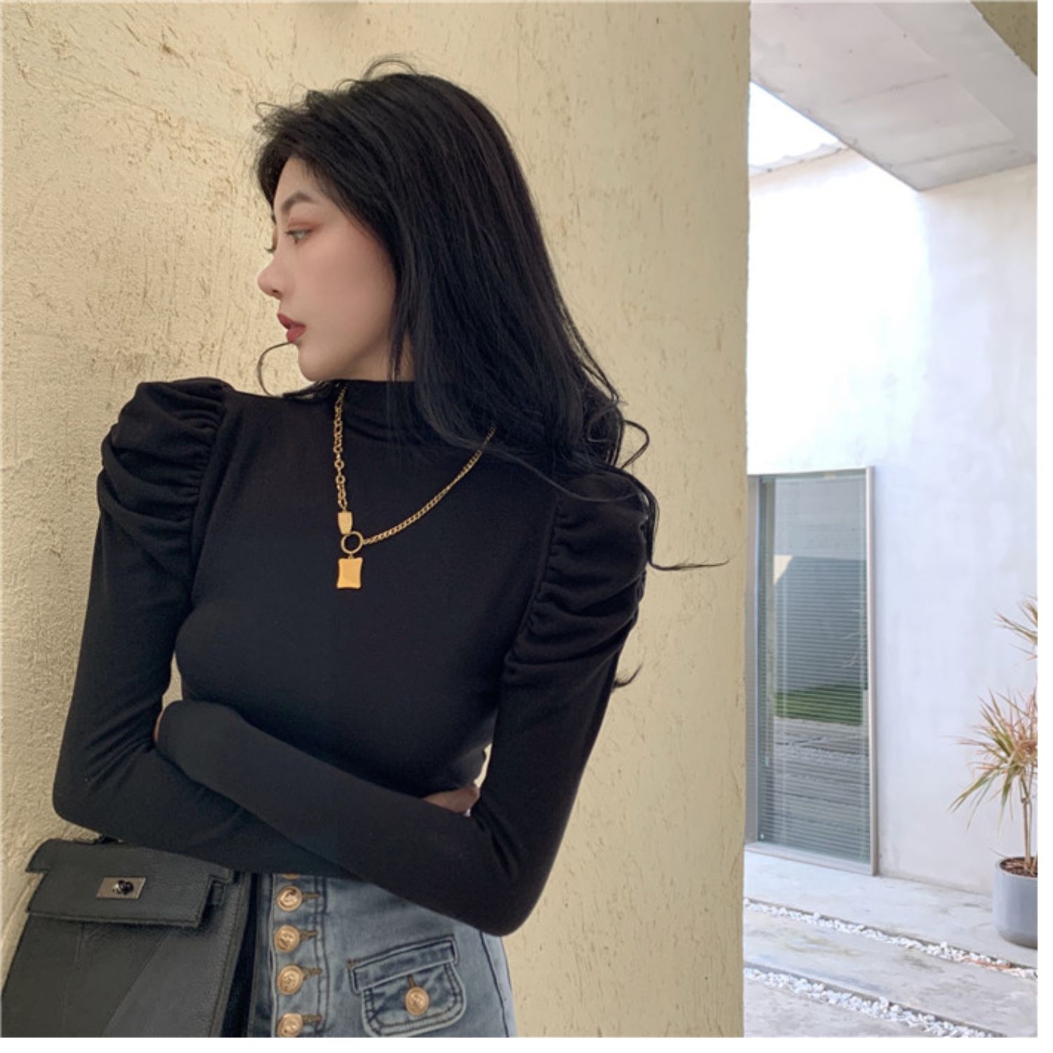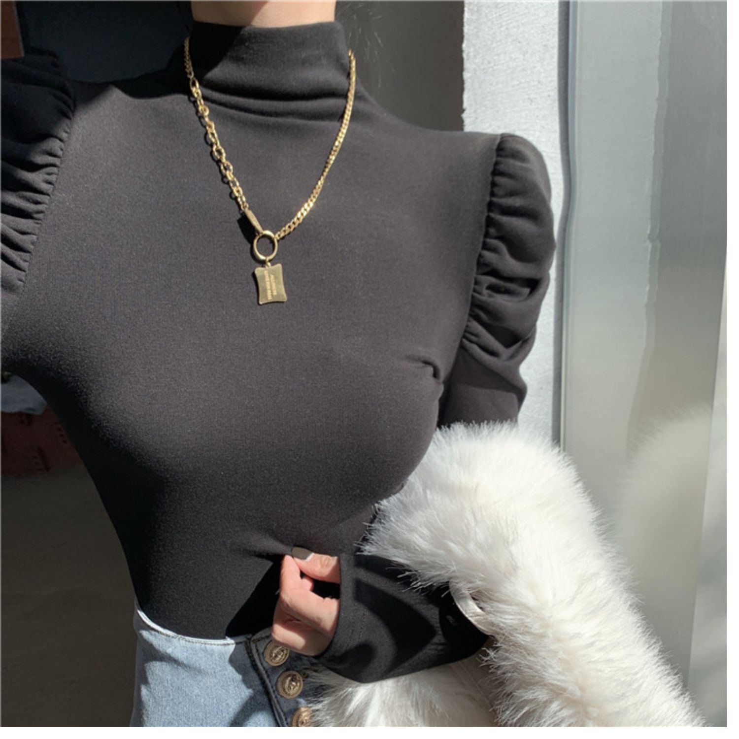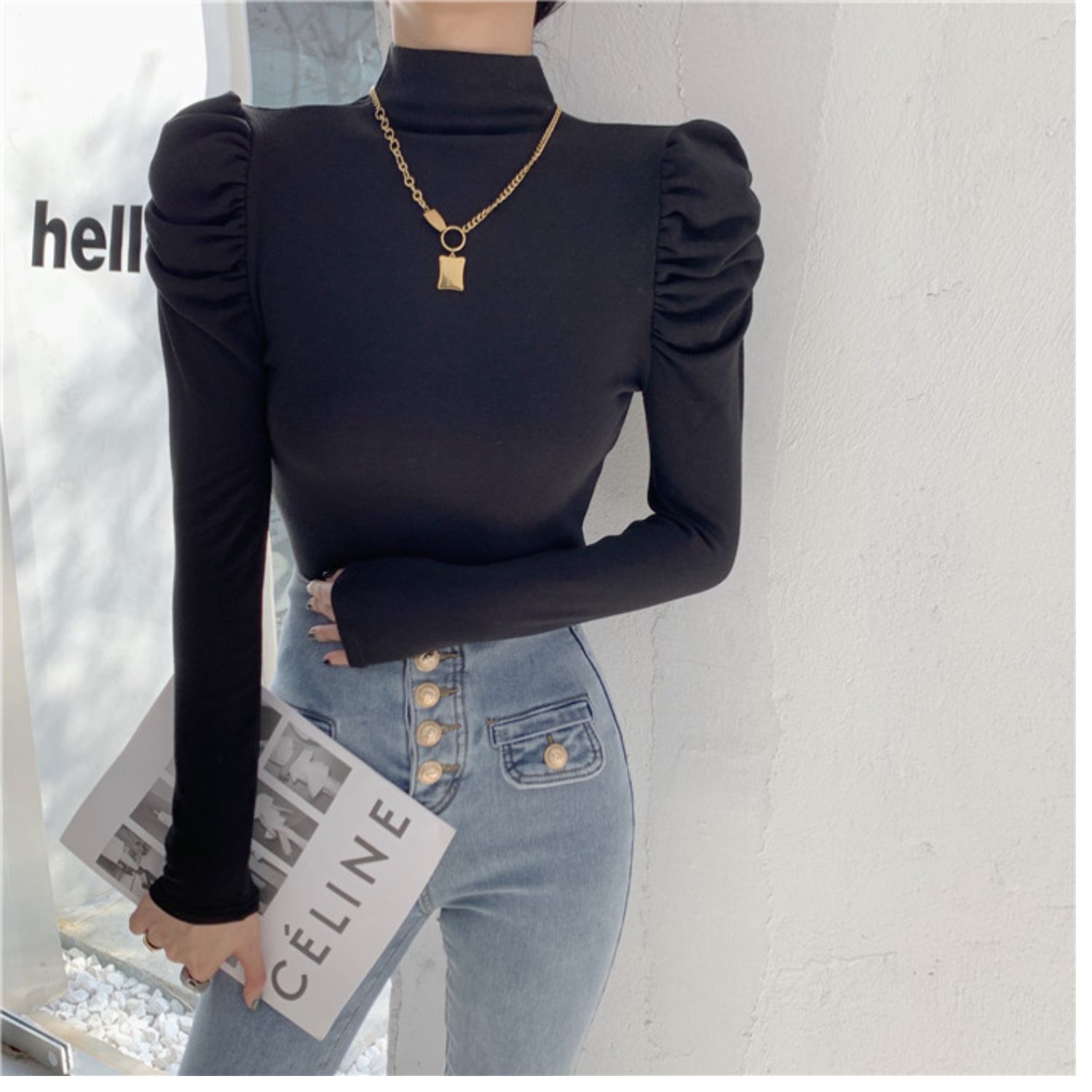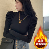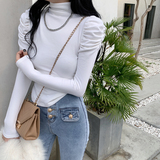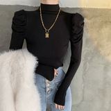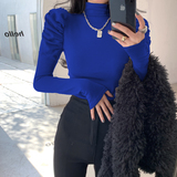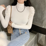 Приятный телу сексуальный лонгслив, футболка, осенний, высокий воротник, рукава фонарики, в обтяжку