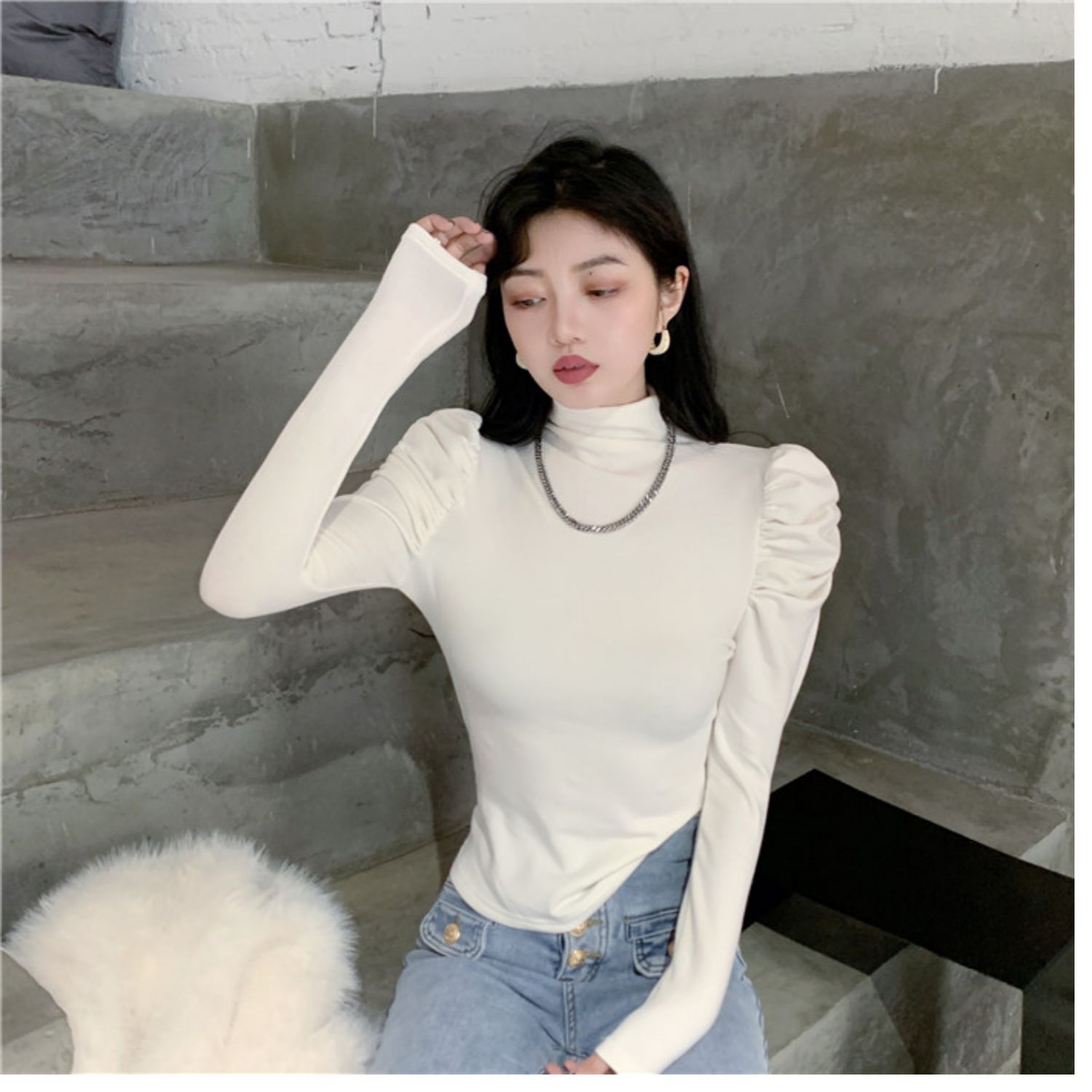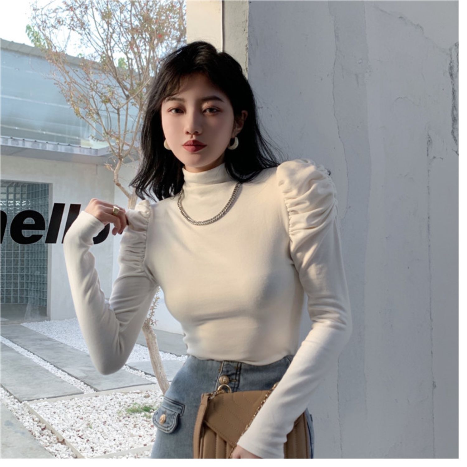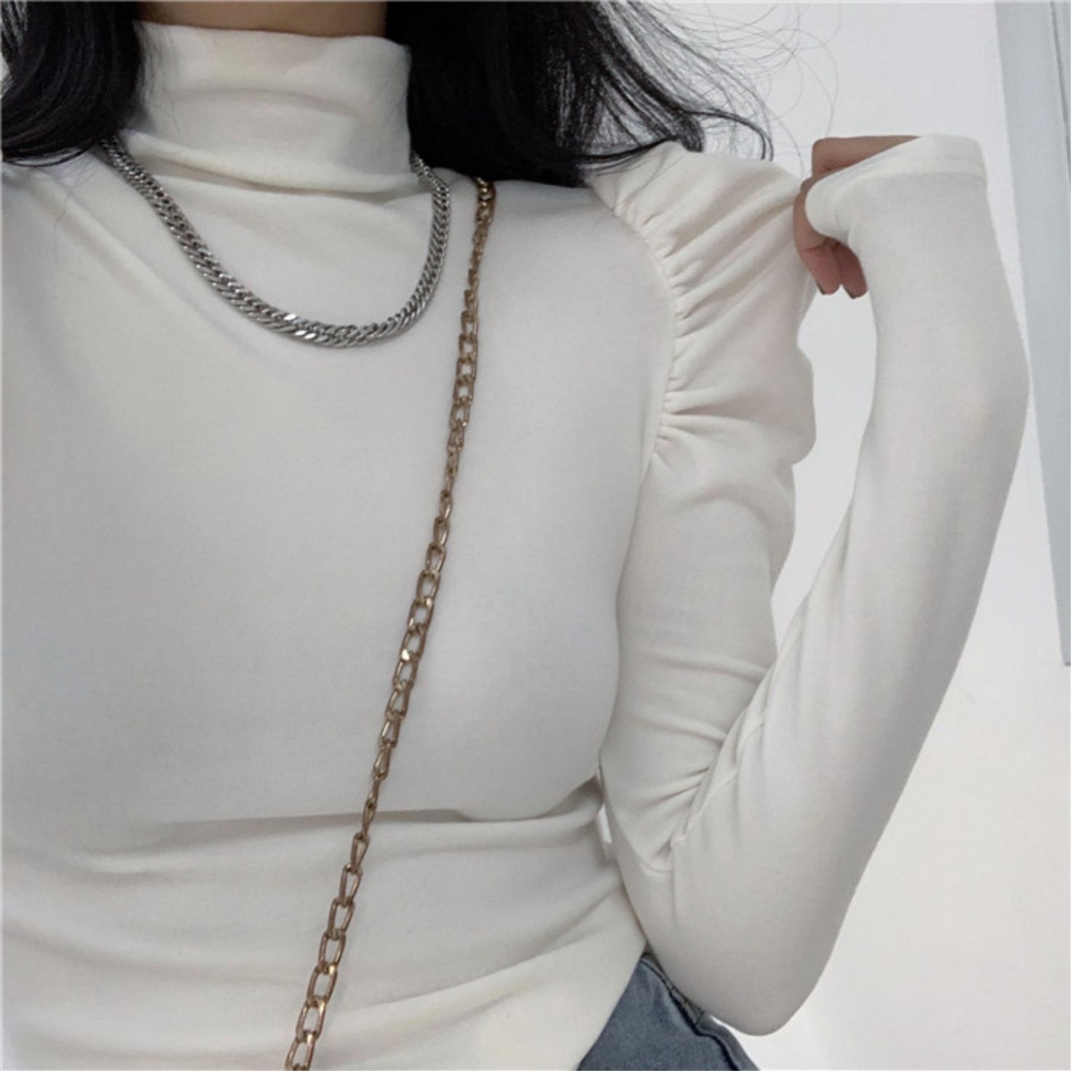 Приятный телу сексуальный лонгслив, футболка, осенний, высокий воротник, рукава фонарики, в обтяжку