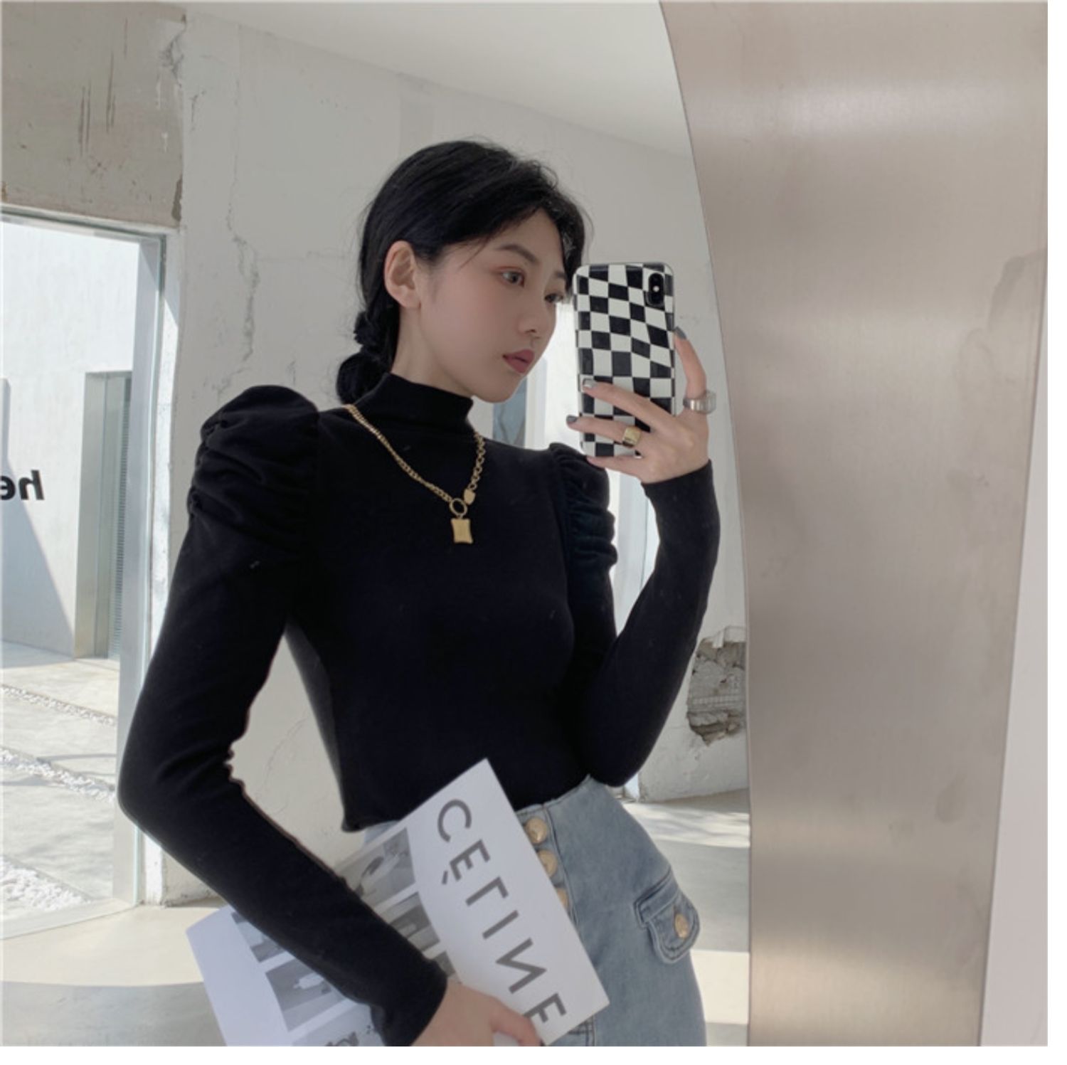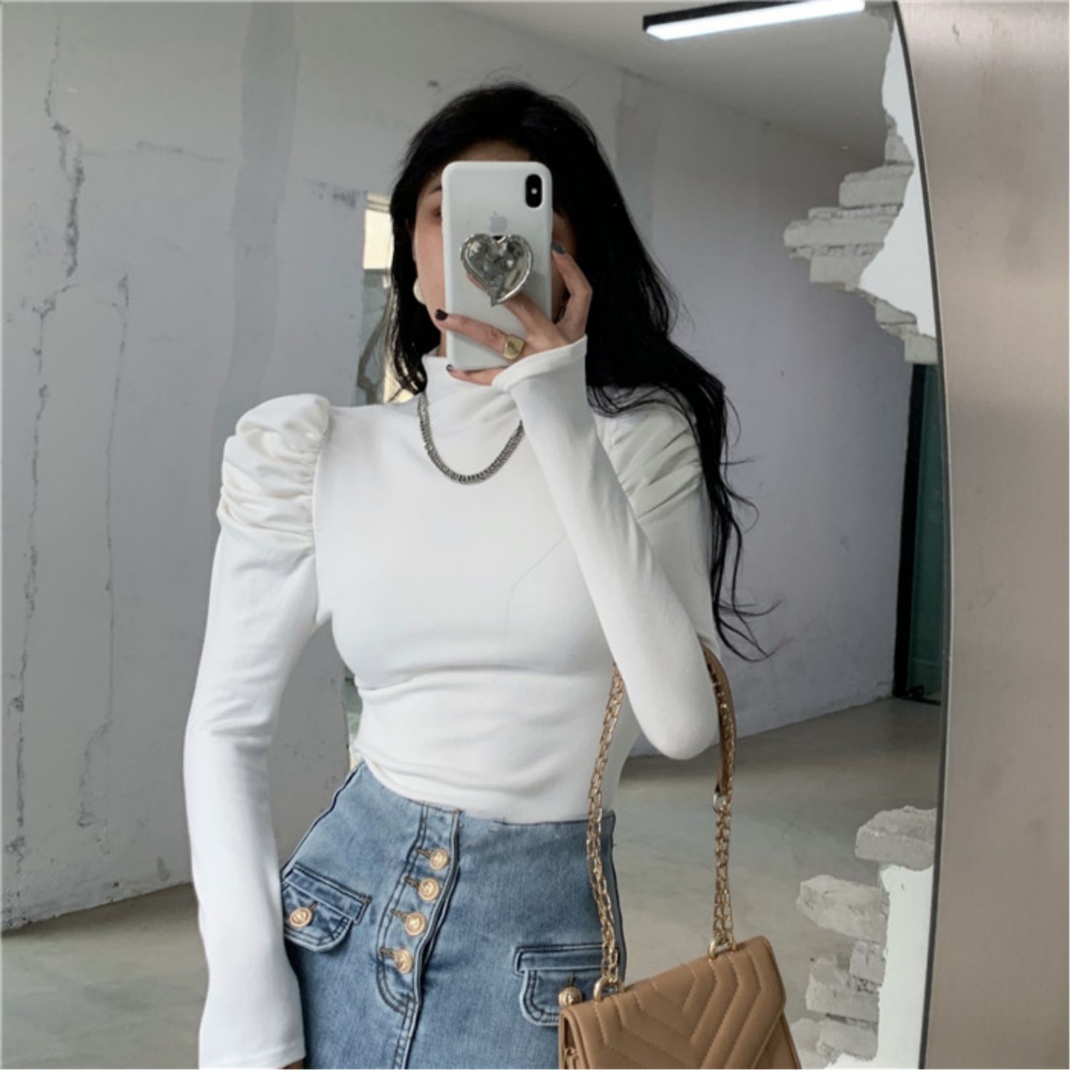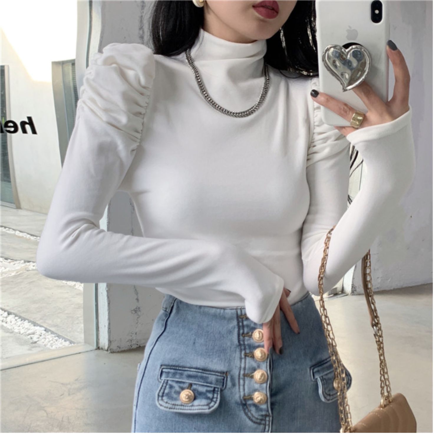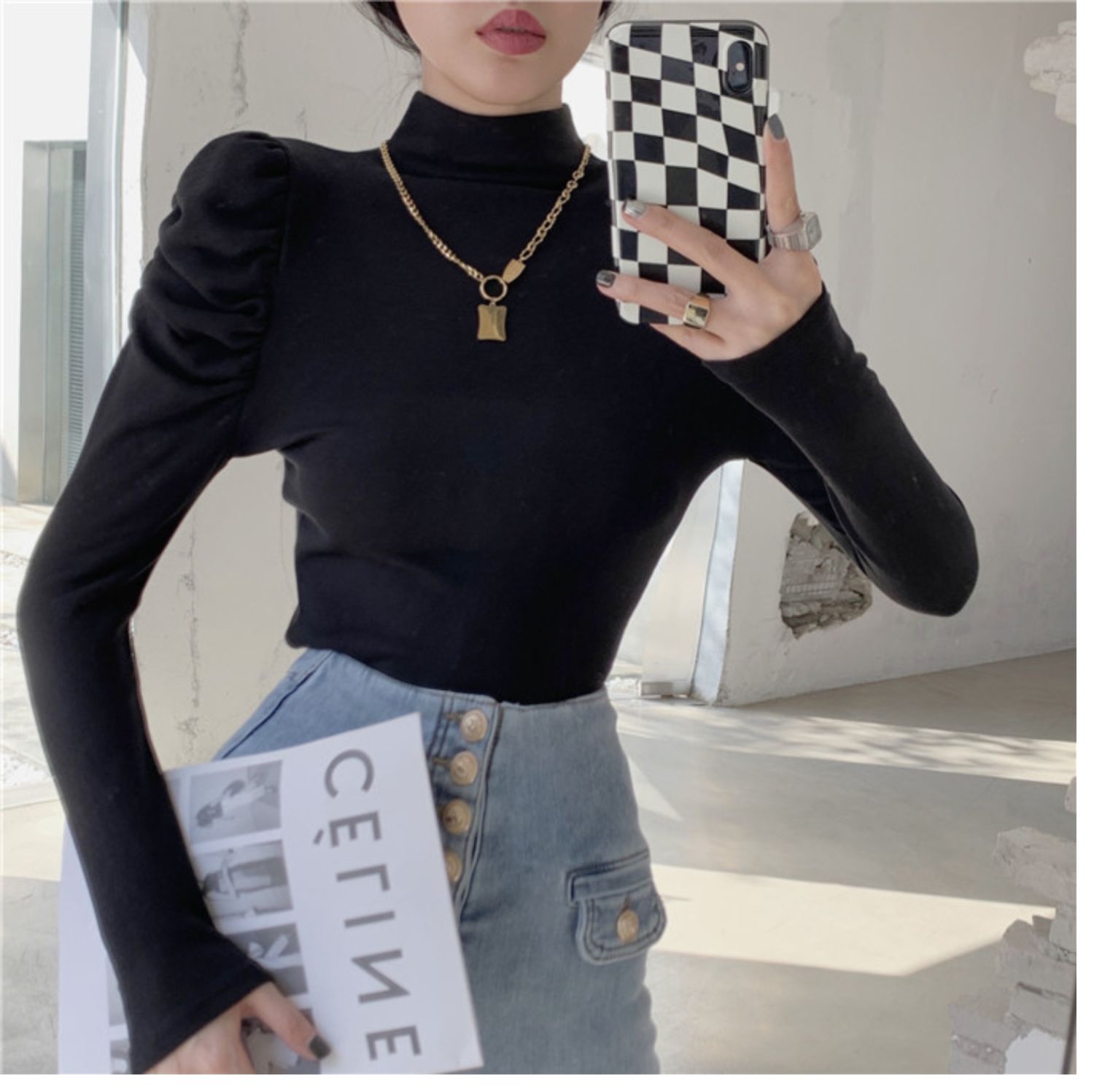 Приятный телу сексуальный лонгслив, футболка, осенний, высокий воротник, рукава фонарики, в обтяжку