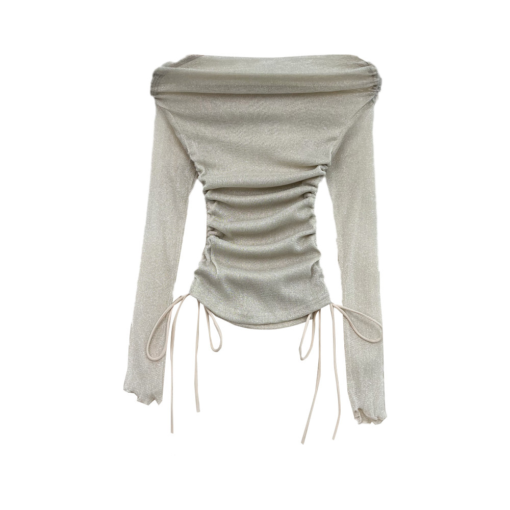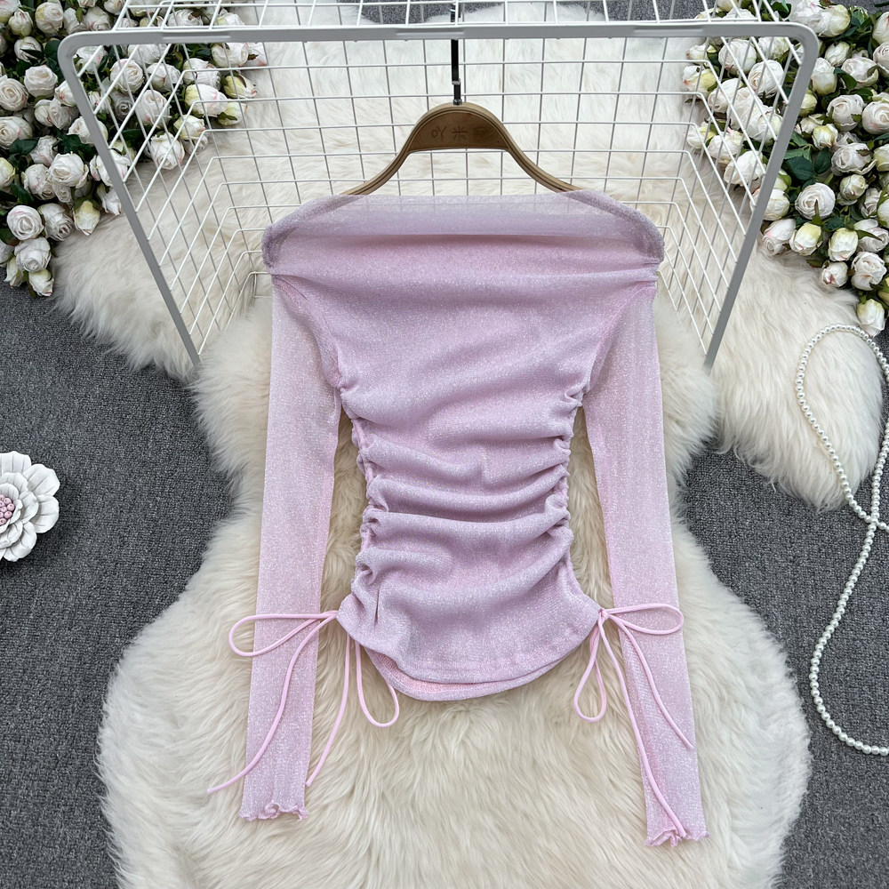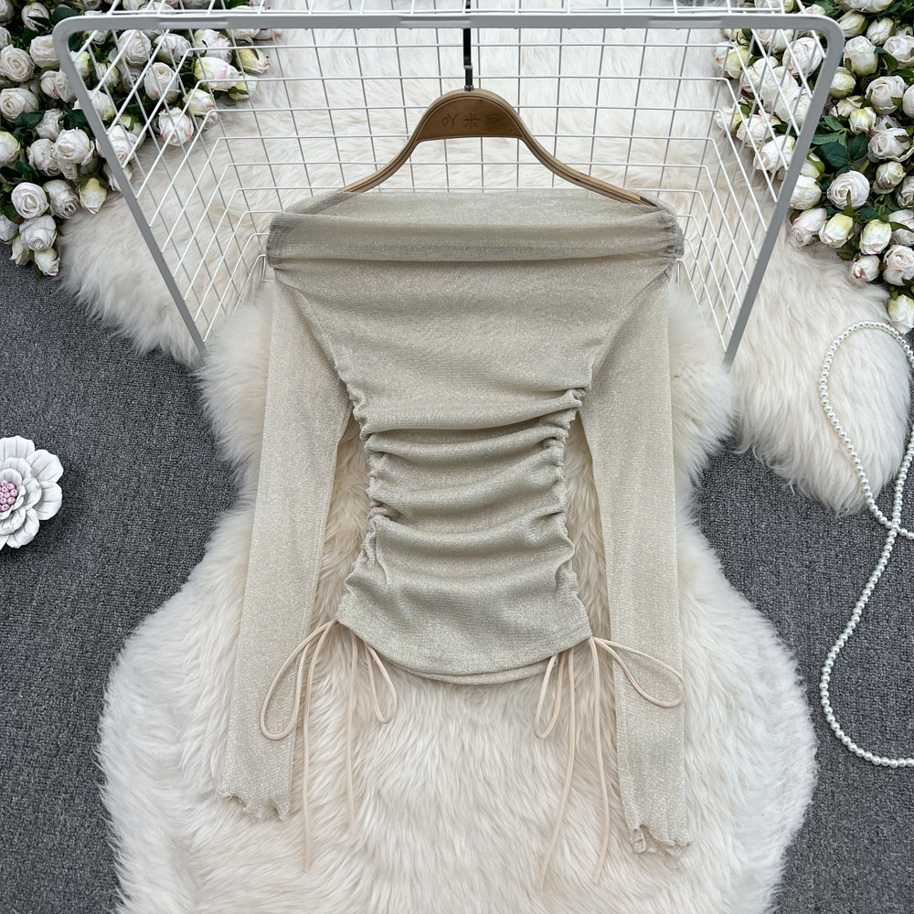 Сексуальный блестящий базовый приятный телу лонгслив, открытые плечи, в западном стиле, облегающий крой