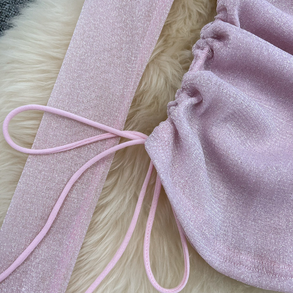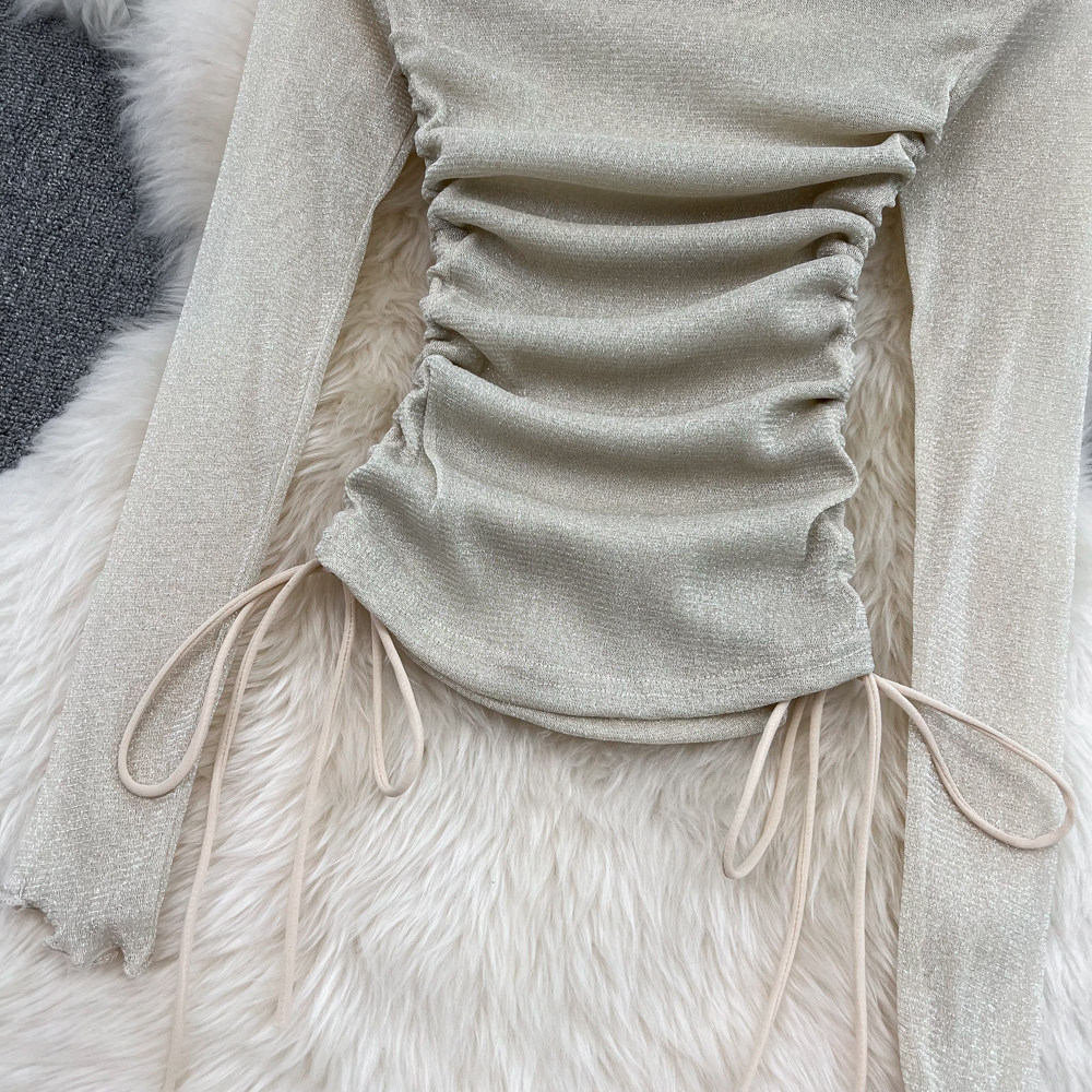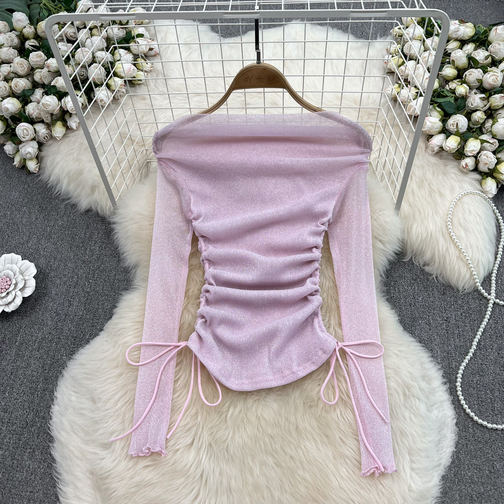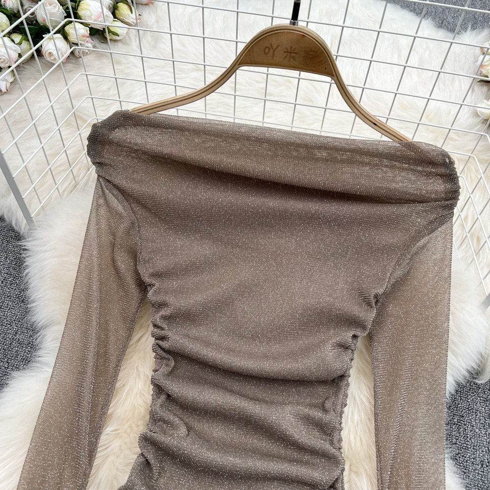 Сексуальный блестящий базовый приятный телу лонгслив, открытые плечи, в западном стиле, облегающий крой