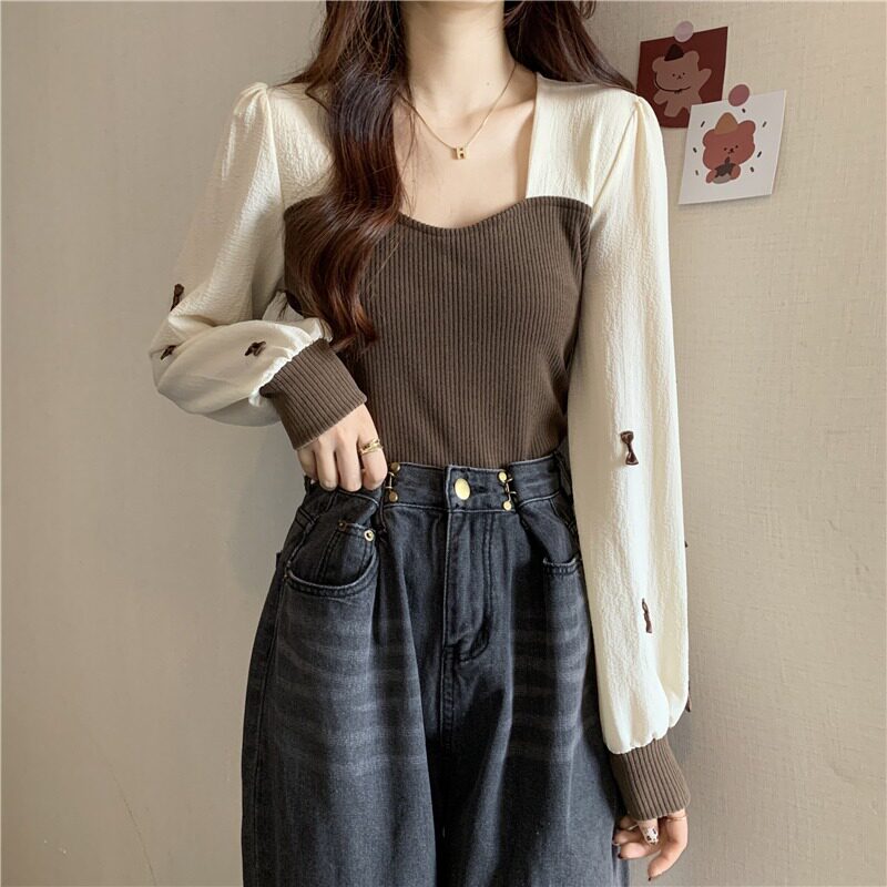 Базовый лонгслив, дизайнерская осенняя рубашка, французский стиль, в западном стиле, квадратный вырез, тренд сезона