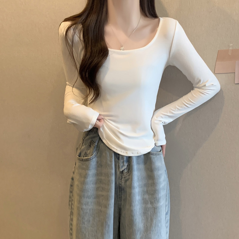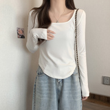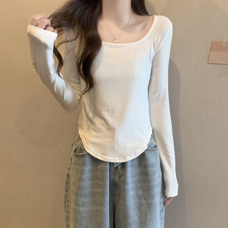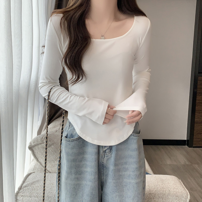 Осенняя футболка, короткий базовый приятный телу белый лонгслив, квадратный вырез, большой размер