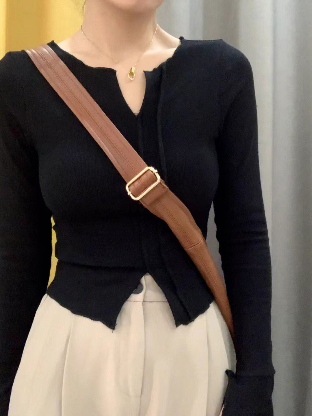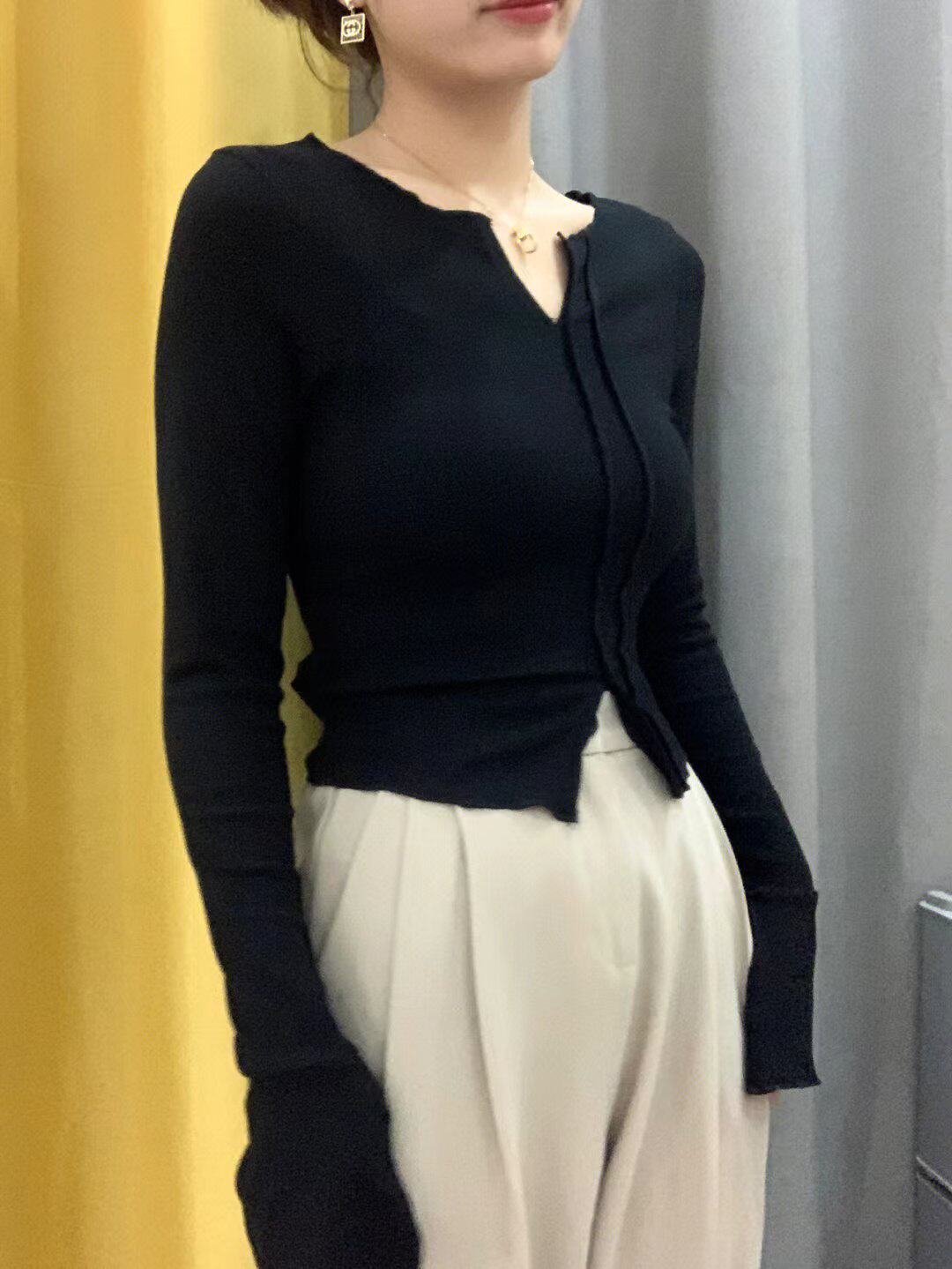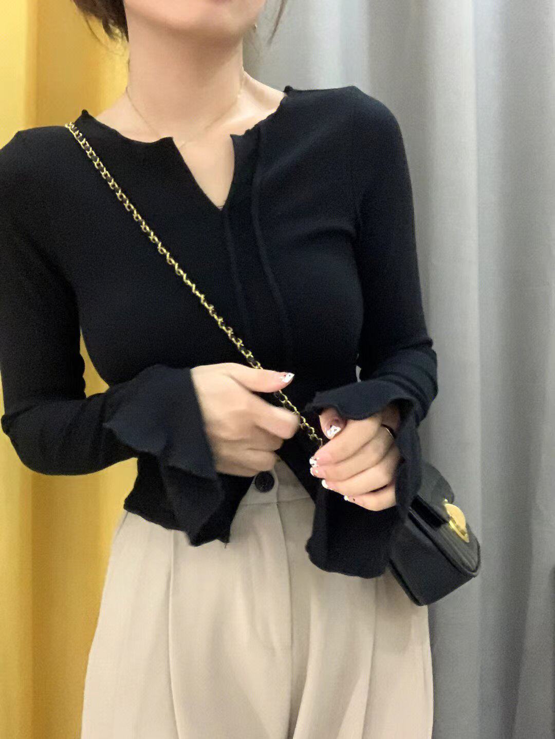 Осенний демисезонный базовый приятный телу сексуальный короткий лонгслив, V-образный вырез