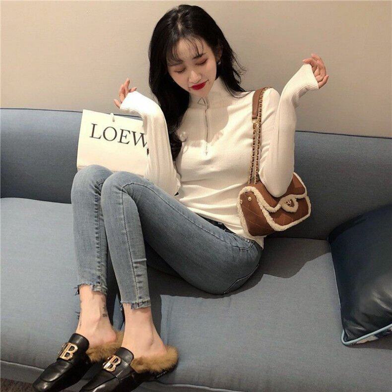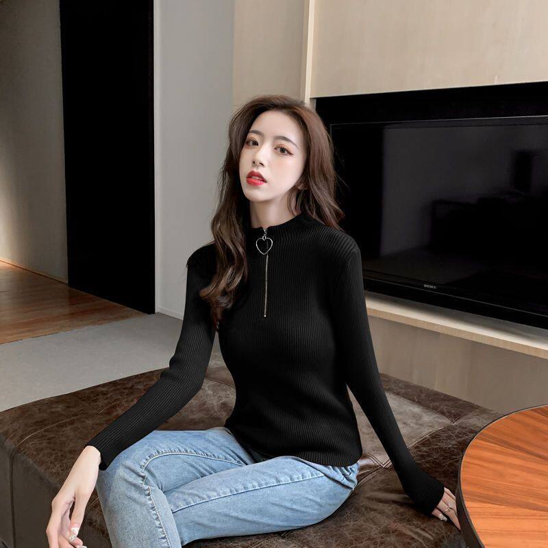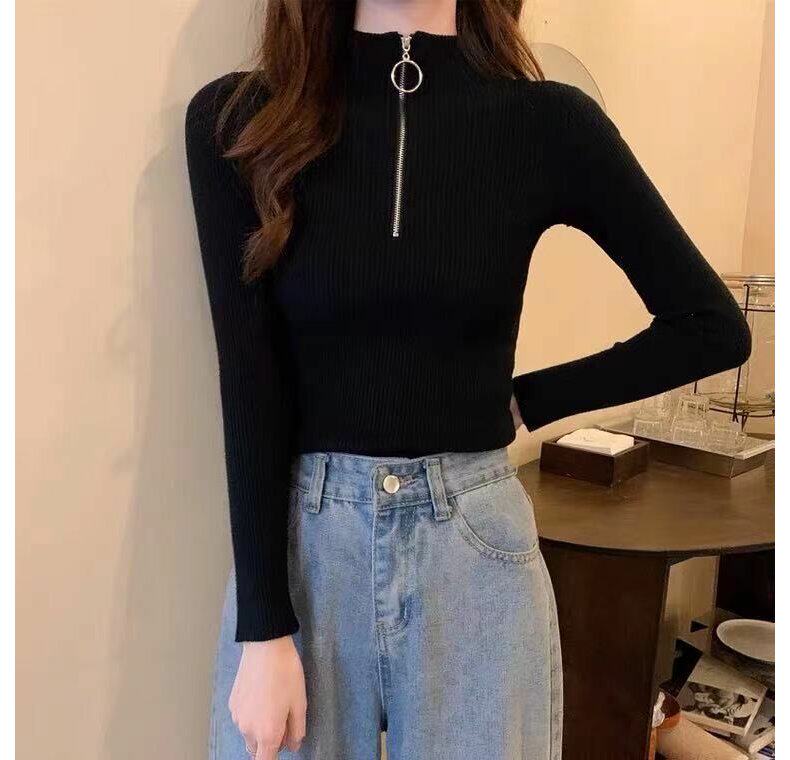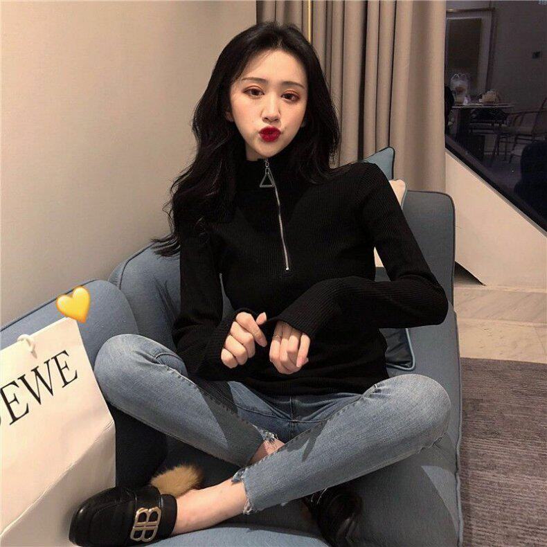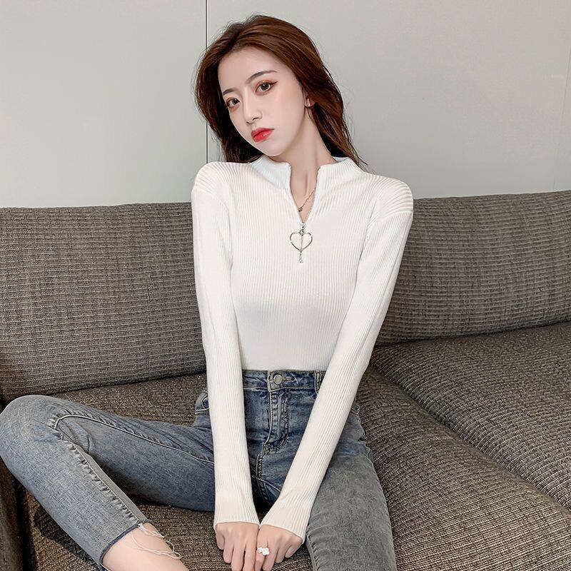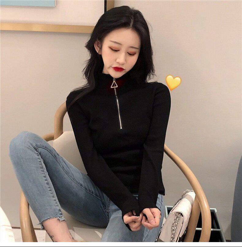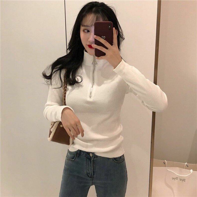 Демисезонный приталенный свитер с молнией, трикотажный лонгслив, в корейском стиле, высокий воротник