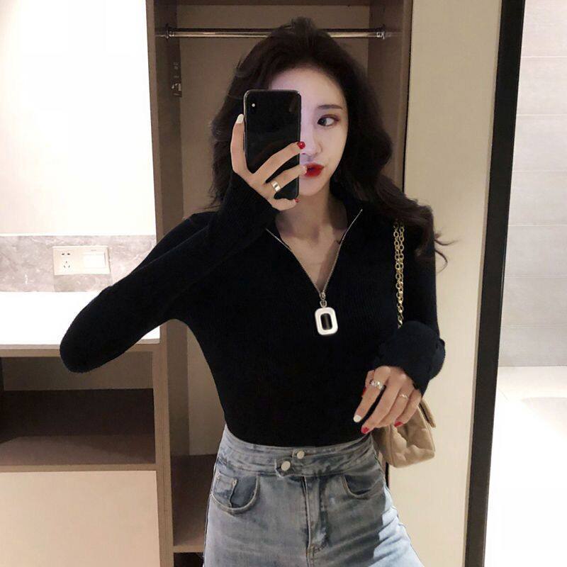 Демисезонный трикотажный лонгслив с молнией, свитер, подходит для полных девушек, большой размер, высокий воротник, в западном стиле