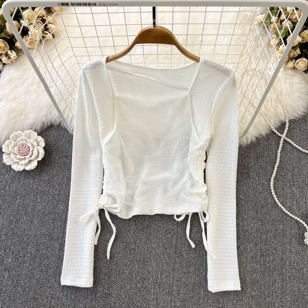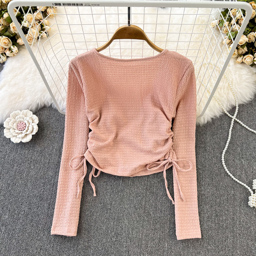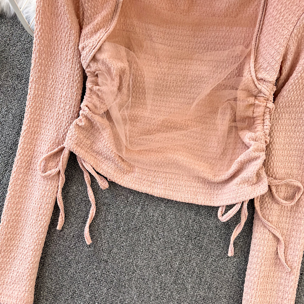Осенняя небольшая дизайнерская короткая футболка для отдыха, тренд сезона, на шнурках, квадратный вырез, высокая талия