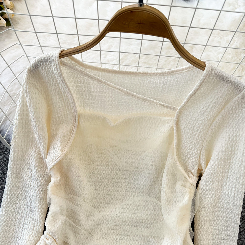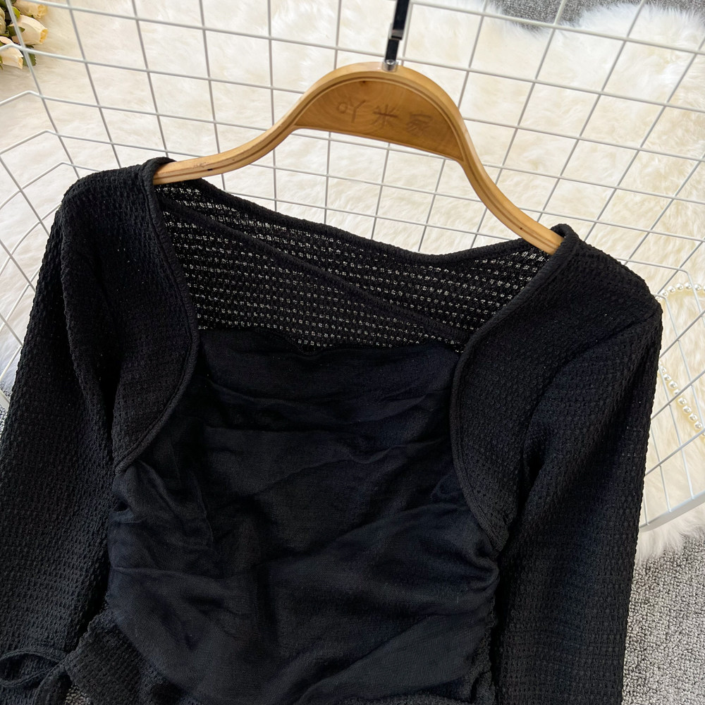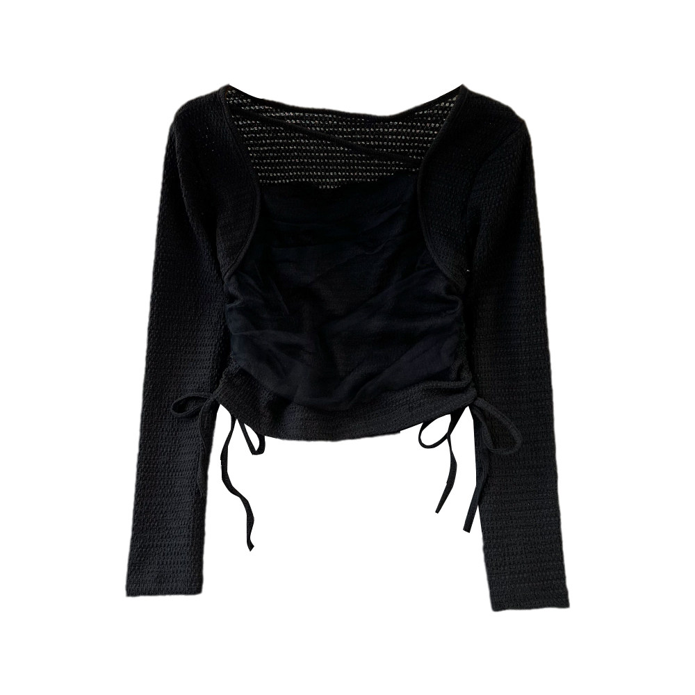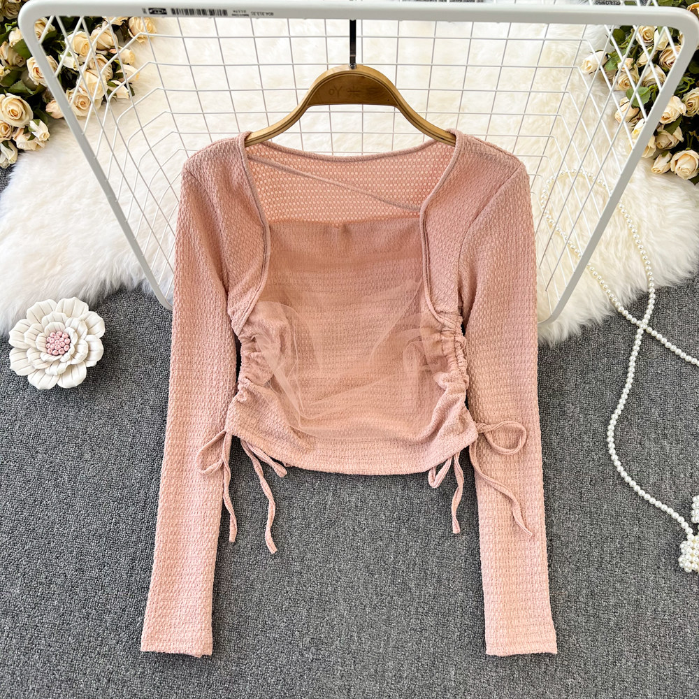 Осенняя небольшая дизайнерская короткая футболка для отдыха, тренд сезона, на шнурках, квадратный вырез, высокая талия
