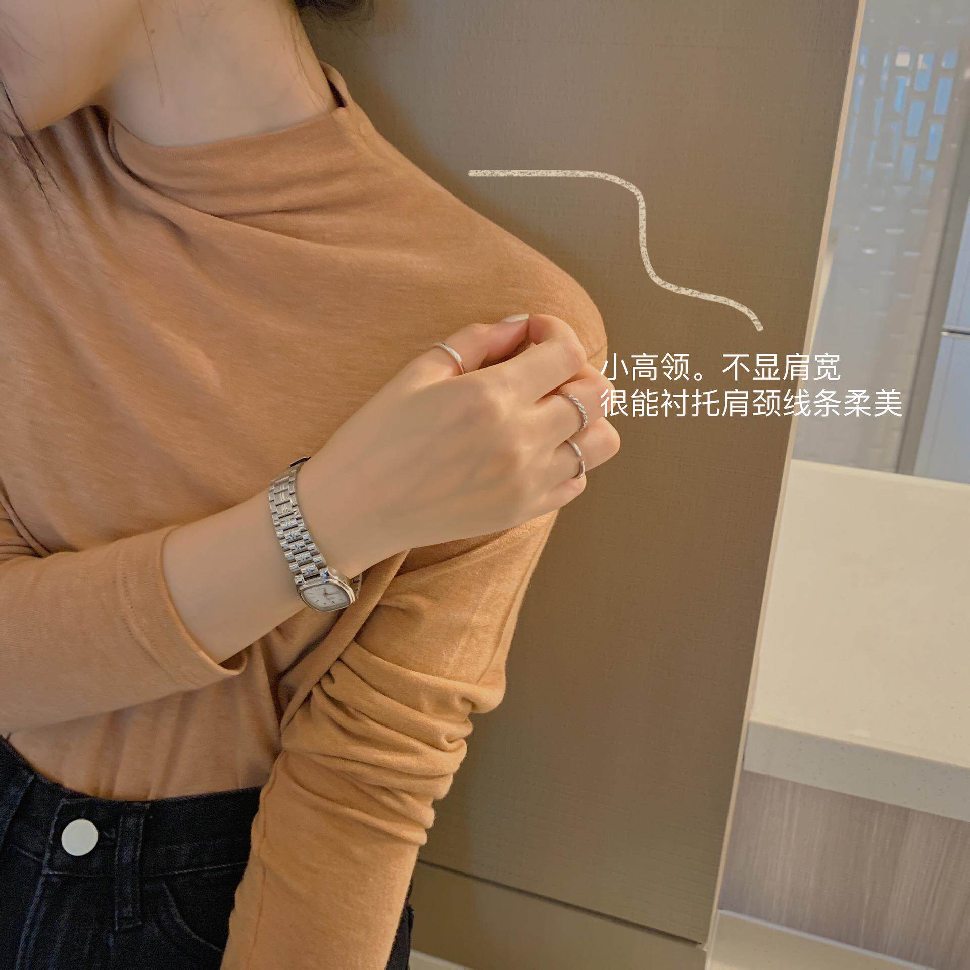 Демисезонный эластичный лонгслив, базовая приятная телу футболка для отдыха, по фигуре, в корейском стиле, высокий воротник