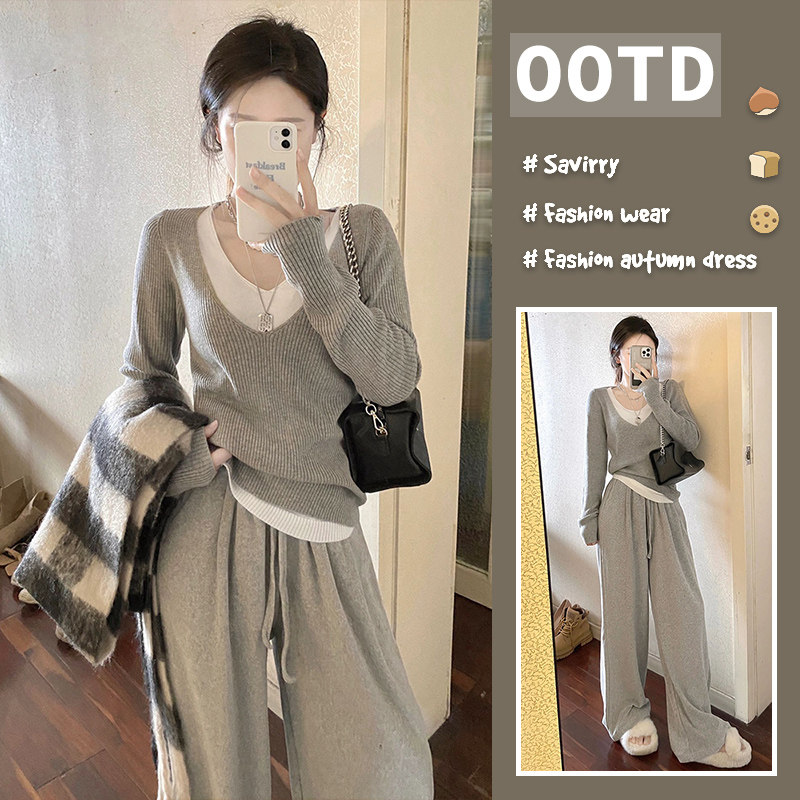 Весенний комплект, трикотажный свитер, сексуальный лонгслив, футболка, в корейском стиле, V-образный вырез