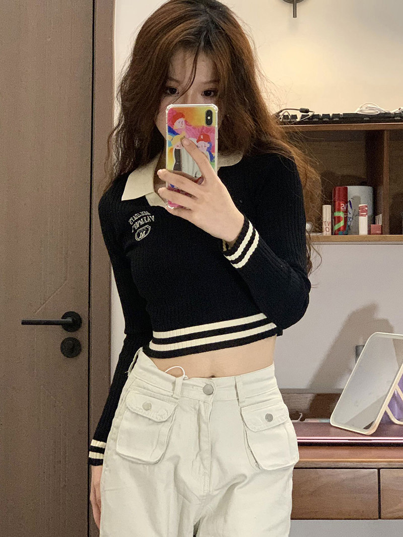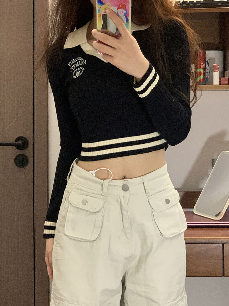 Трикотажный демисезонный базовый короткий свитер, в американском стиле, воротник поло, изысканный стиль, облегающий крой