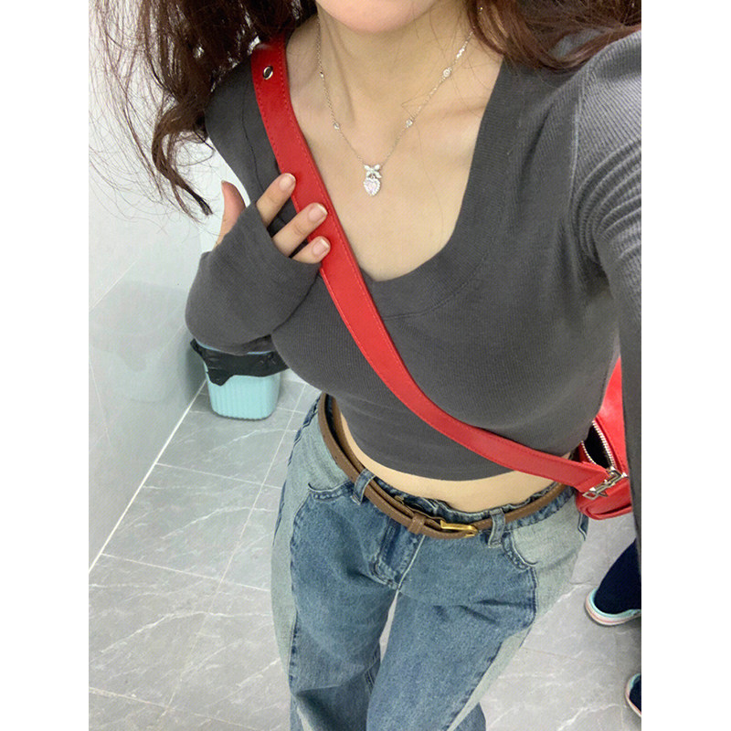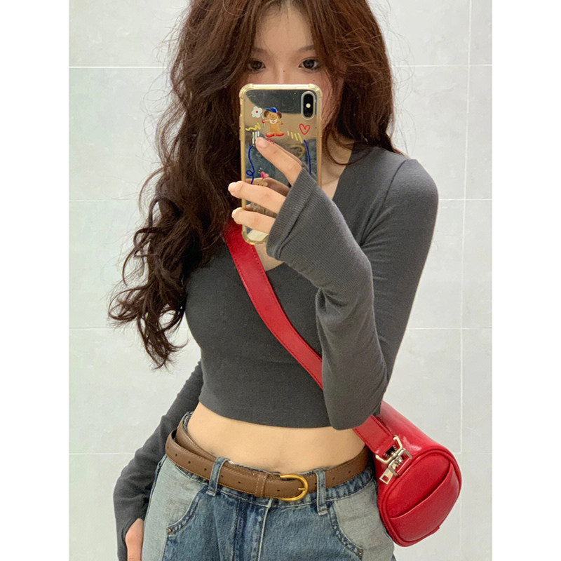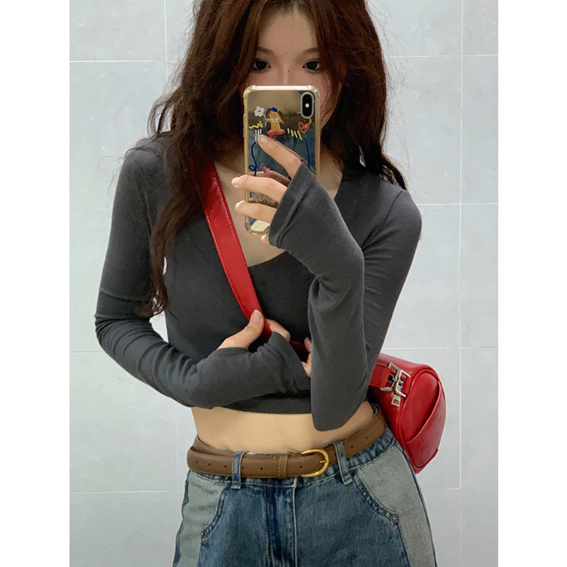 Демисезонный базовый приятный телу короткий лонгслив, V-образный вырез, в обтяжку, по фигуре