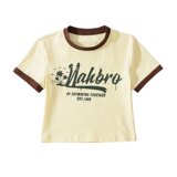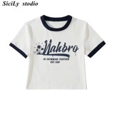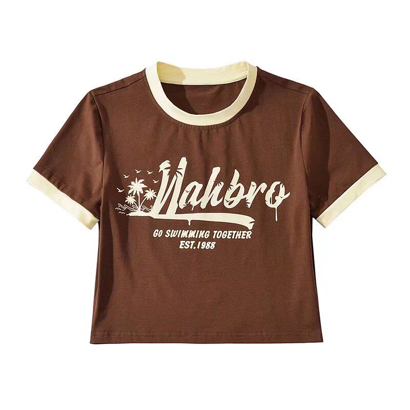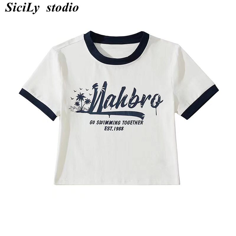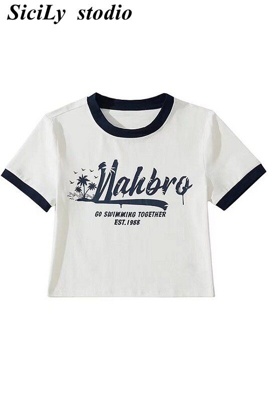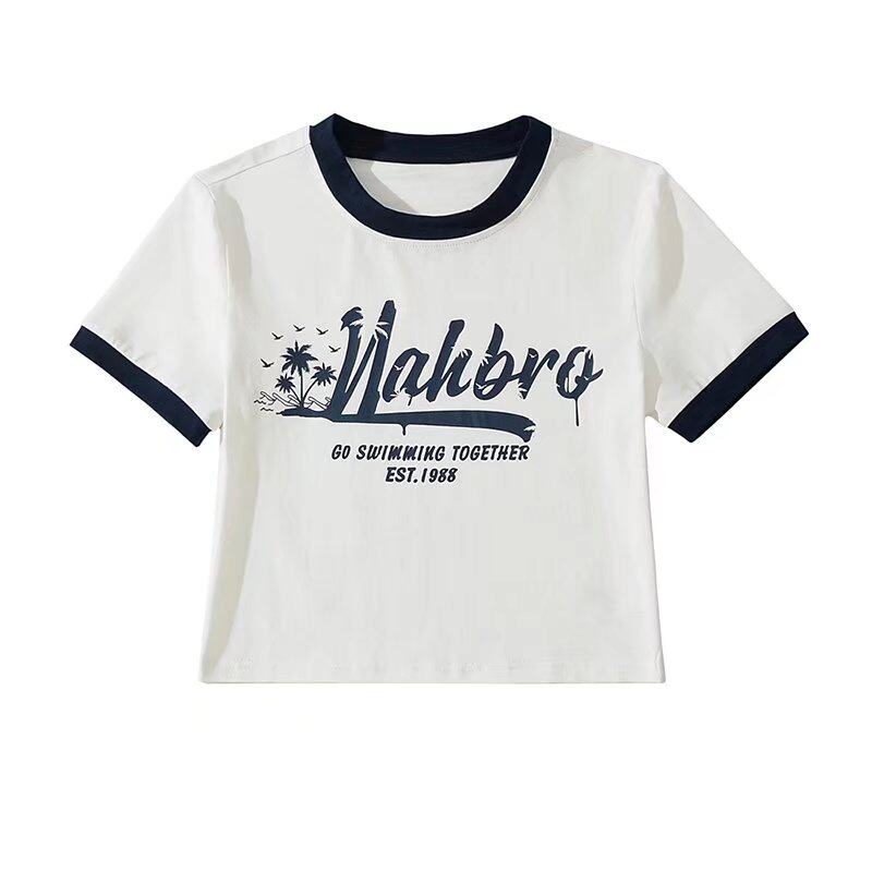 Ретро модная короткая футболка с коротким рукавом с круглым воротником, в американском стиле, облегающий крой