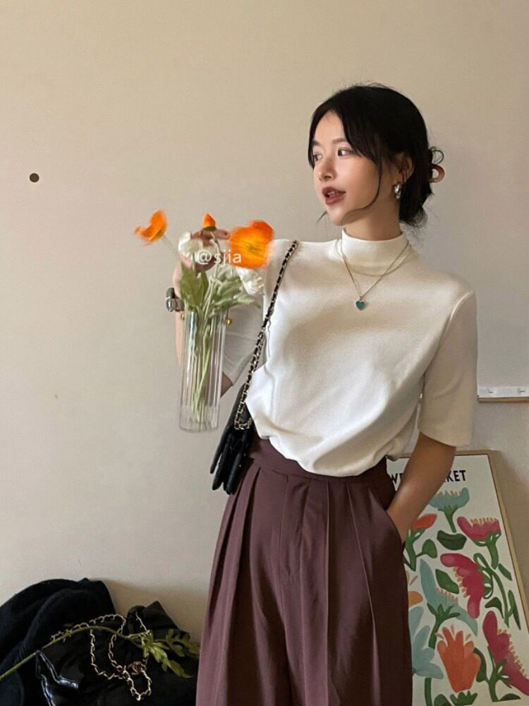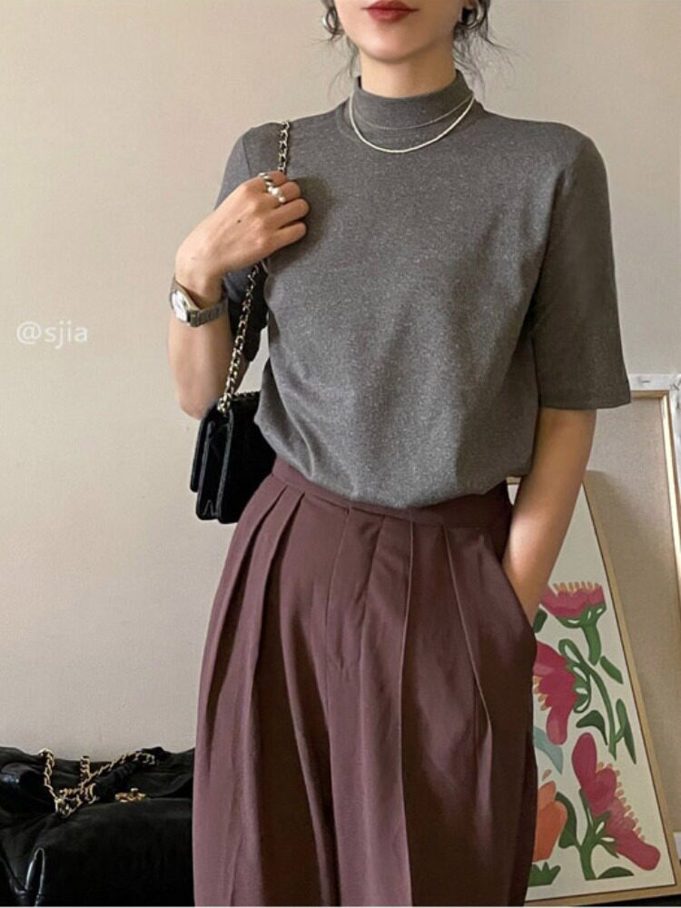 Осенняя базовая приятная телу футболка с коротким рукавом, коллекция 2023, высокий воротник, увеличенная толщина