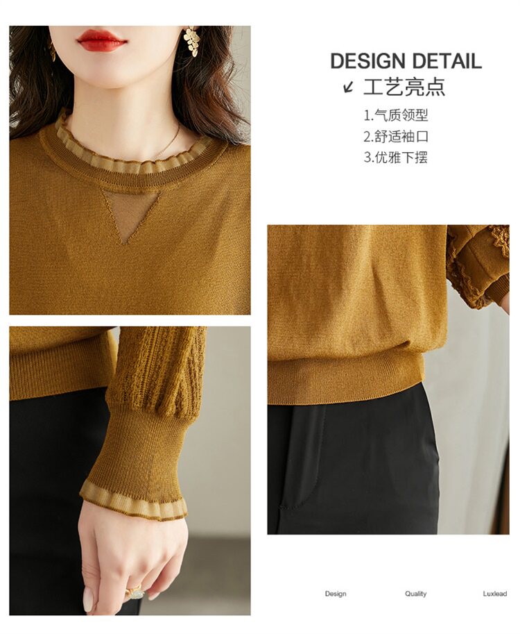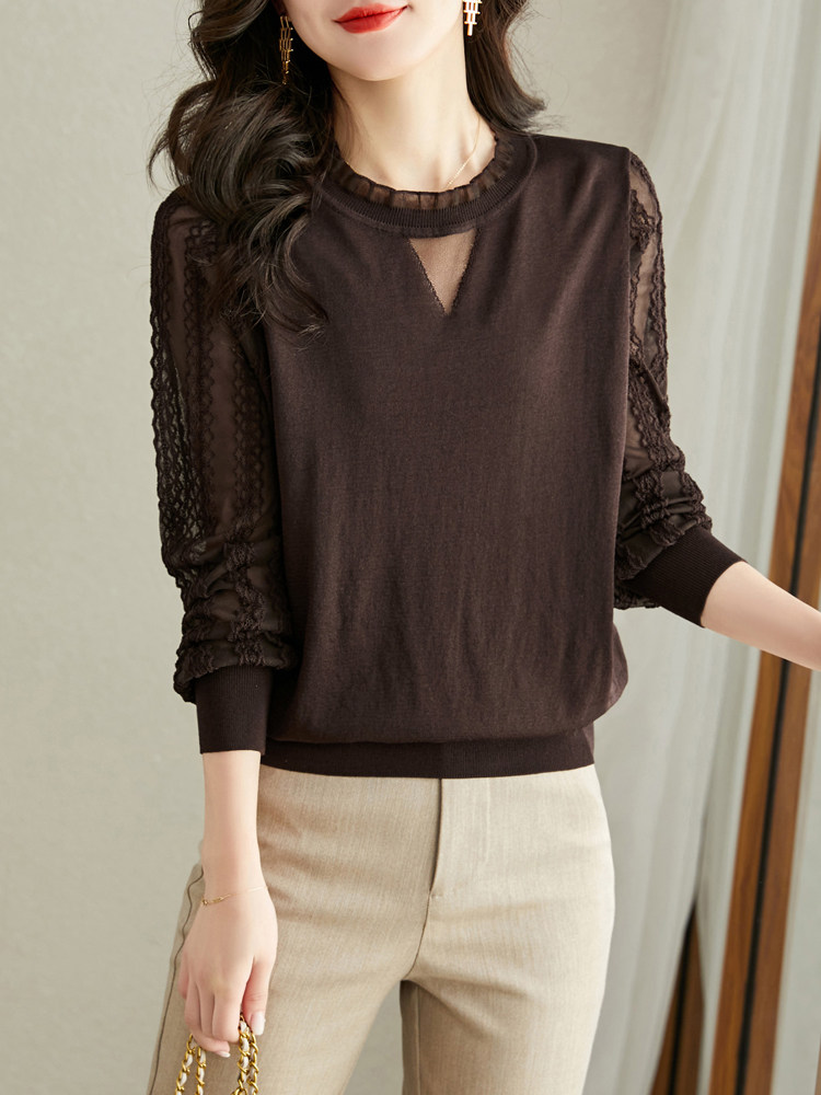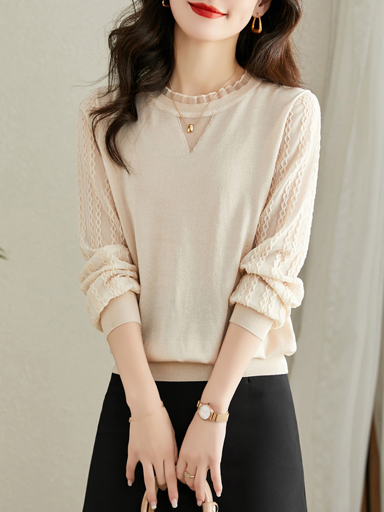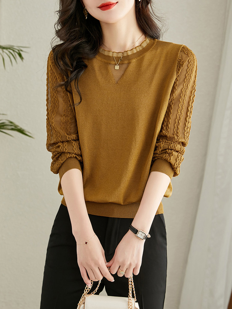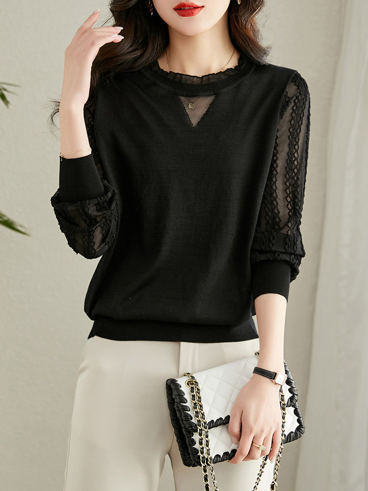 Трикотажный базовый приятный телу весенний кружевной лонгслив, в западном стиле