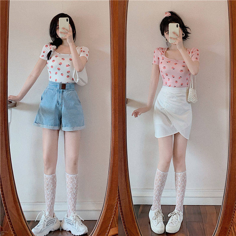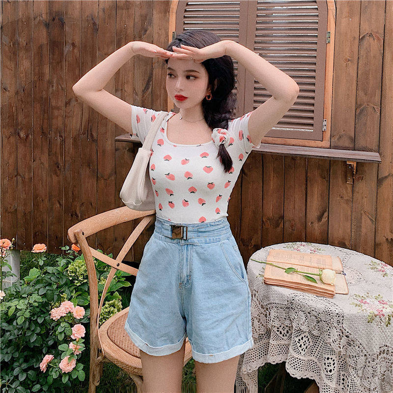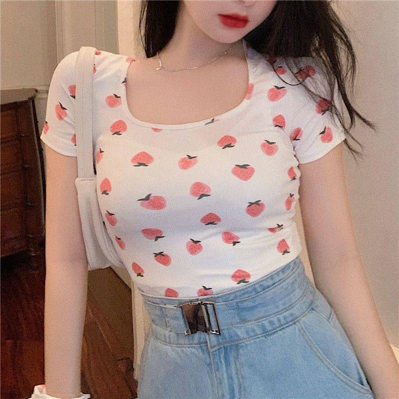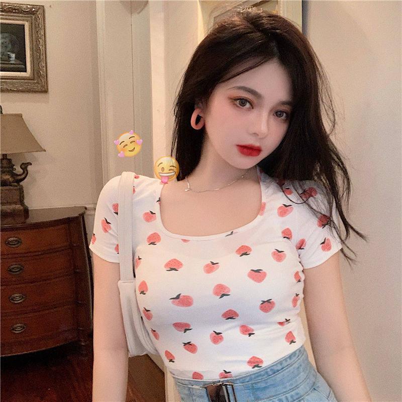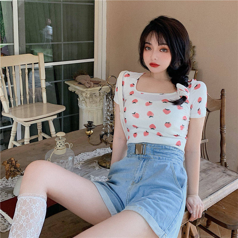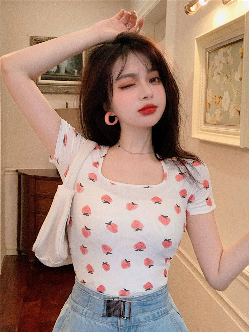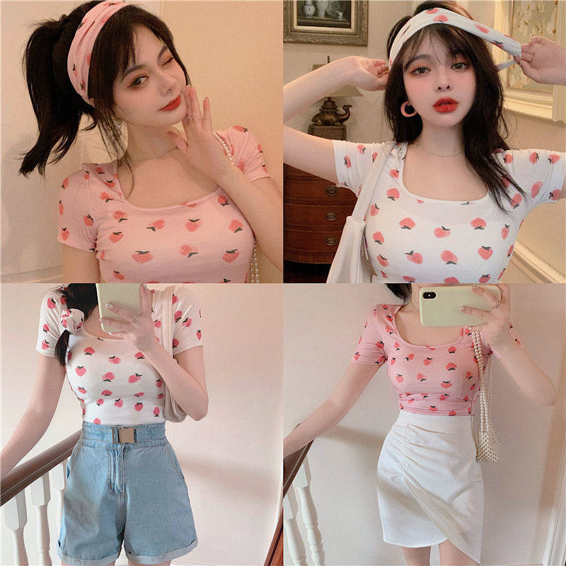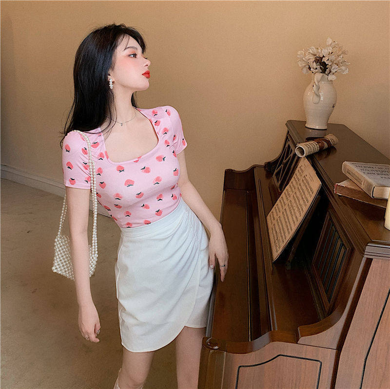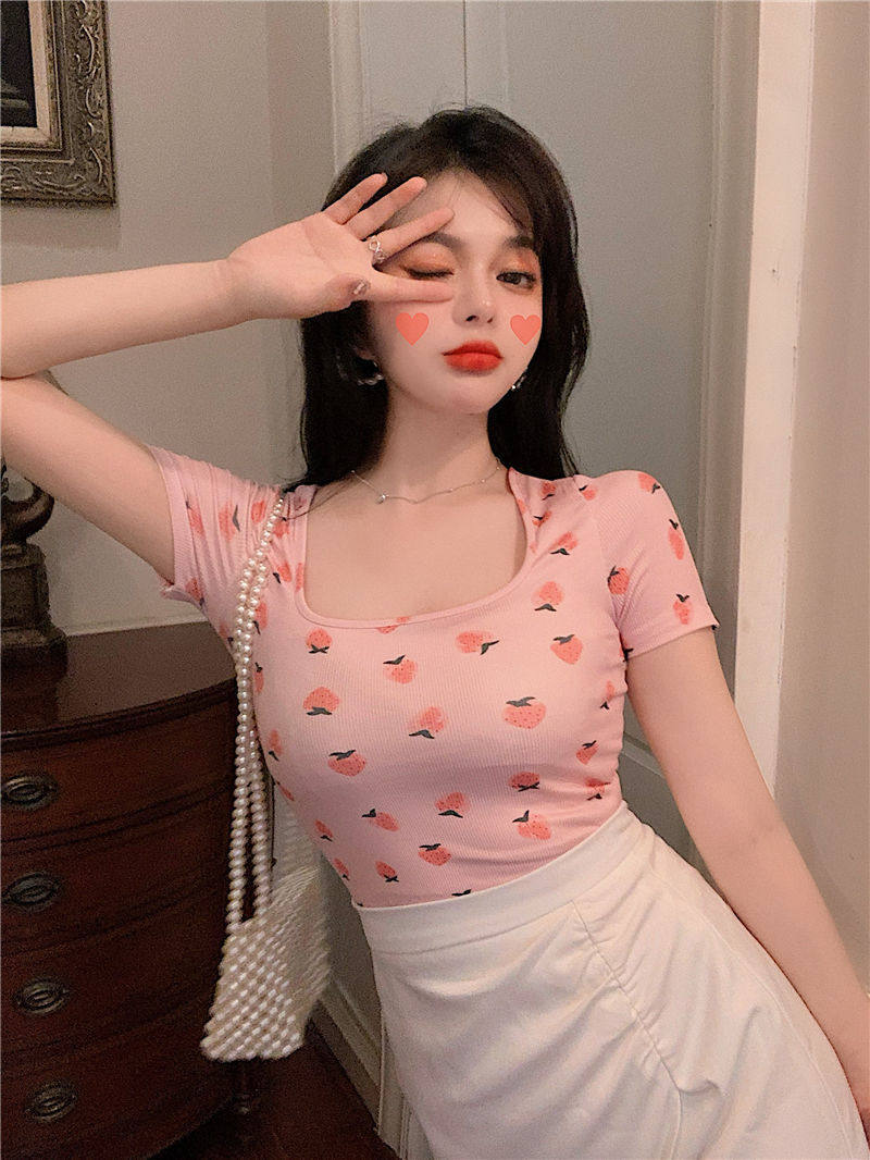 Сексуальная розовая короткая летняя футболка, квадратный вырез, короткий рукав, с рукавом
