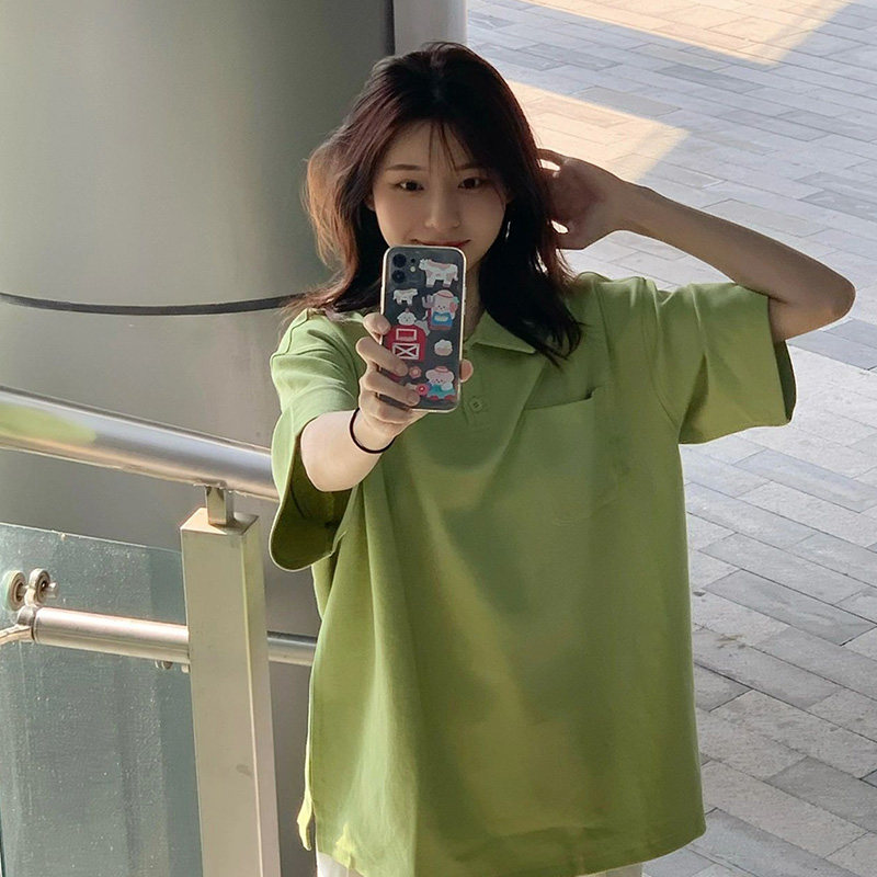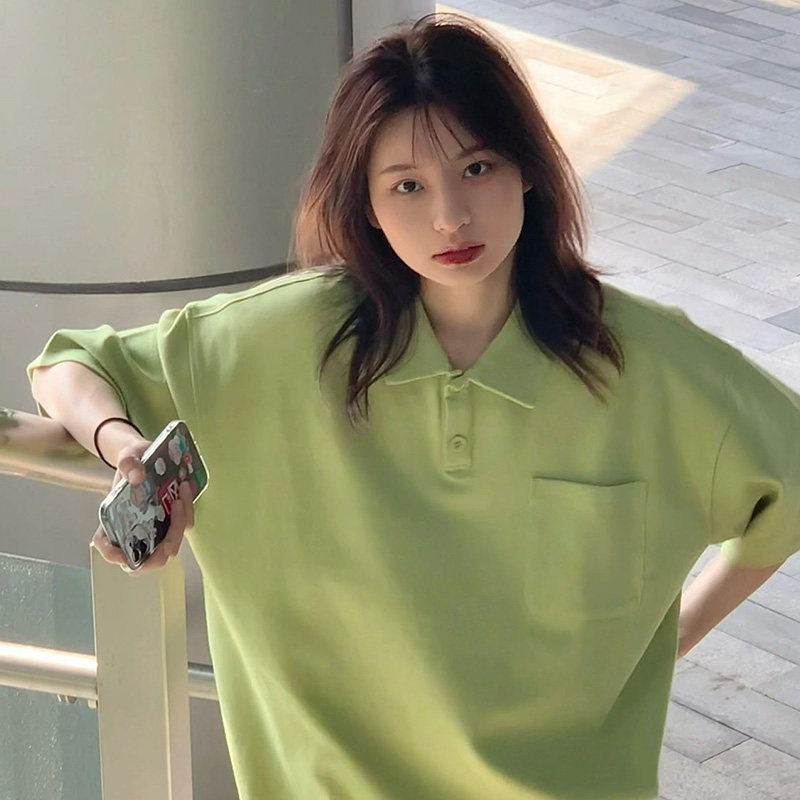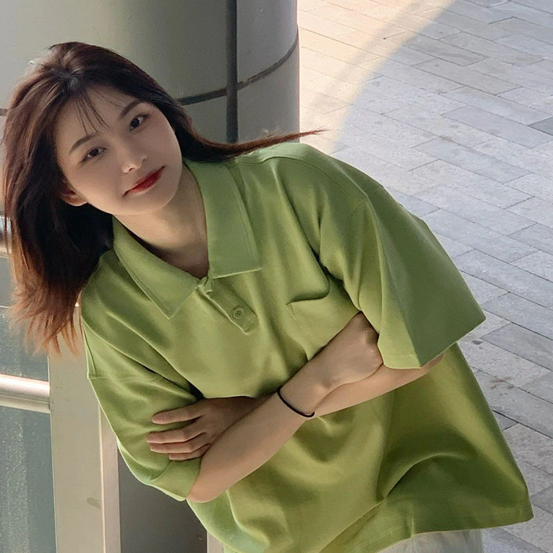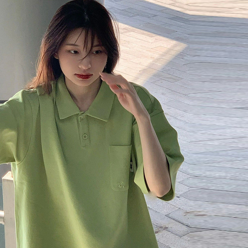 Зеленая летняя футболка, воротник поло, короткий рукав, свободный крой