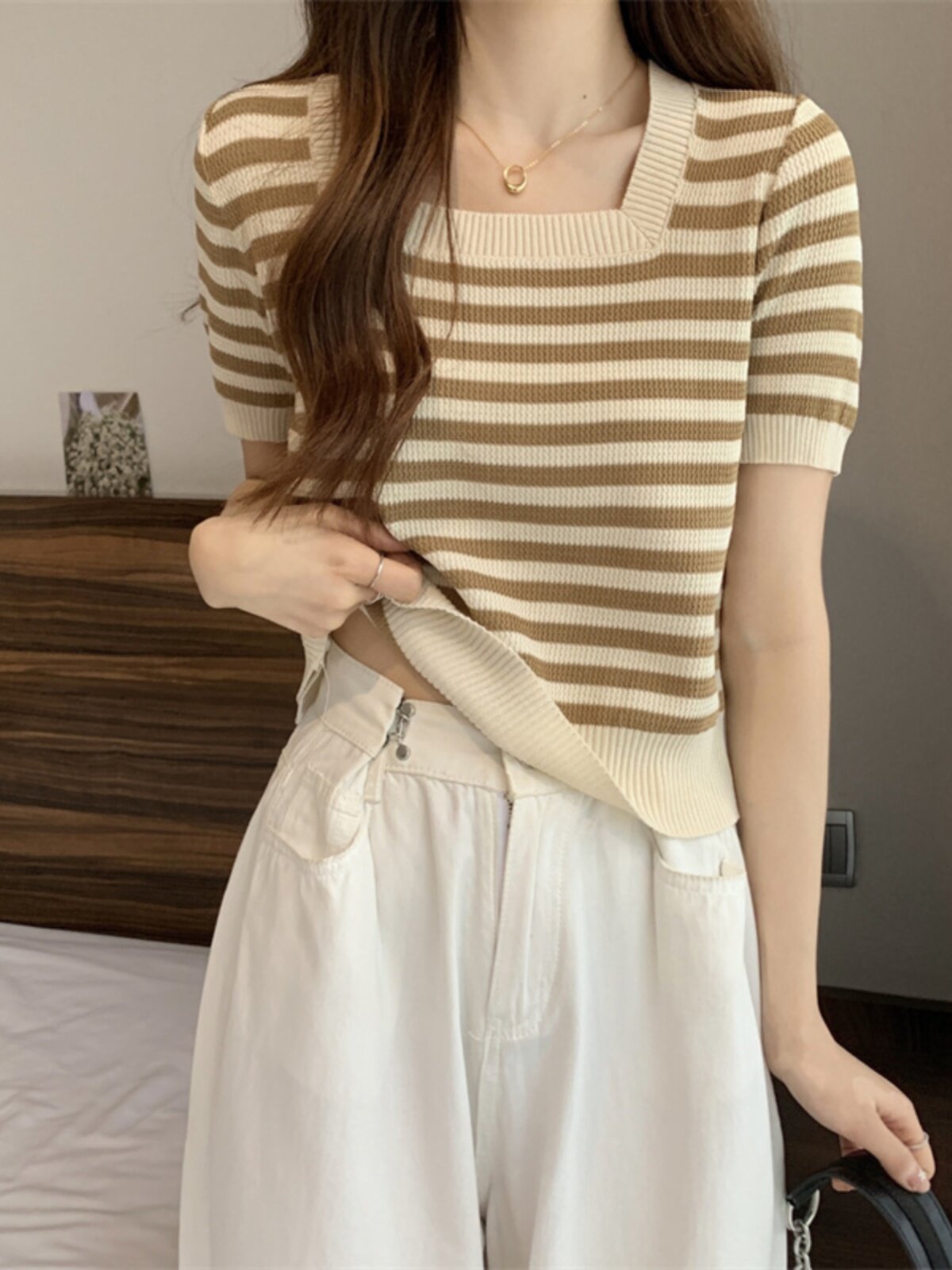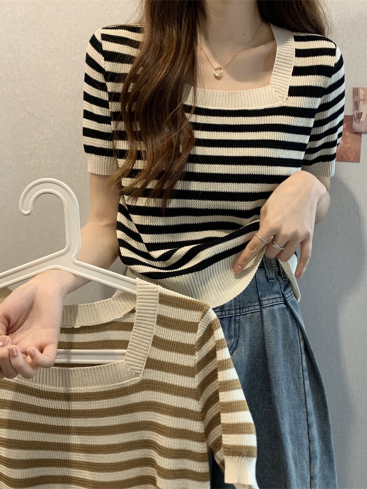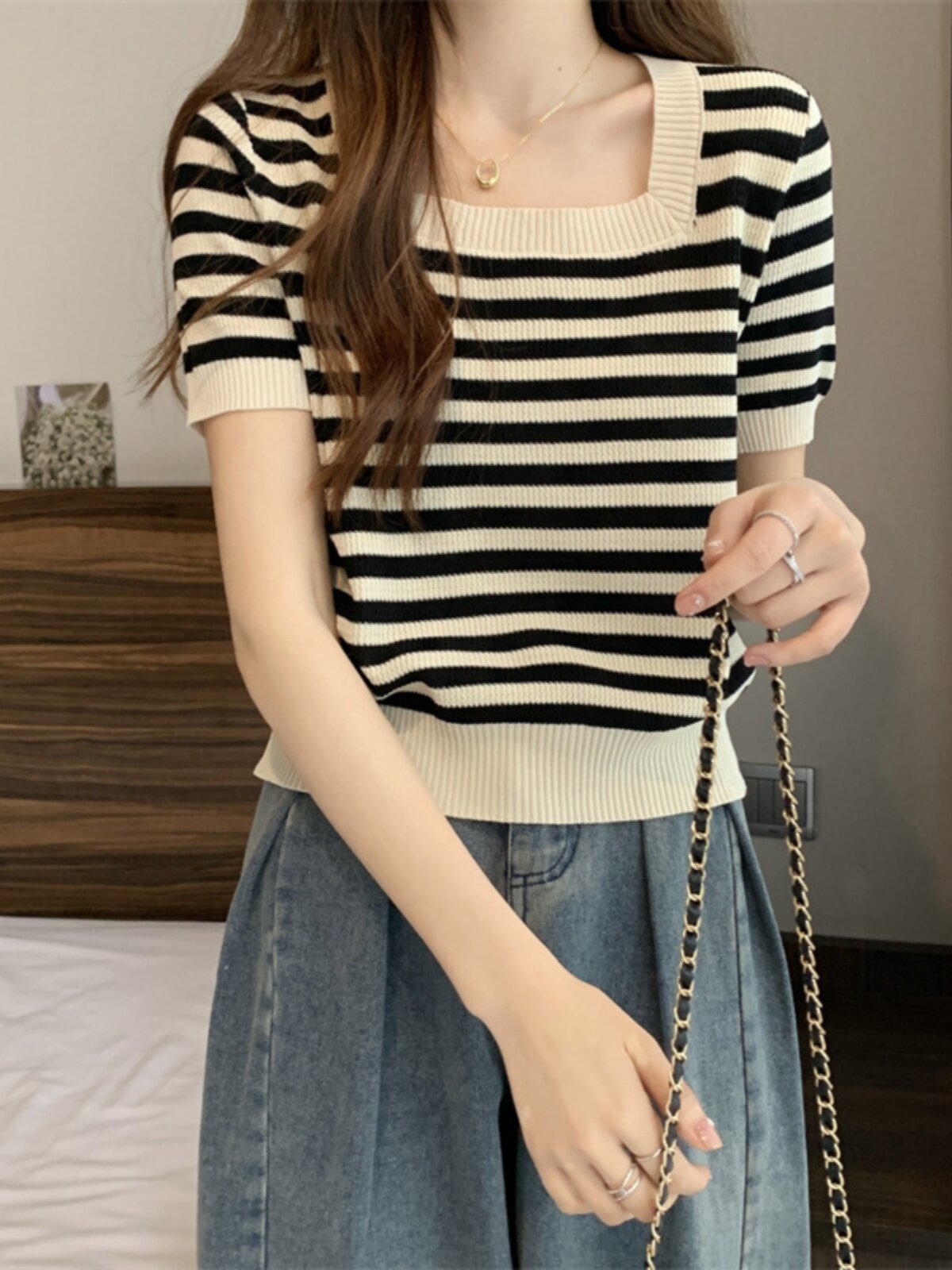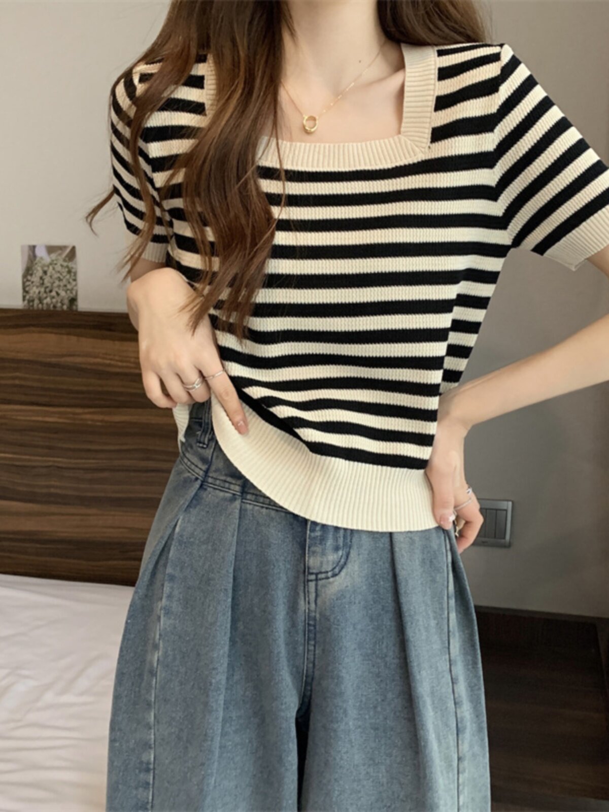 | Цвет: | Черные полосы [Гонконг со вкусом чикат ретро корейский вдохновение], Модная дизайнерская футболка, городской стиль, тренд сезона |