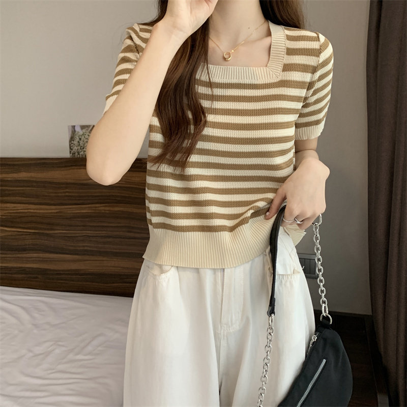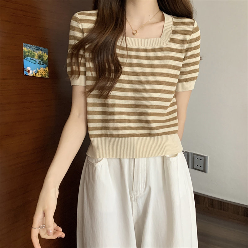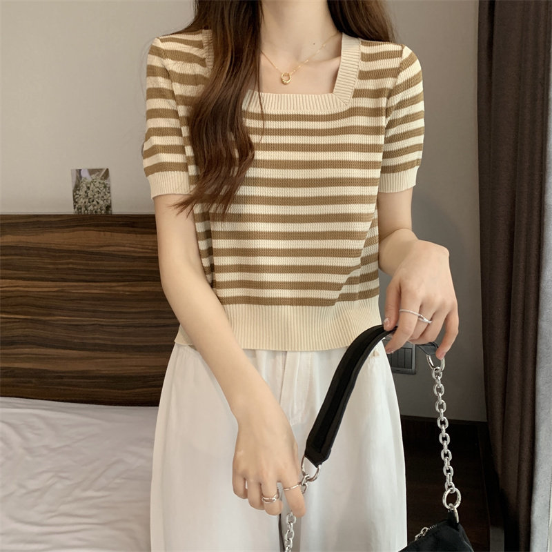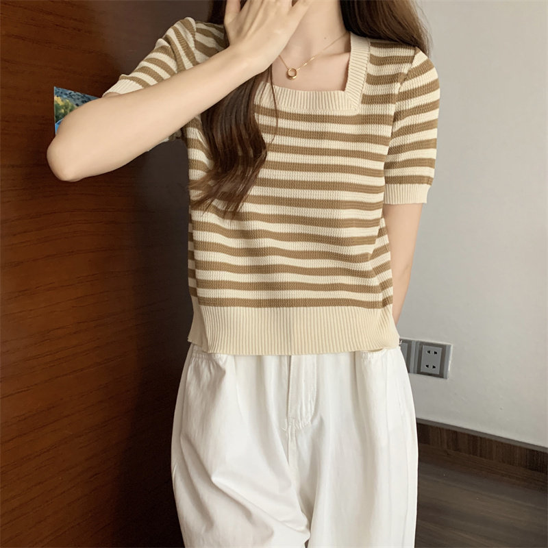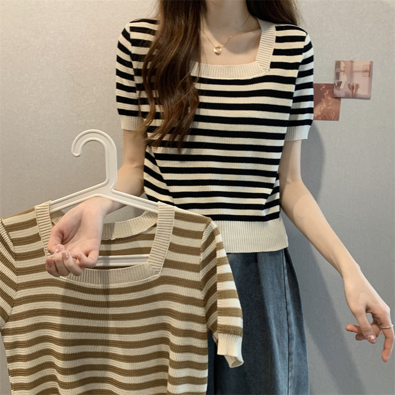 Шелковая летняя футболка с коротким рукавом, трикотажный свитер, большой размер, квадратный вырез