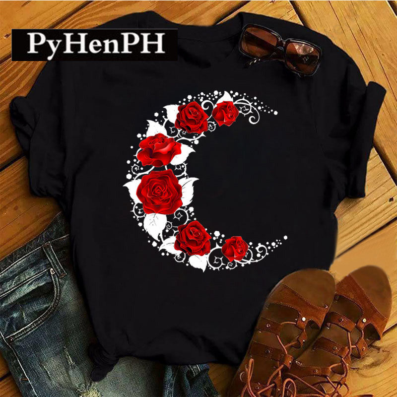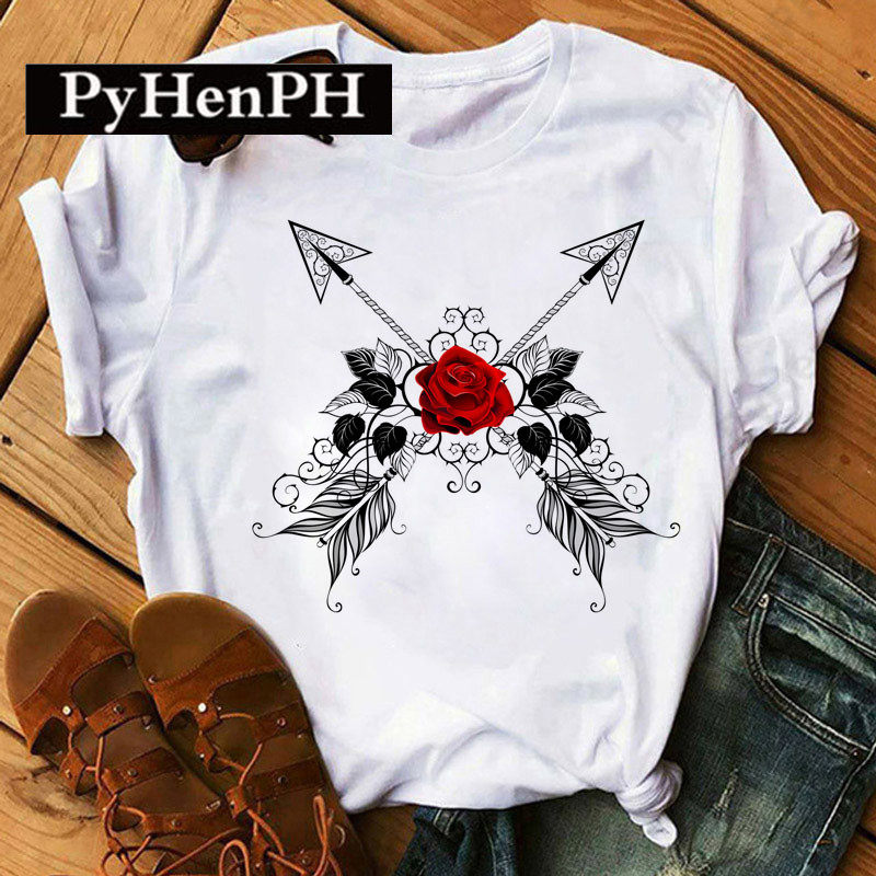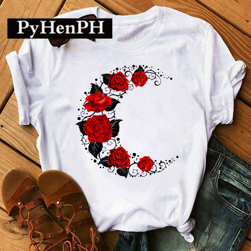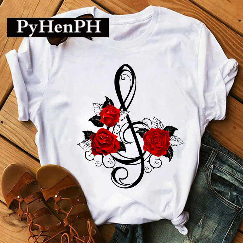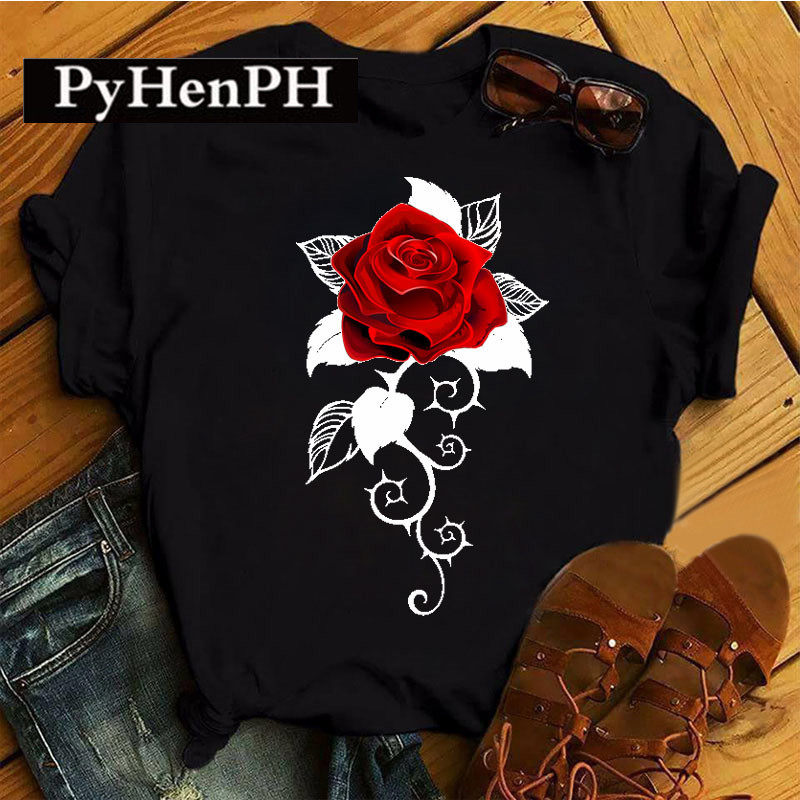 Красная розовая футболка футболка европейская и американская красная роза ноты короткие
