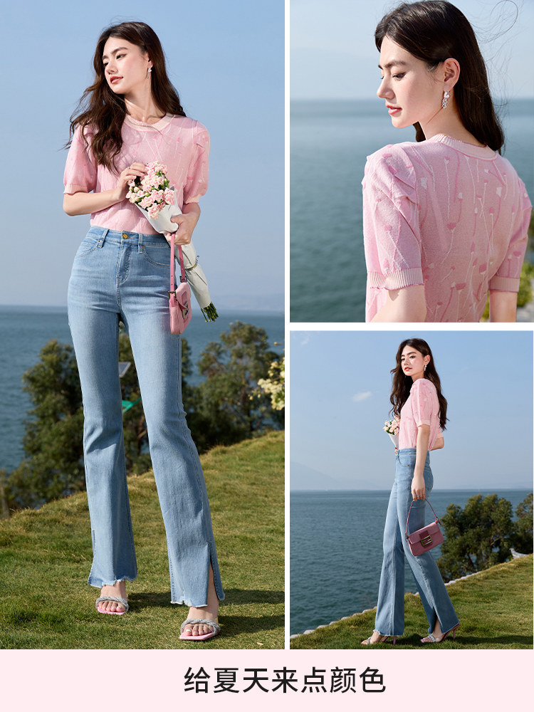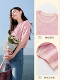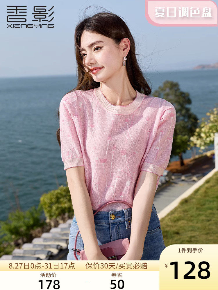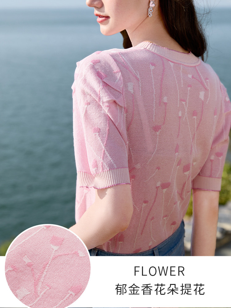 Трикотажная футболка, летняя дизайнерская розовая летняя одежда, короткий рукав, тренд сезона, с вышивкой, рукава фонарики