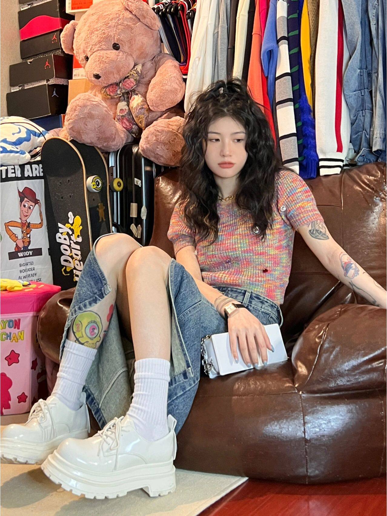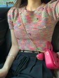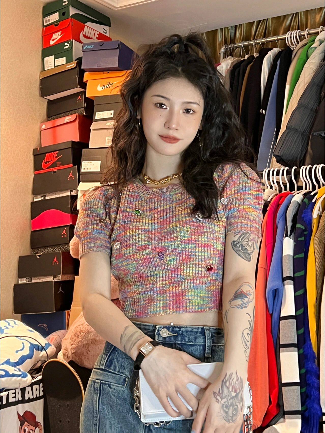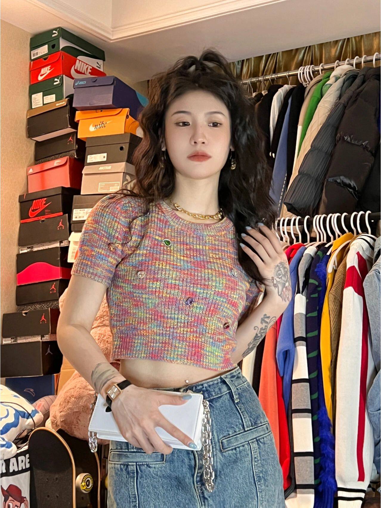 Дизайнерская радужная трикотажная короткая летняя футболка с коротким рукавом, тренд сезона