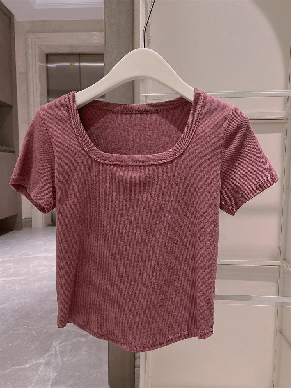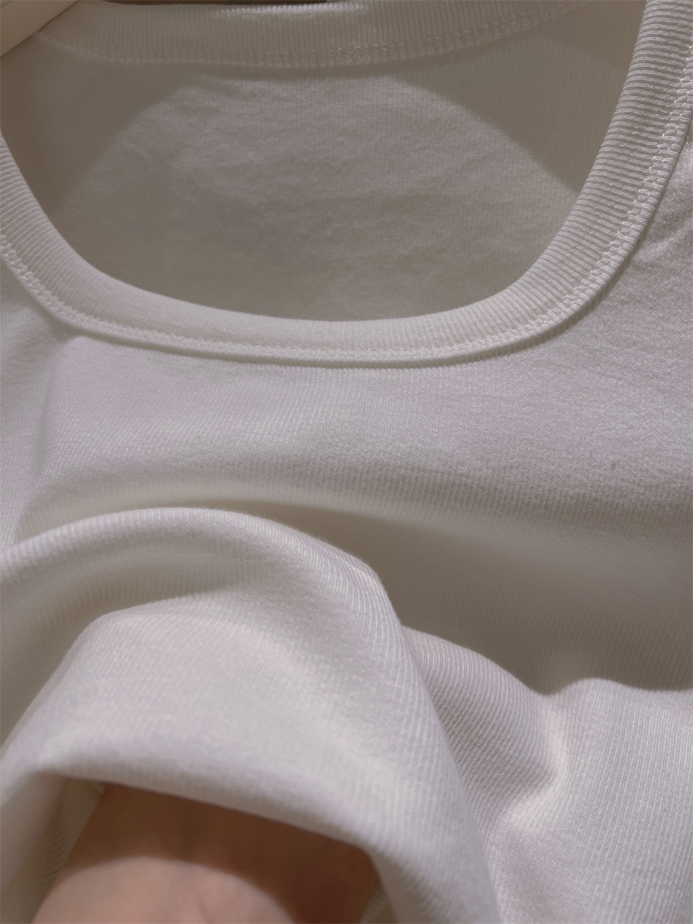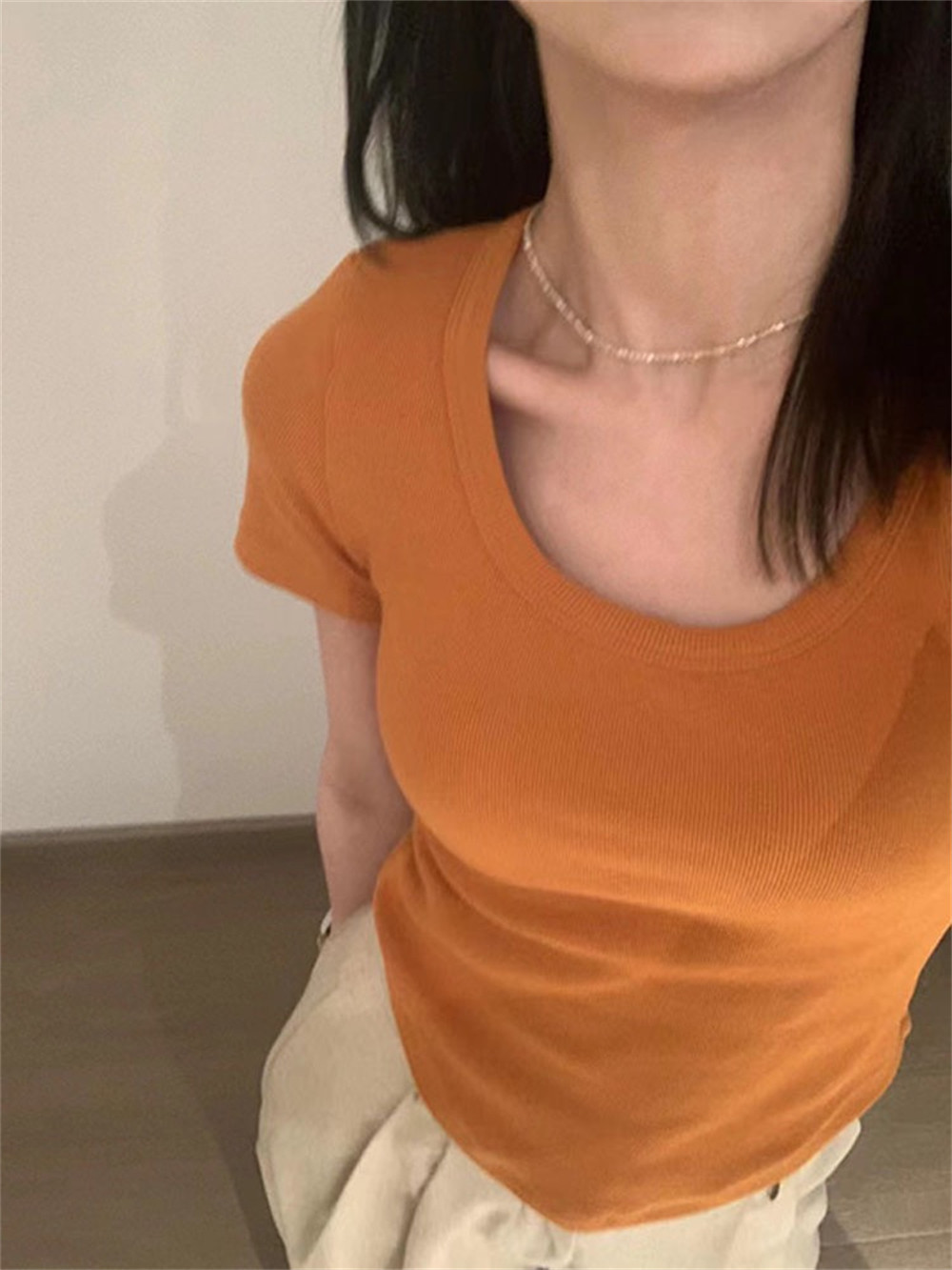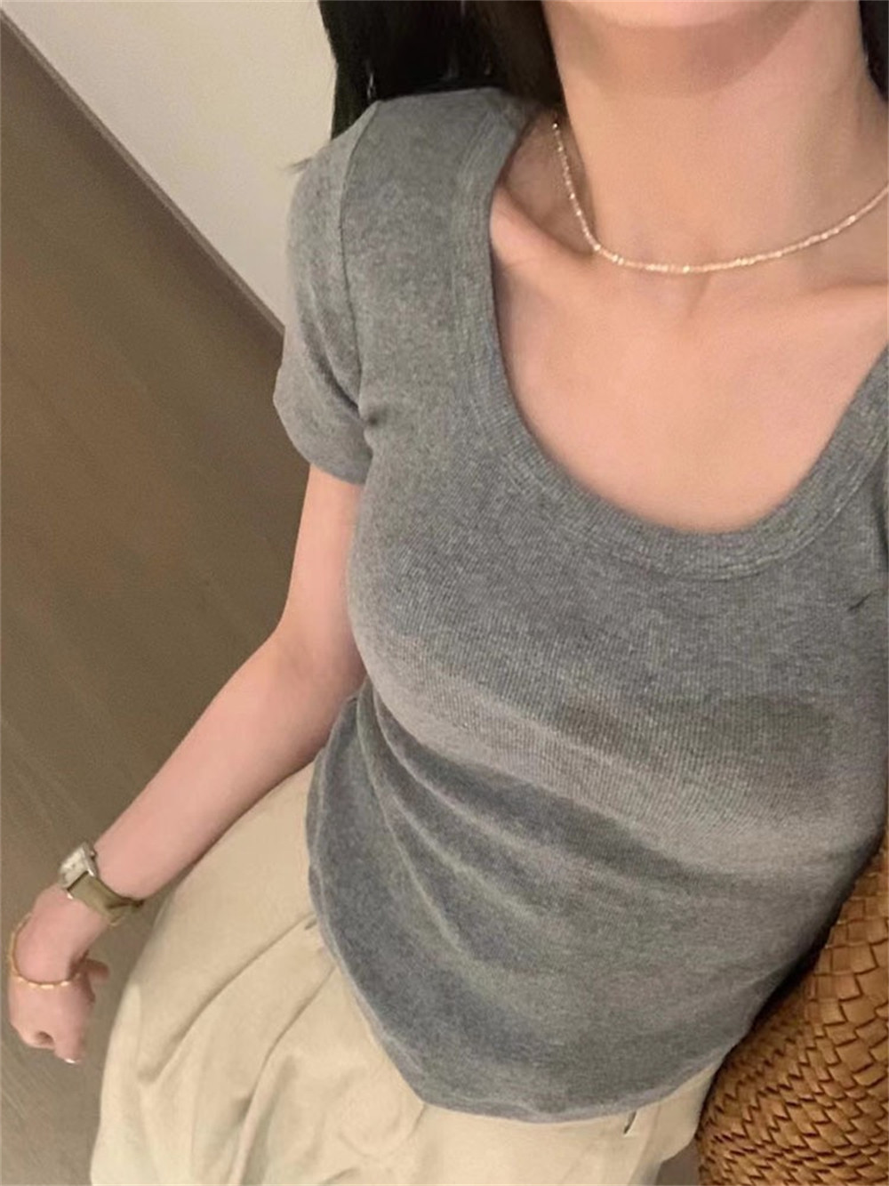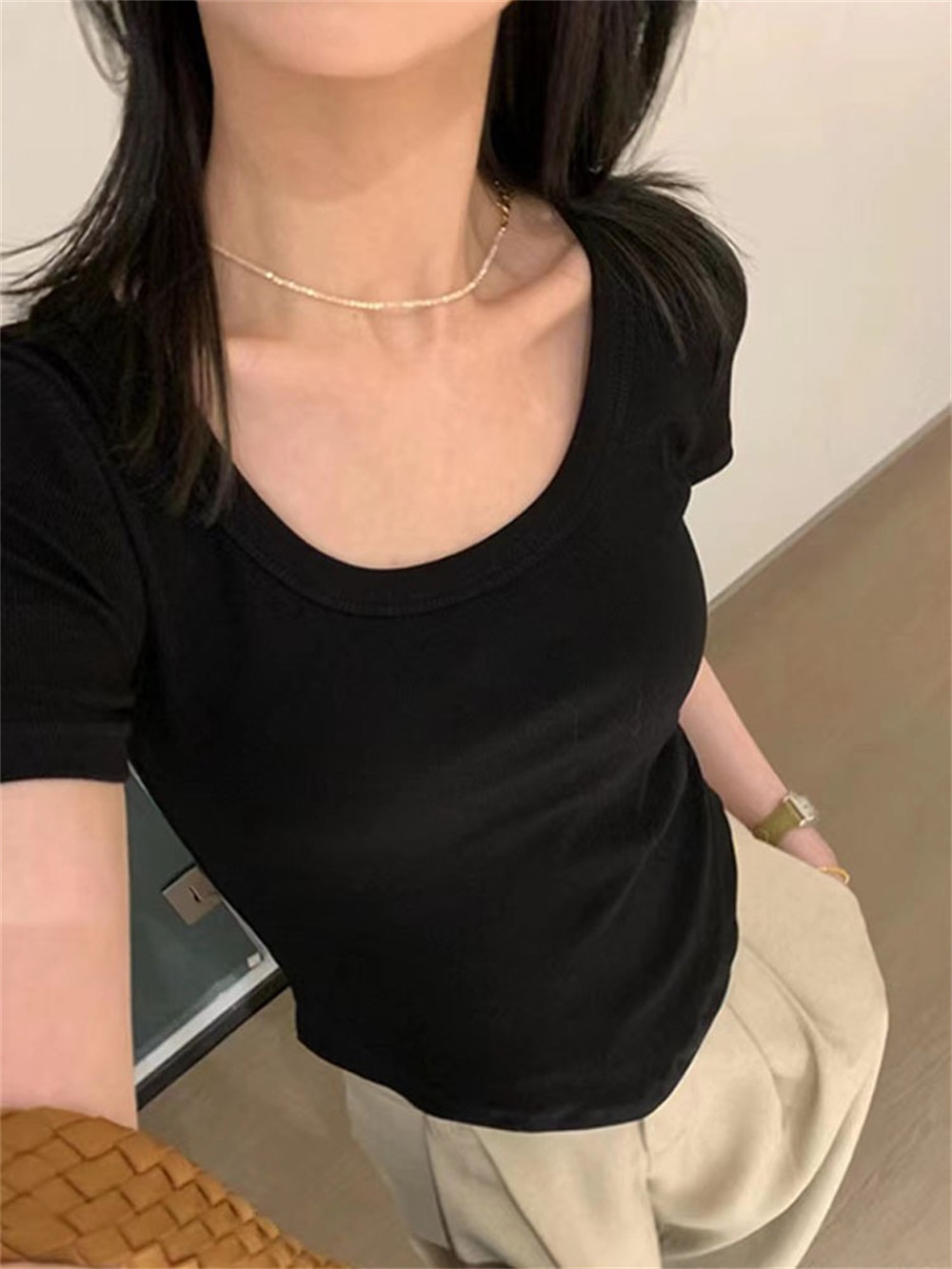 Реальный снимок◆Miss Rie ~ Футболка из чистого хлопка с открытыми правыми плечами, квадратным вырезом и современным стилем, однотонная однотонная футболка с дугообразным краем.