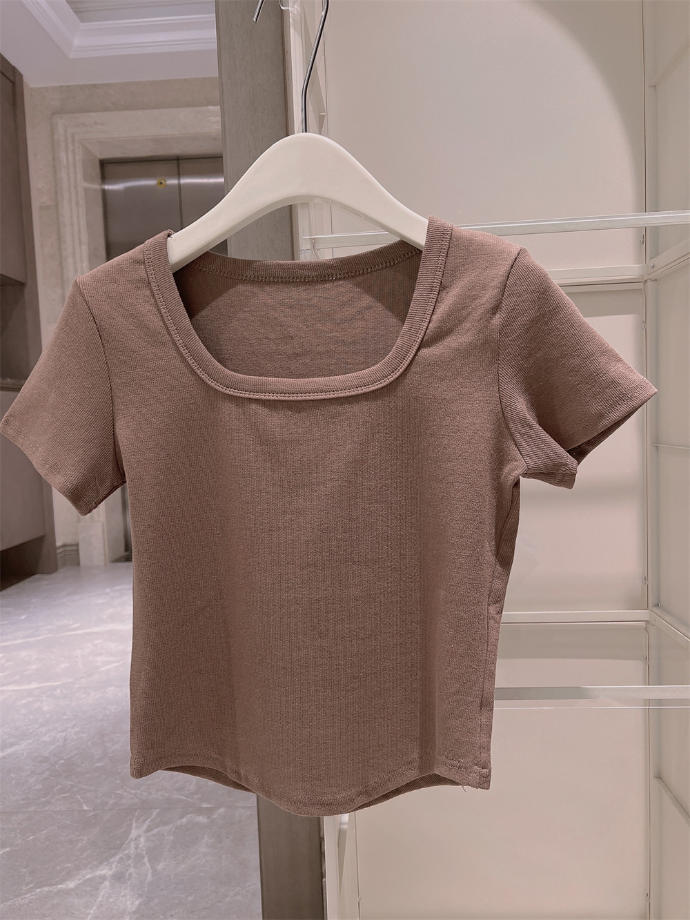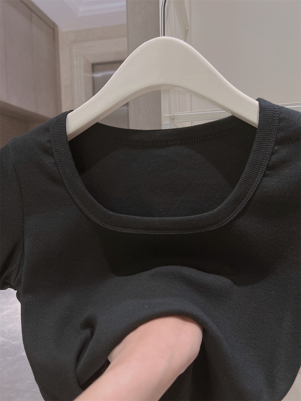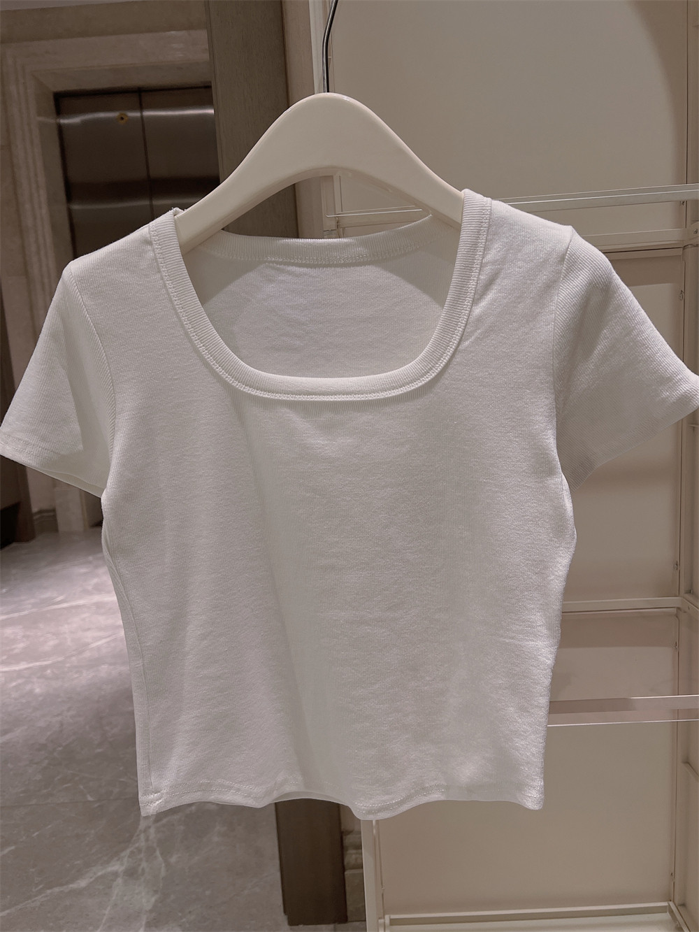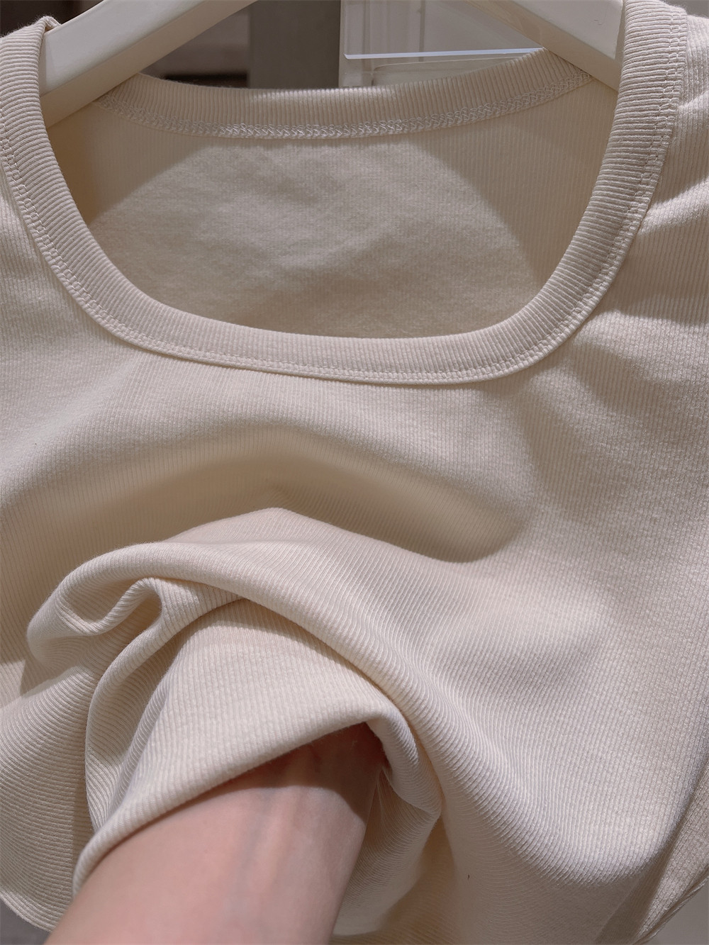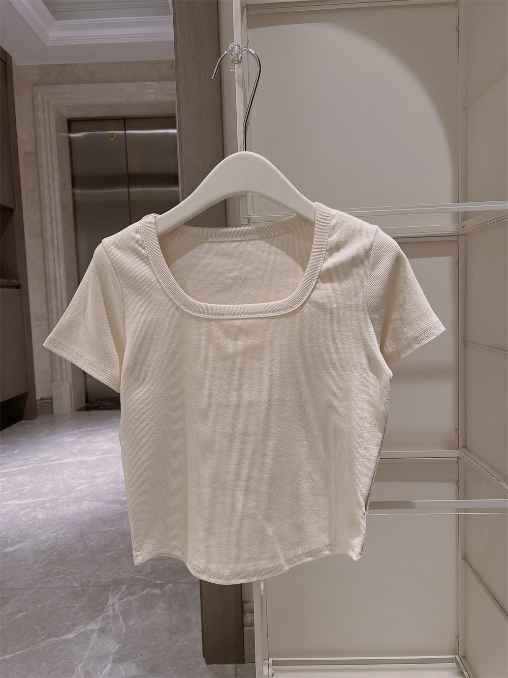 Реальный снимок◆Miss Rie ~ Футболка из чистого хлопка с открытыми правыми плечами, квадратным вырезом и современным стилем, однотонная однотонная футболка с дугообразным краем.